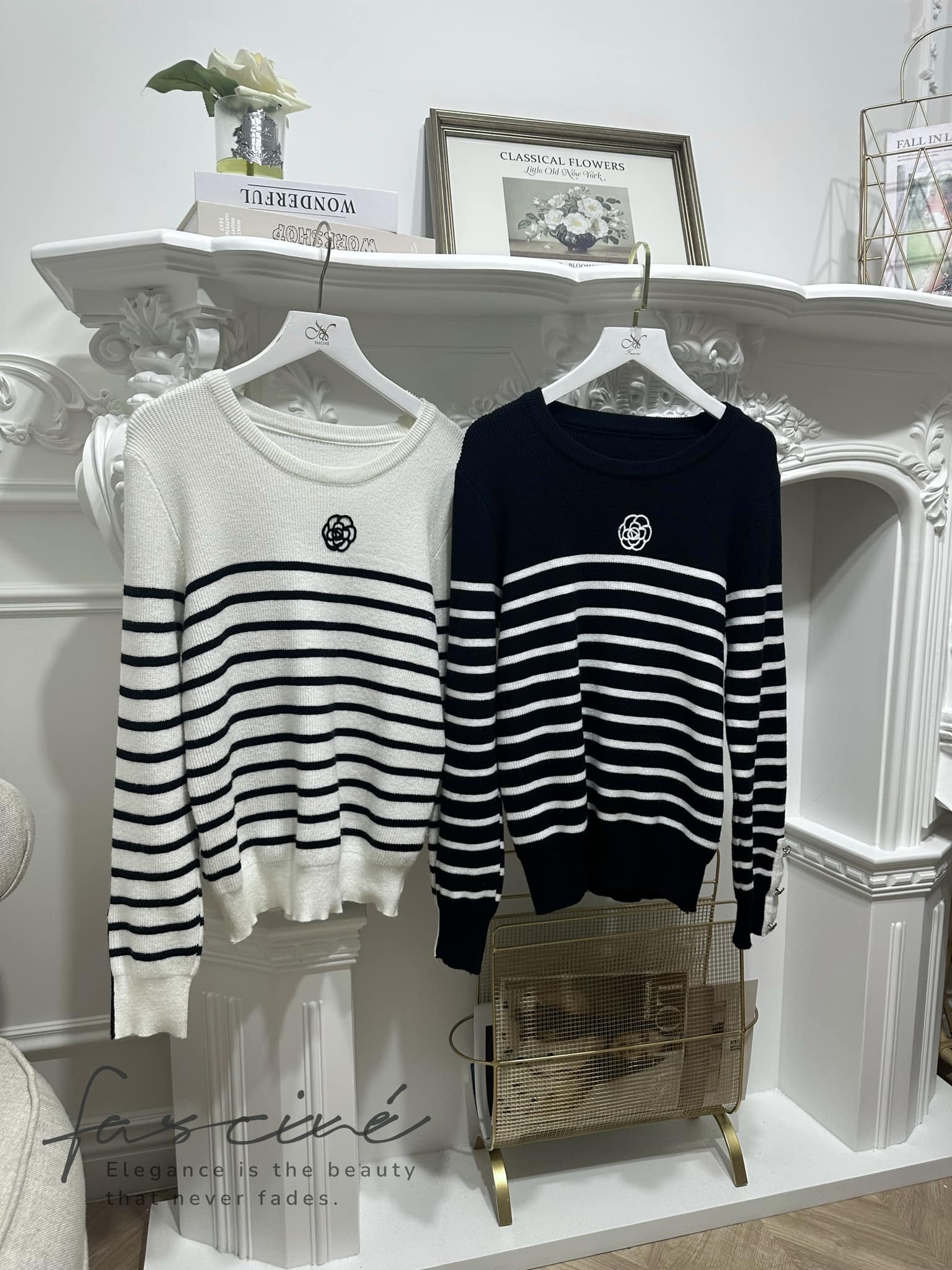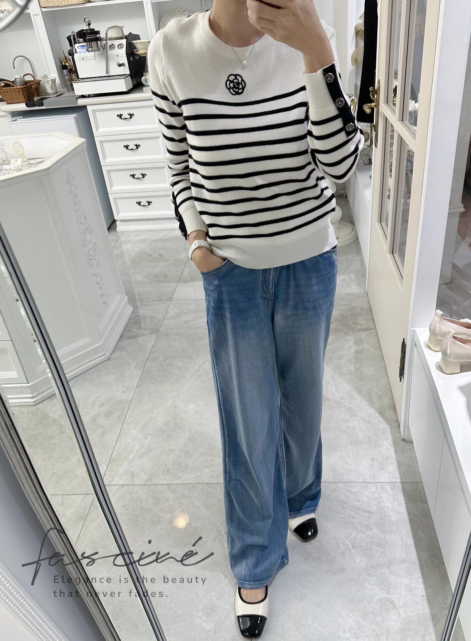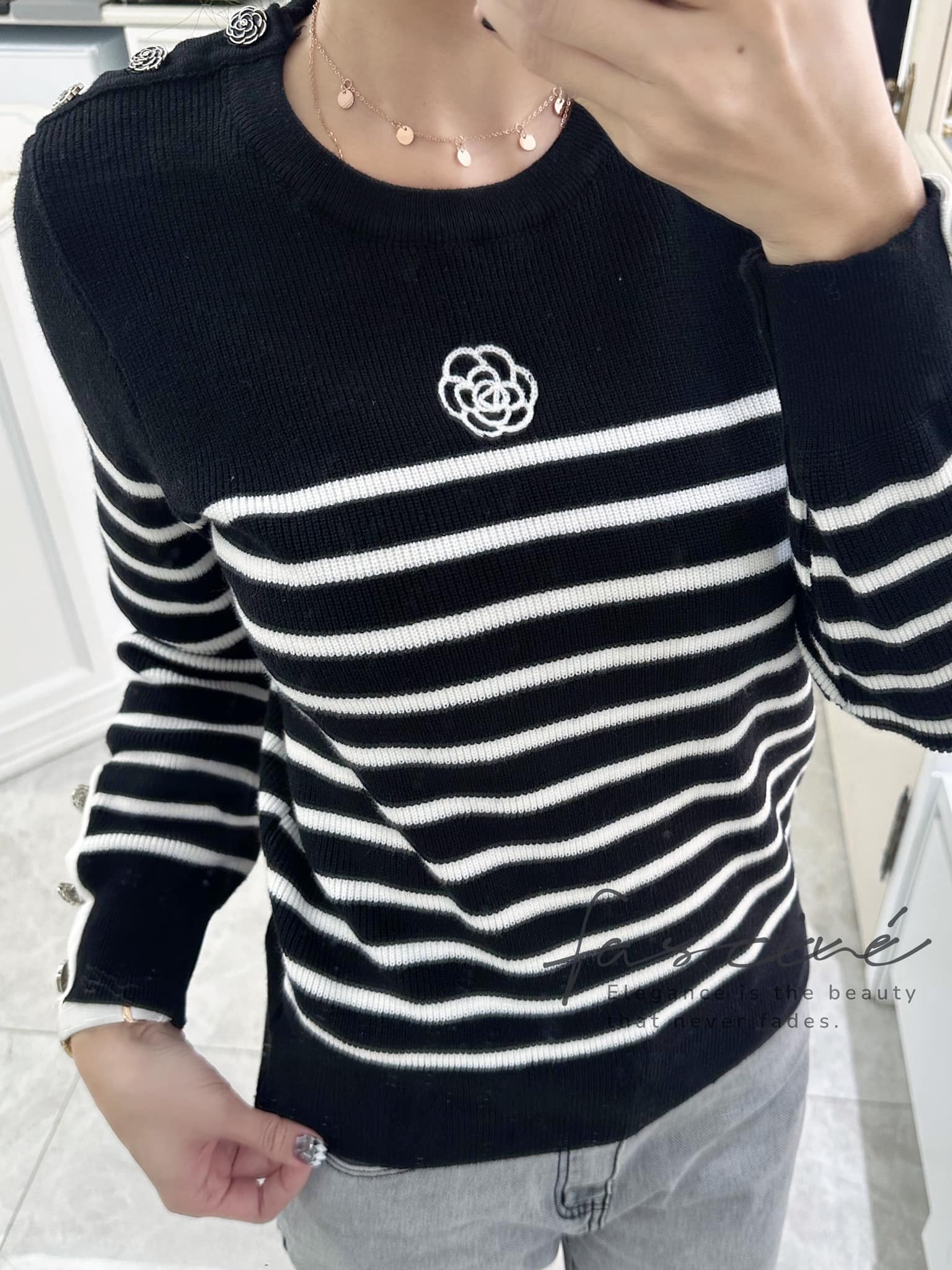 (03T08-25) 法式山茶花刺繡肩釦條紋氣質百搭針織上衣