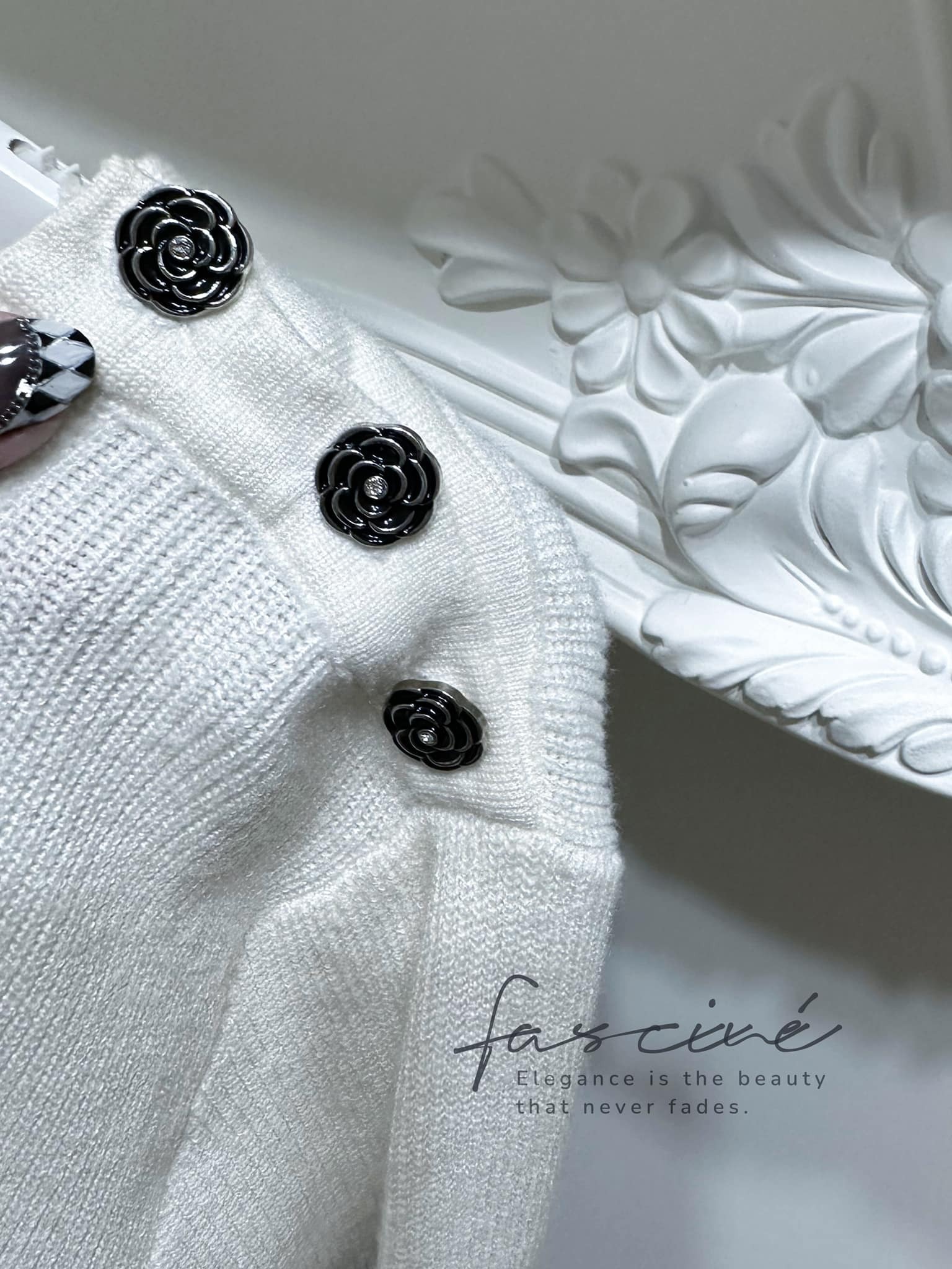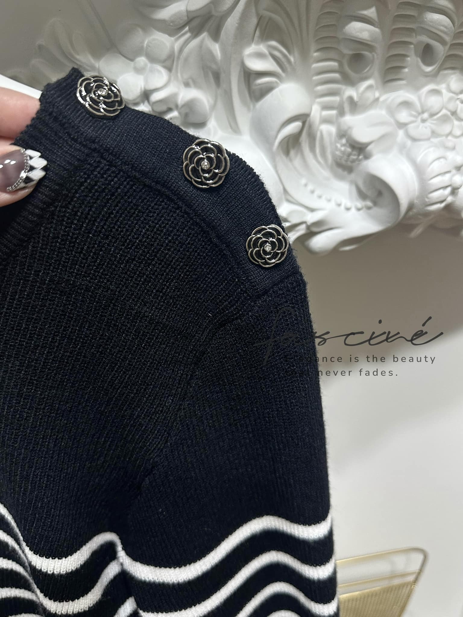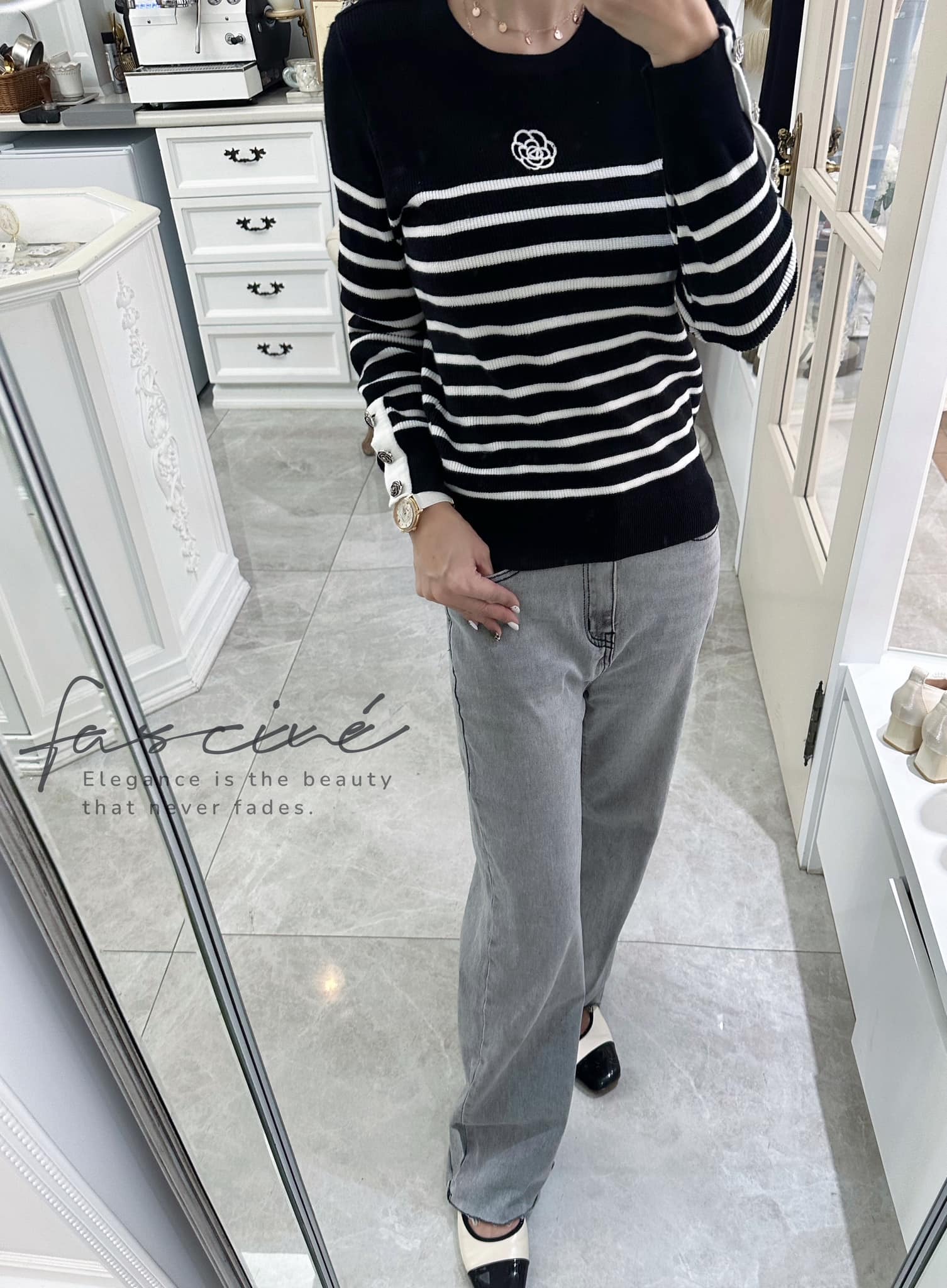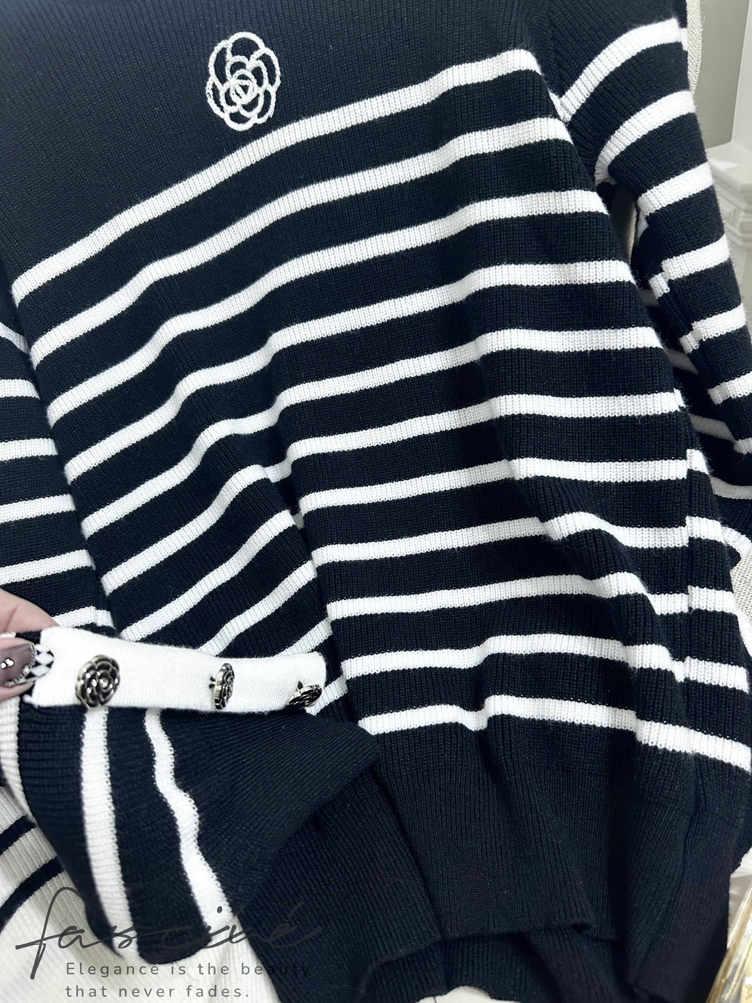 (03T08-25) 法式山茶花刺繡肩釦條紋氣質百搭針織上衣