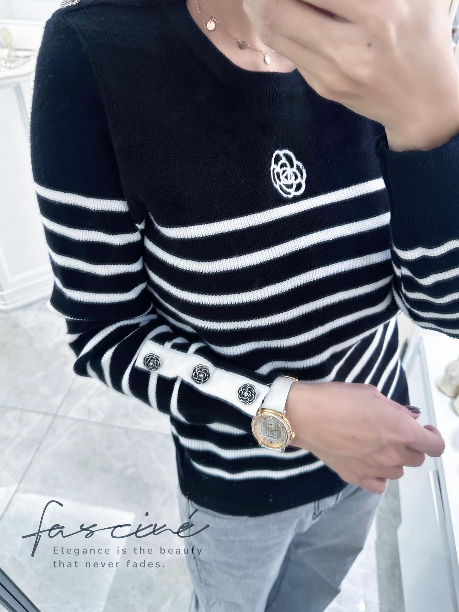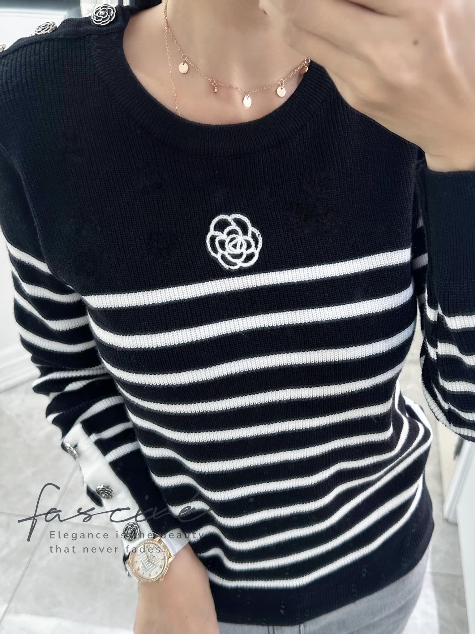 法式山茶花刺繡肩釦條紋氣質百搭針織上衣