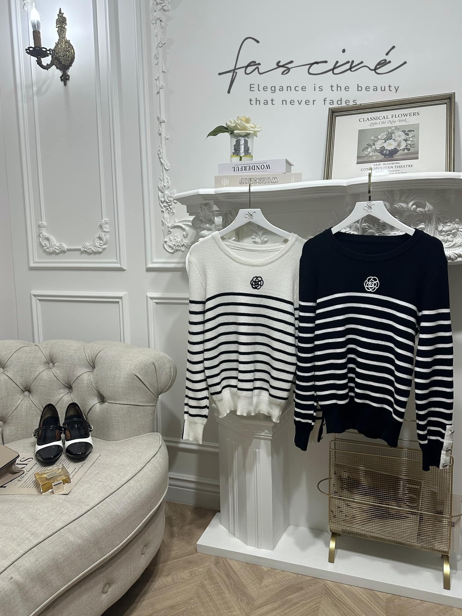 ,這款上衣,低調卻充滿細節感,針織面料恰到好處的修身剪裁,勾勒出優雅輪廓,肩部金屬釦與胸前山茶花刺繡設計,為整體增添精緻與層次感,讓簡單的條紋也能散發迷人魅力,不論搭配高腰長褲、牛仔褲,還是半身裙都能營造出輕鬆有品味的優雅法式日常❤️