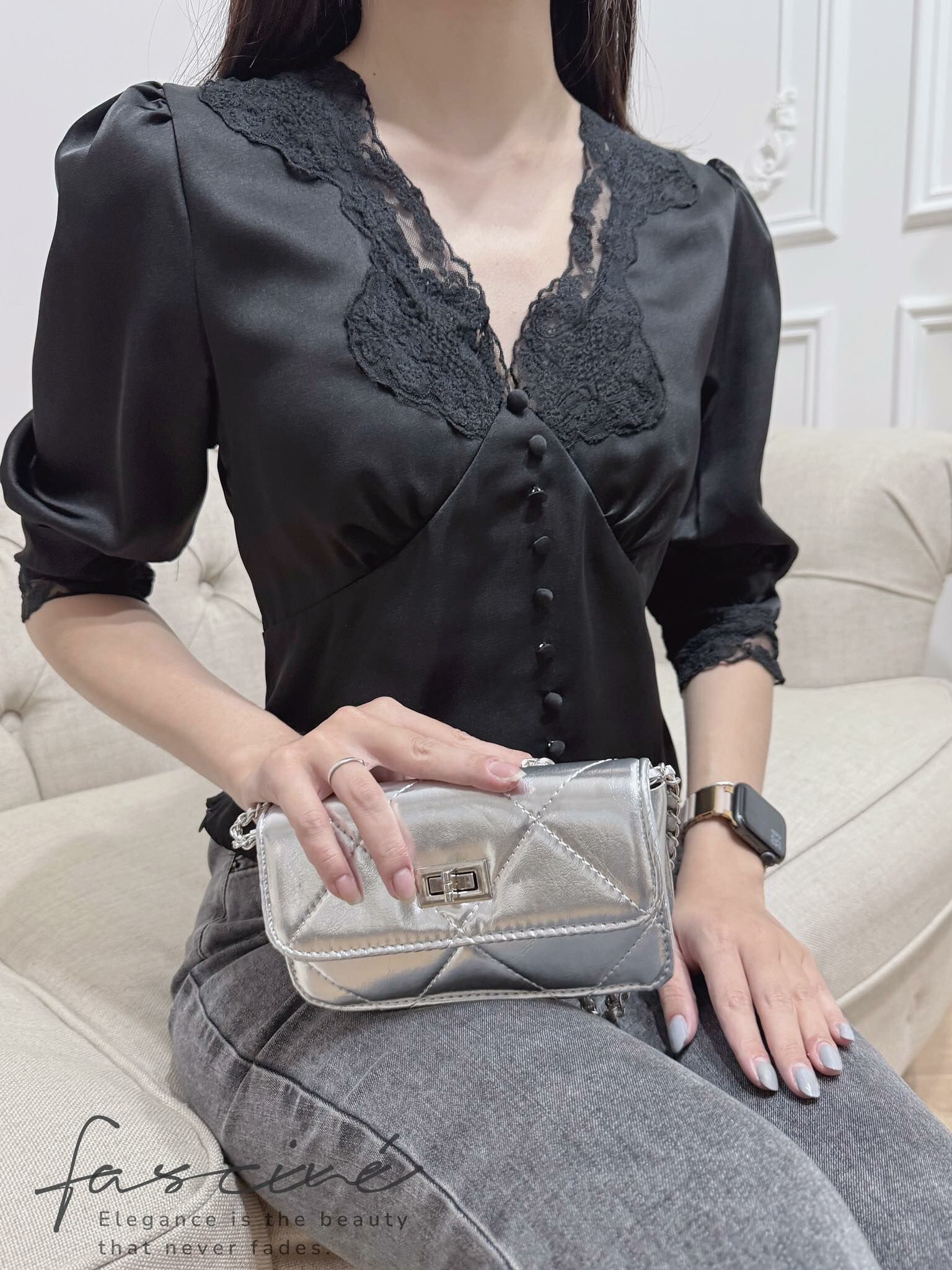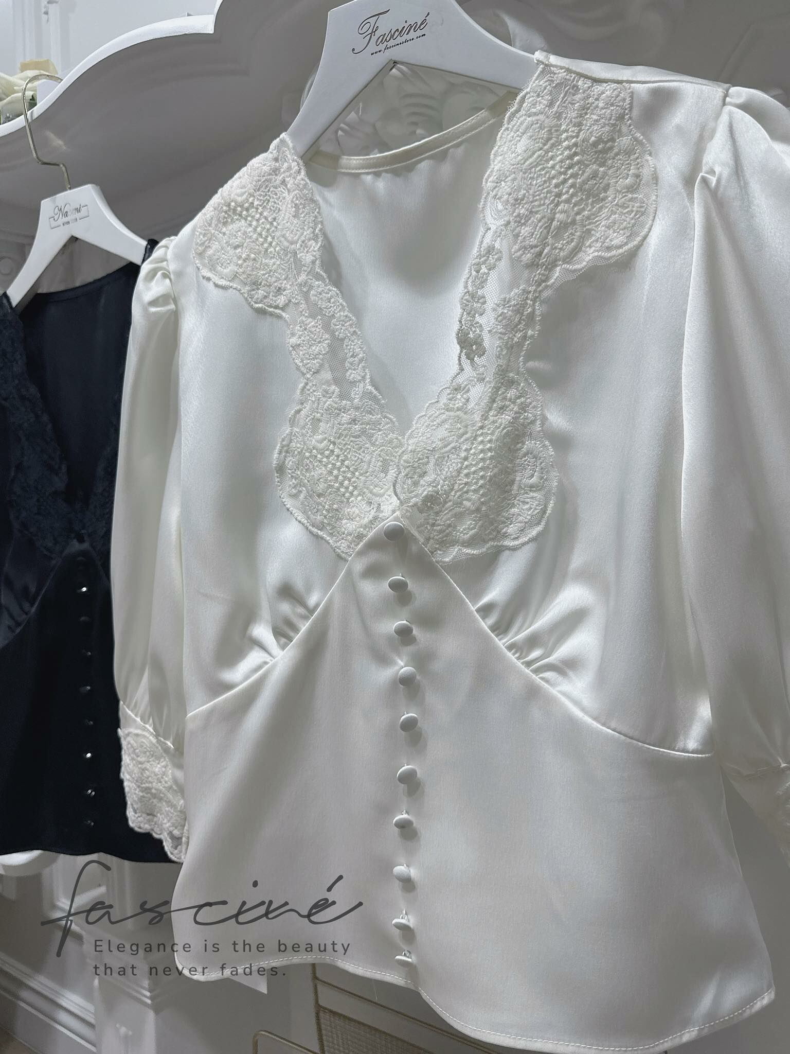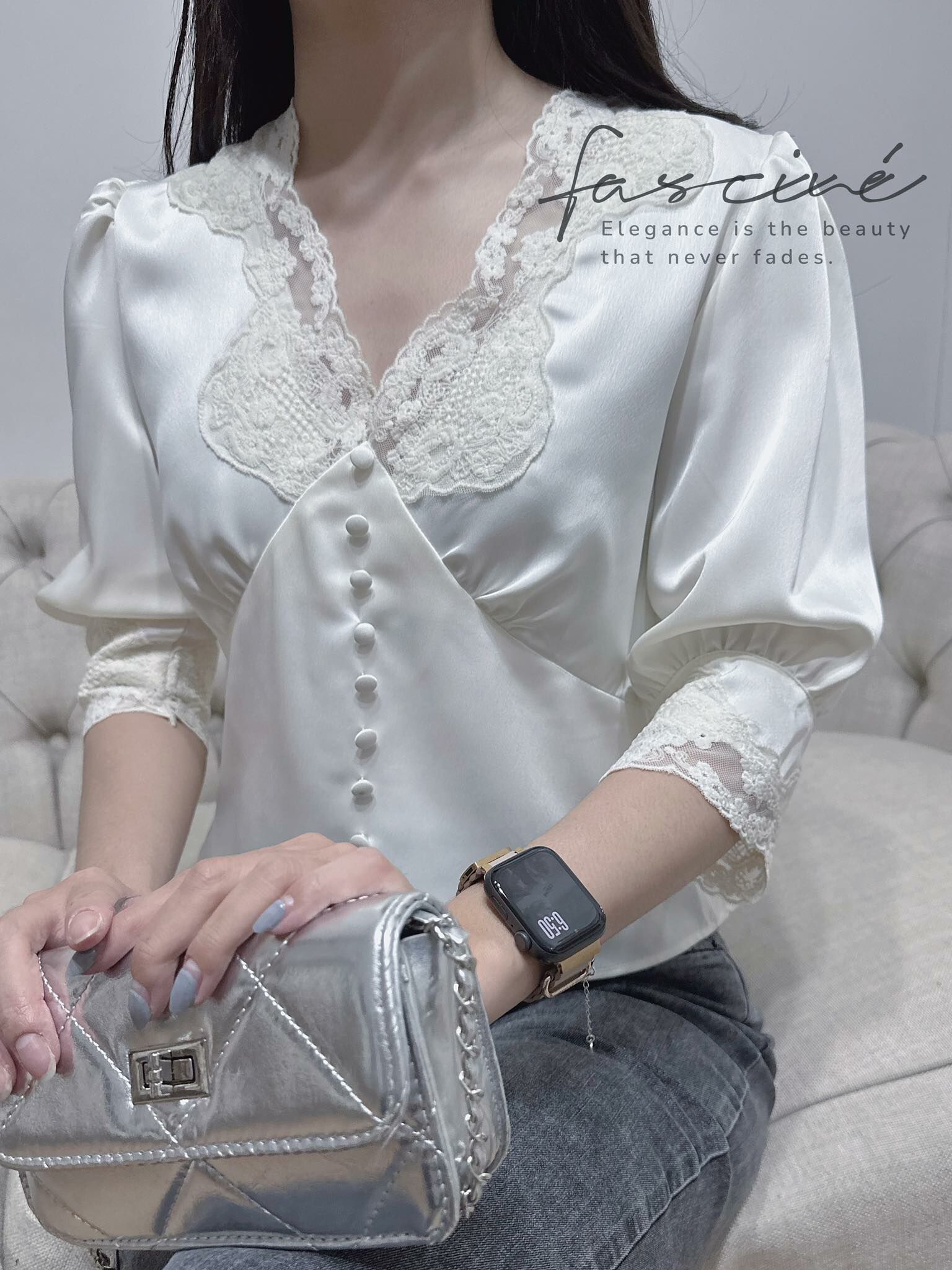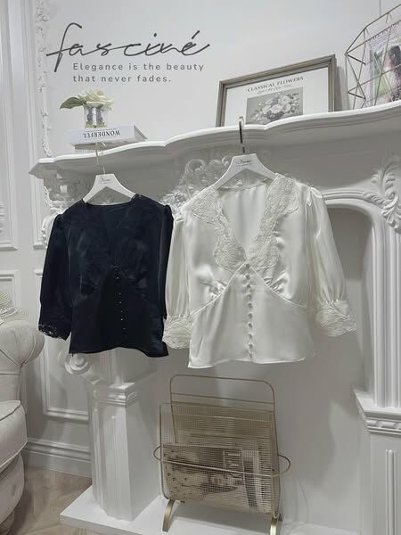 這件法式優雅感滿載的蕾絲V領上衣,以細膩緞面結合微泡泡袖與收腰剪裁,溫柔包裹每一個細節,自然修飾身形、提亮氣色,展現低調而自信的美。精緻蕾絲點綴領口與袖緣,彷彿是午後陽光下的詩句,一穿上就讓人擁有主角般的存在感,無論搭配裙裝或褲裝,皆能散發獨有的迷人氣質。