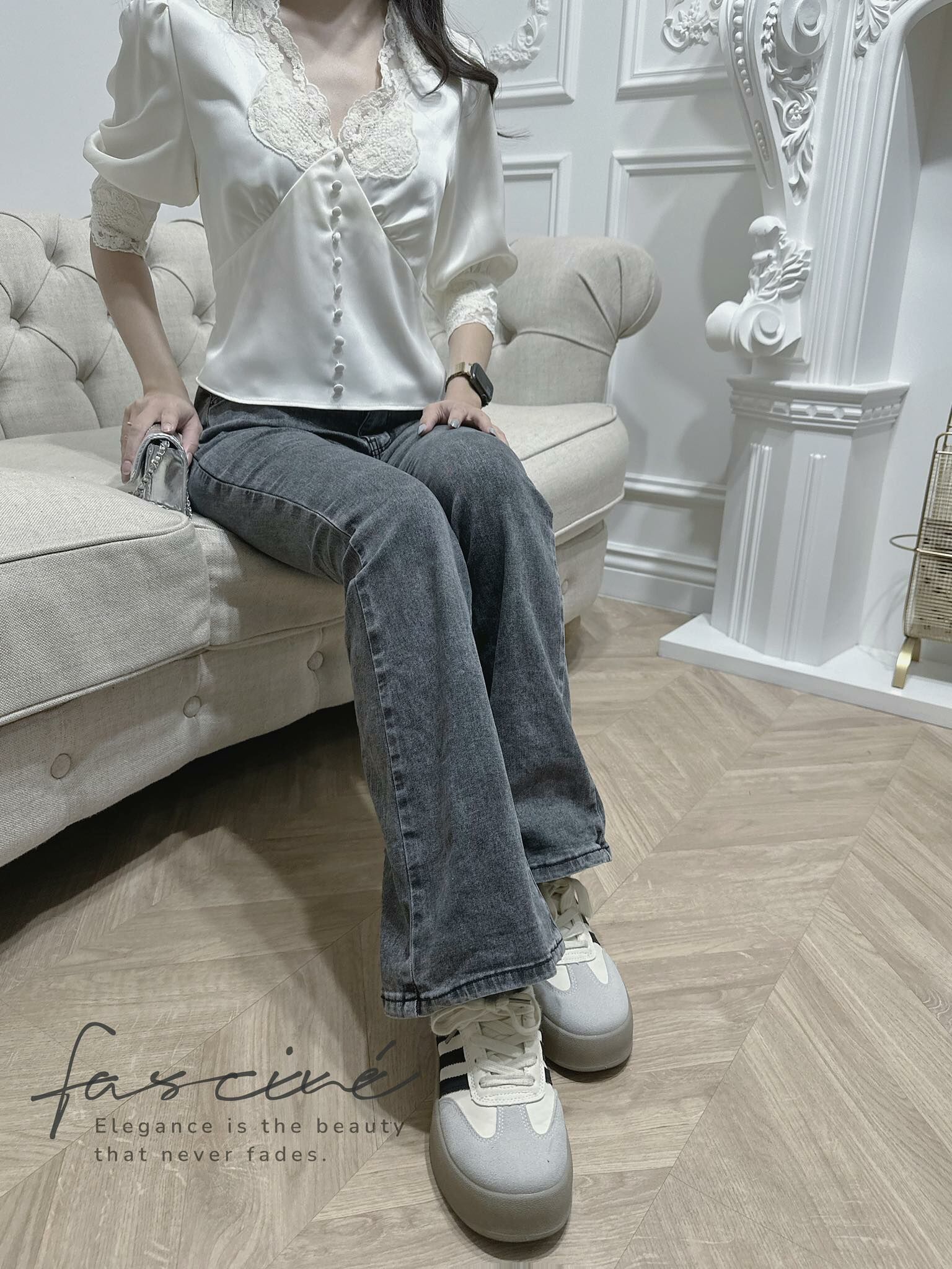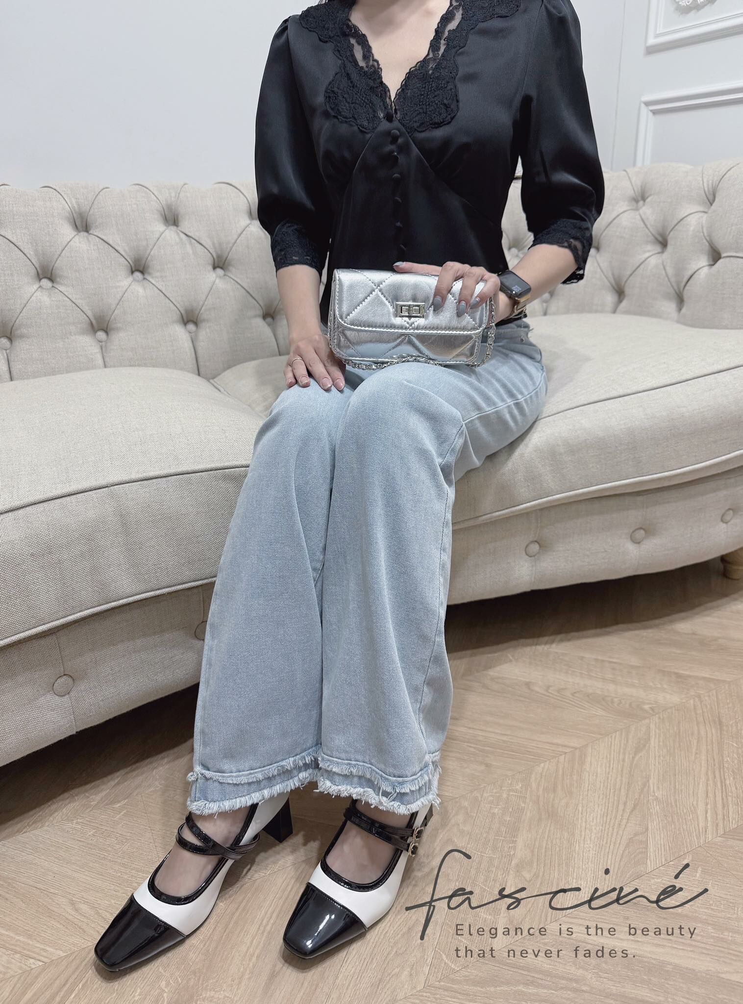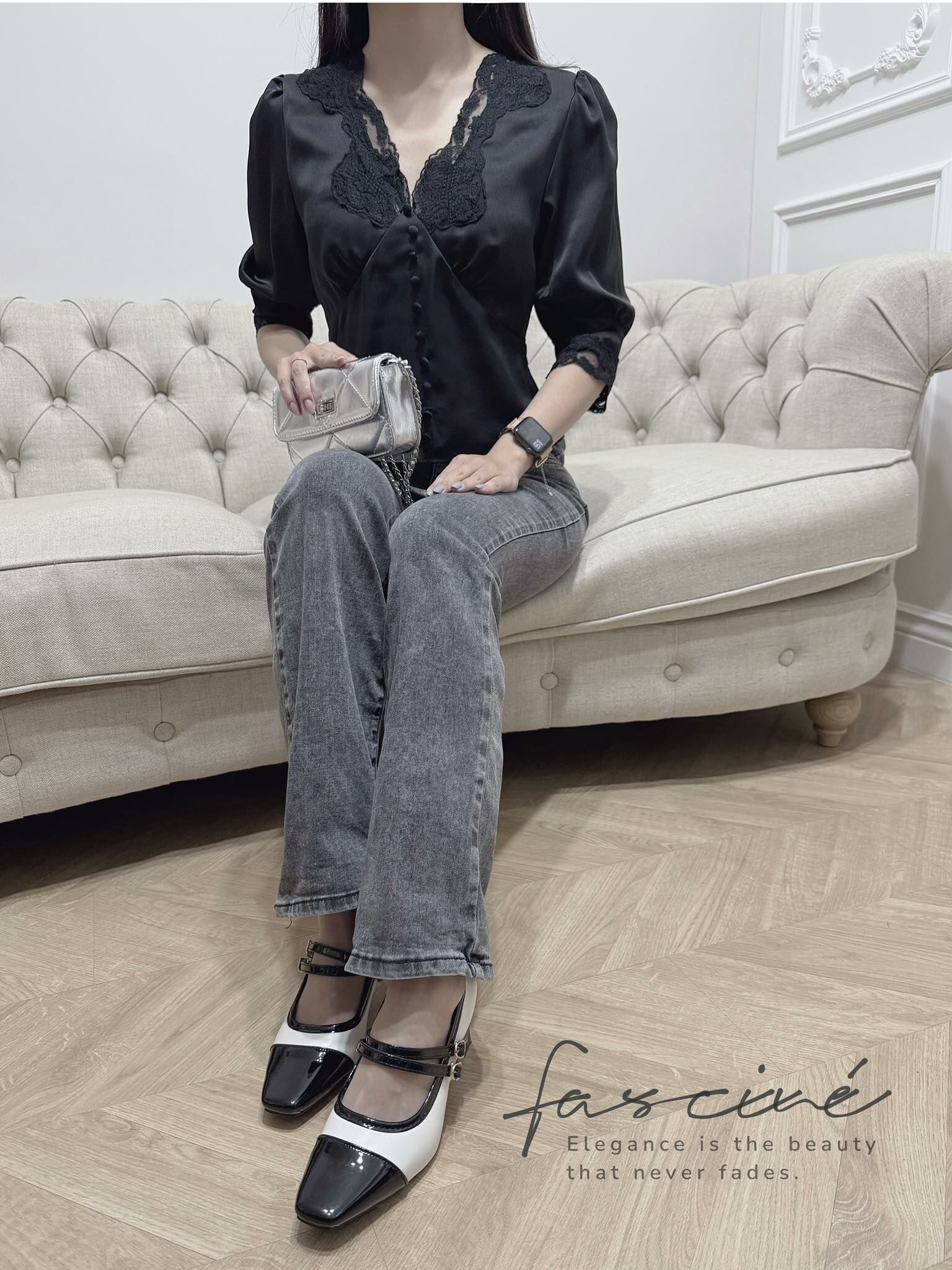 這件法式優雅感滿載的蕾絲V領上衣,以細膩緞面結合微泡泡袖與收腰剪裁,溫柔包裹每一個細節,自然修飾身形、提亮氣色,展現低調而自信的美。精緻蕾絲點綴領口與袖緣,彷彿是午後陽光下的詩句,一穿上就讓人擁有主角般的存在感,無論搭配裙裝或褲裝,皆能散發獨有的迷人氣質。