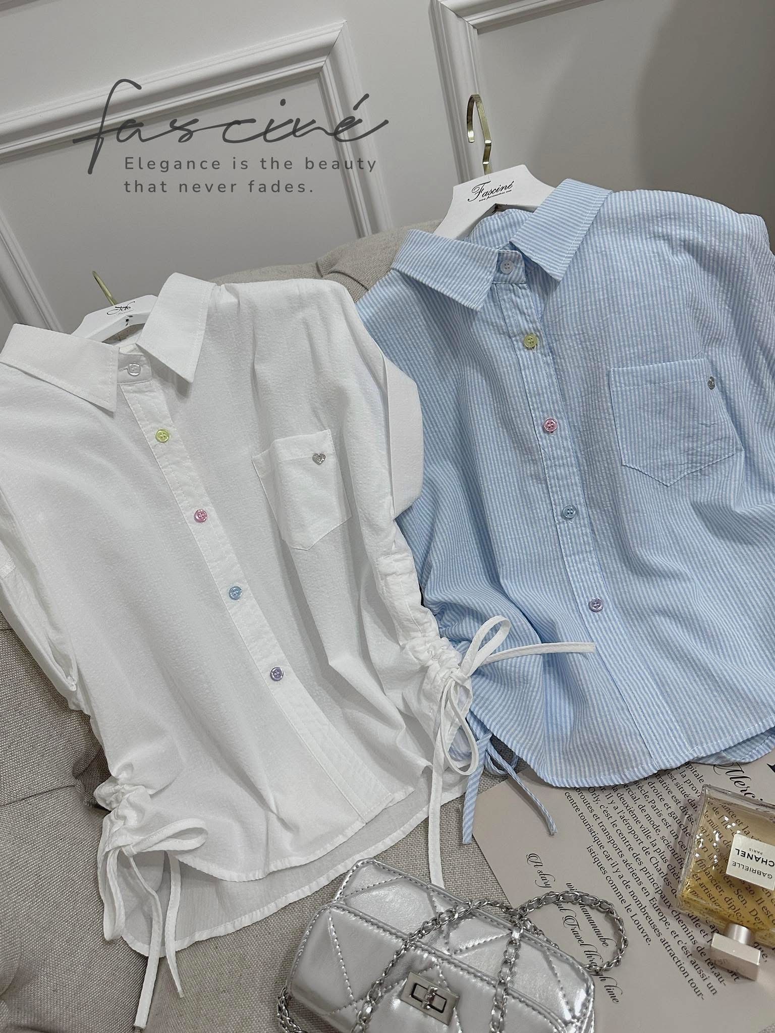 這款短款抽繩襯衫,結合法式簡約線條與現代剪裁感,特別設計的抽繩下襬可自由調整,輕鬆打造腰線比例,不論是放鬆穿或綁出俐落感,都有不一樣的風格美。簡約剪裁中點綴一顆顆繽紛釦子,為整體造型加分不少。這款上衣在細節裡藏著少女感與設計感,不挑身形,柔軟透氣,非常適合春夏日常。藍色條紋帶出清新氣質,白色則百搭耐看,搭配牛仔褲、長裙或短褲都能展現不同氛圍,是衣櫃裡高實穿系單品。