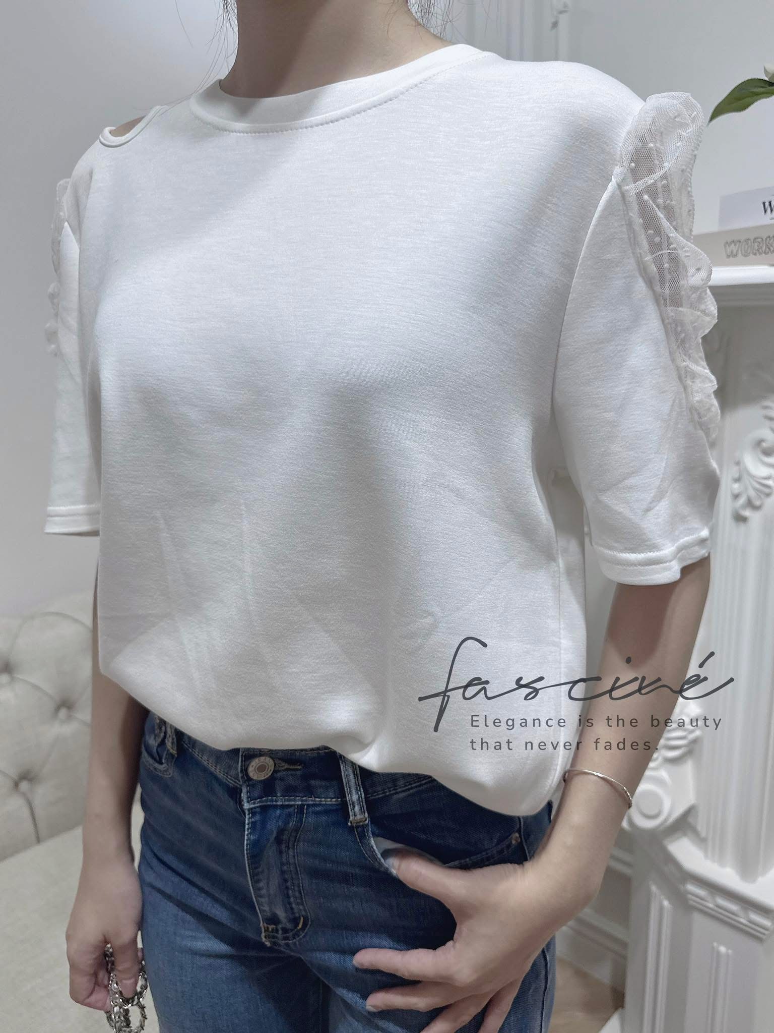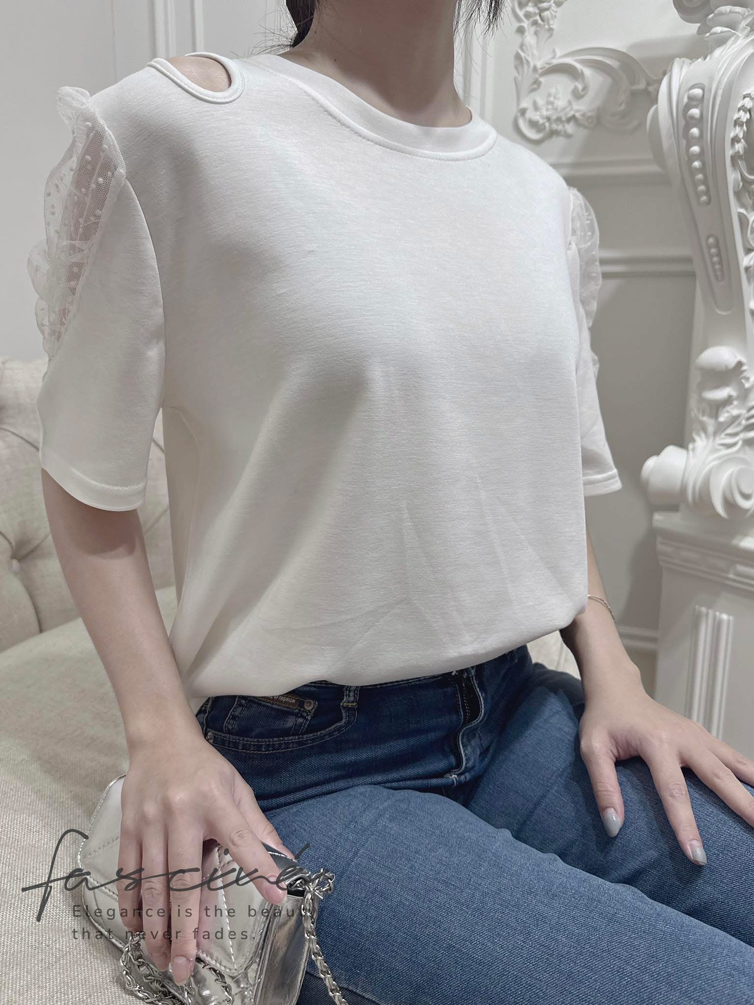 (05T14-25) 法式精梳棉圓領泡泡袖拼接半袖網紗顯瘦上衣