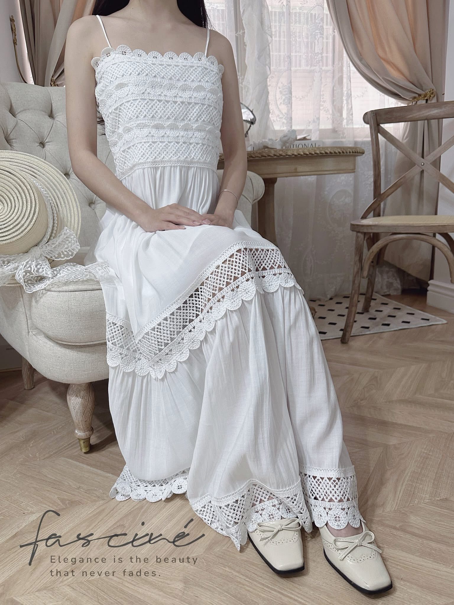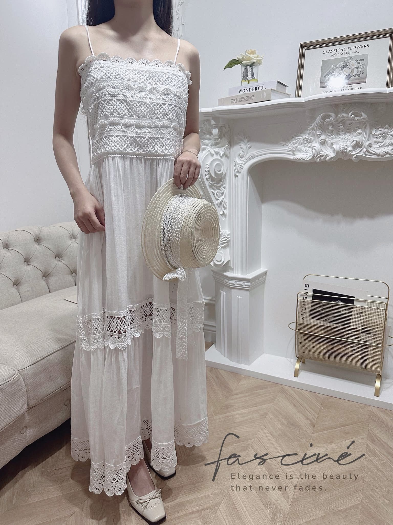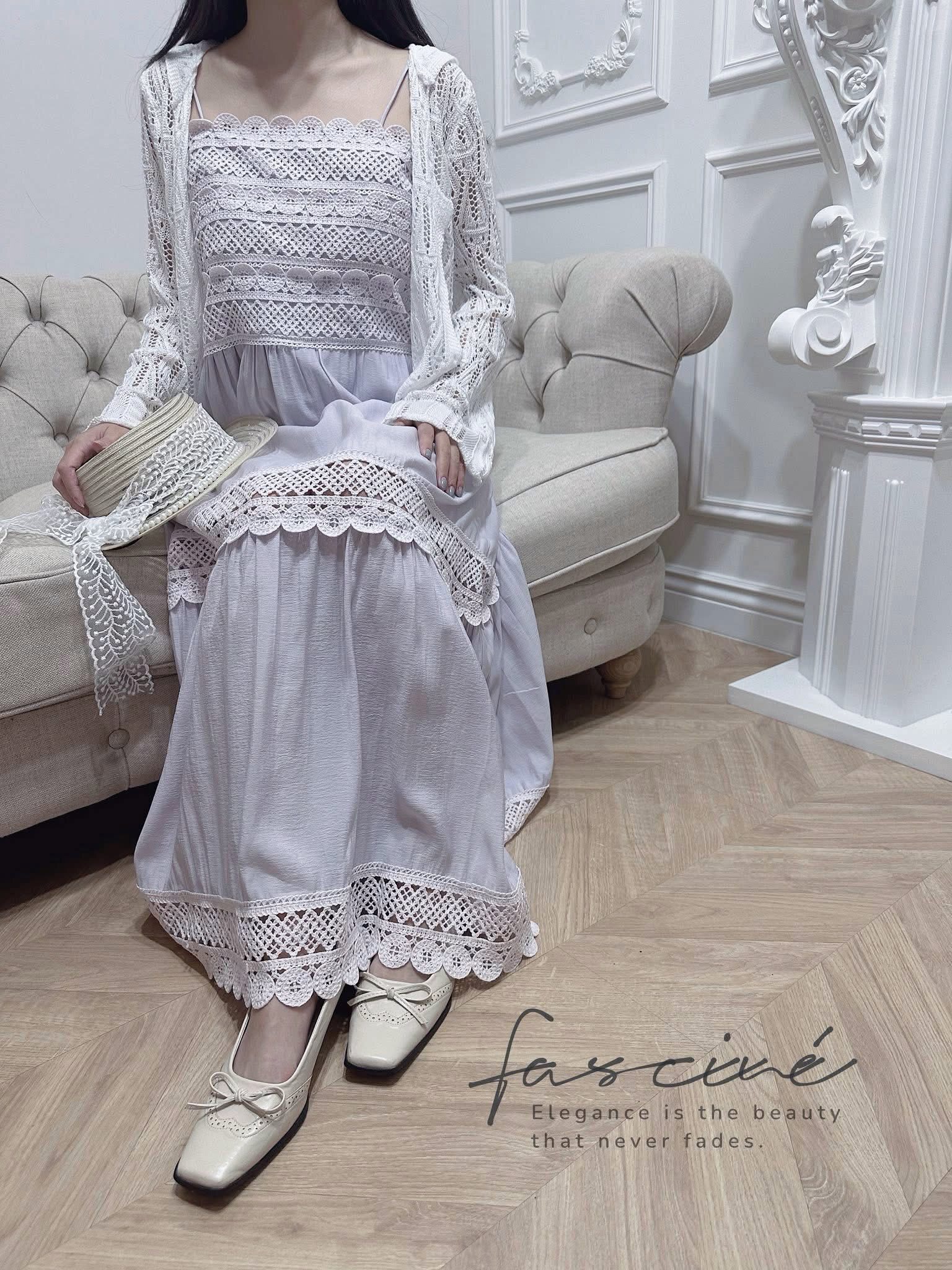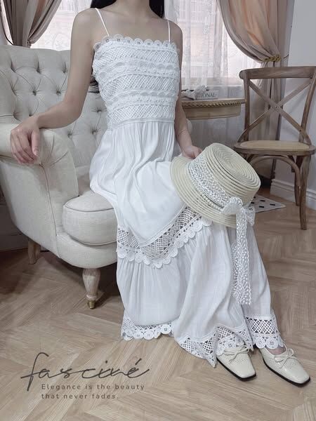 細緻的鈎花蕾絲搭配鏤空層次,不僅呈現優雅的法式氣息,更完美修飾肩頸線條。裙身則選用輕盈垂墜的布料,走動之間微微搖曳,搭配裙擺的波浪花邊設計,既有女孩的浪漫,又帶著成熟的知性韻味。