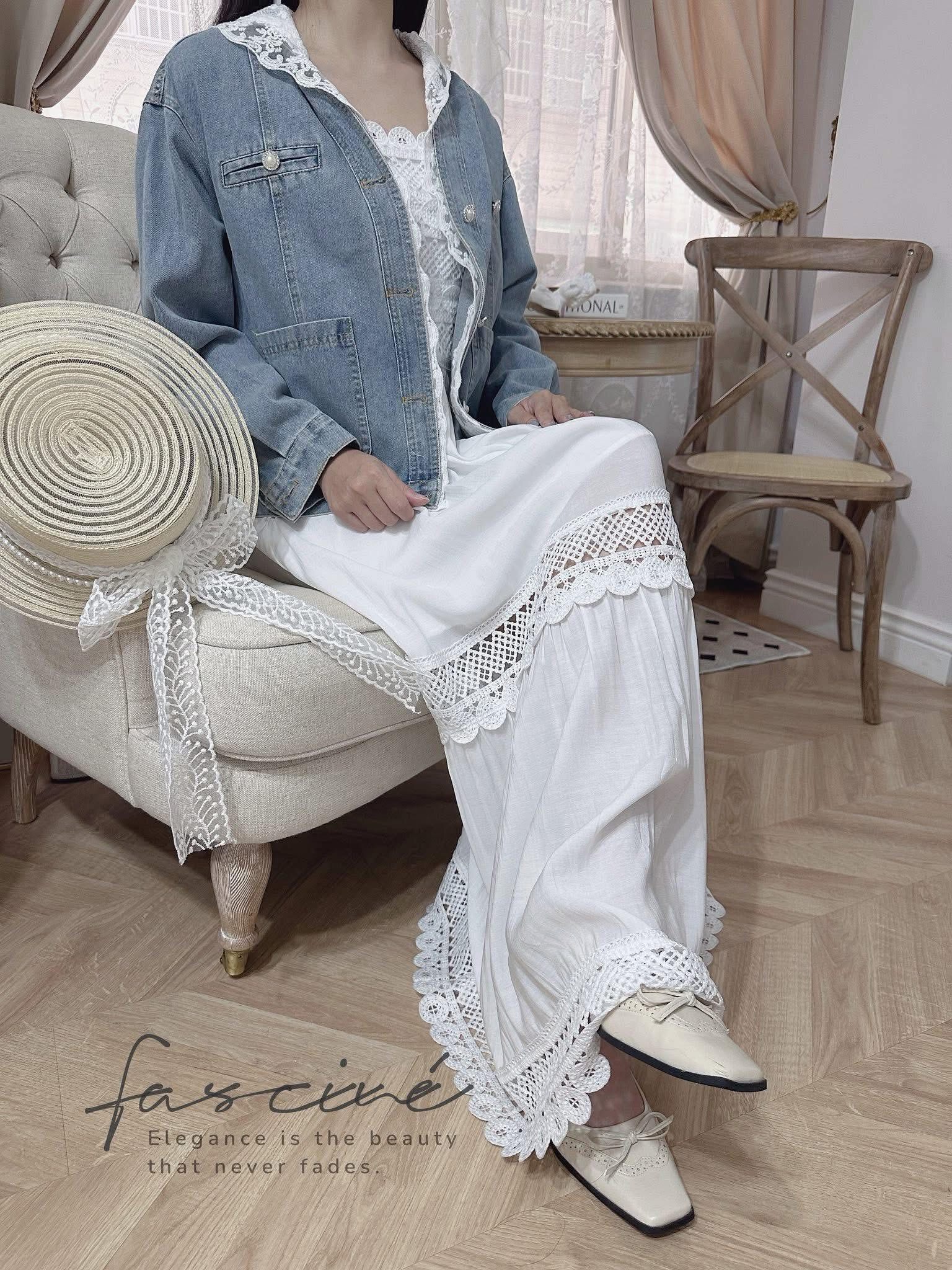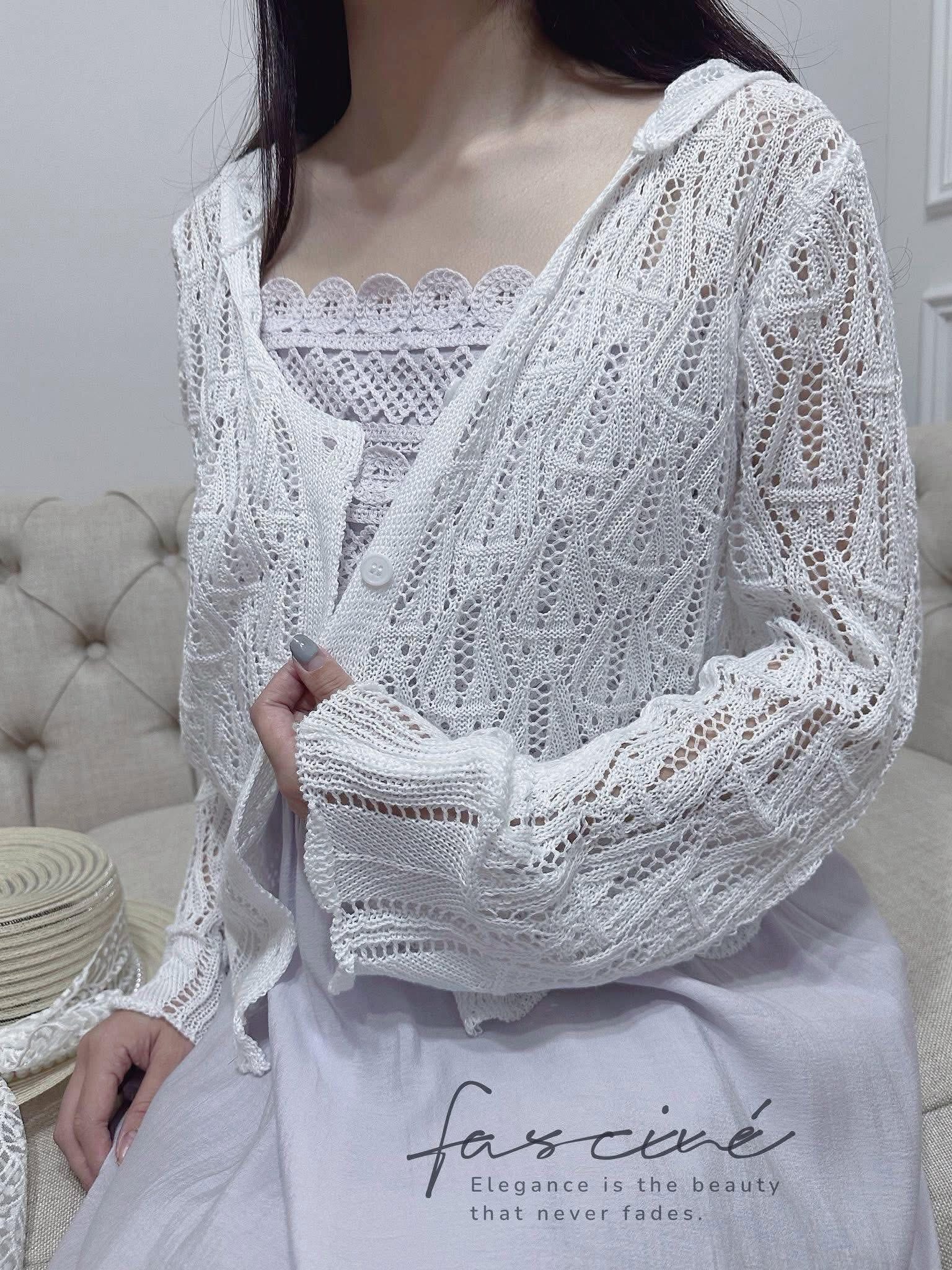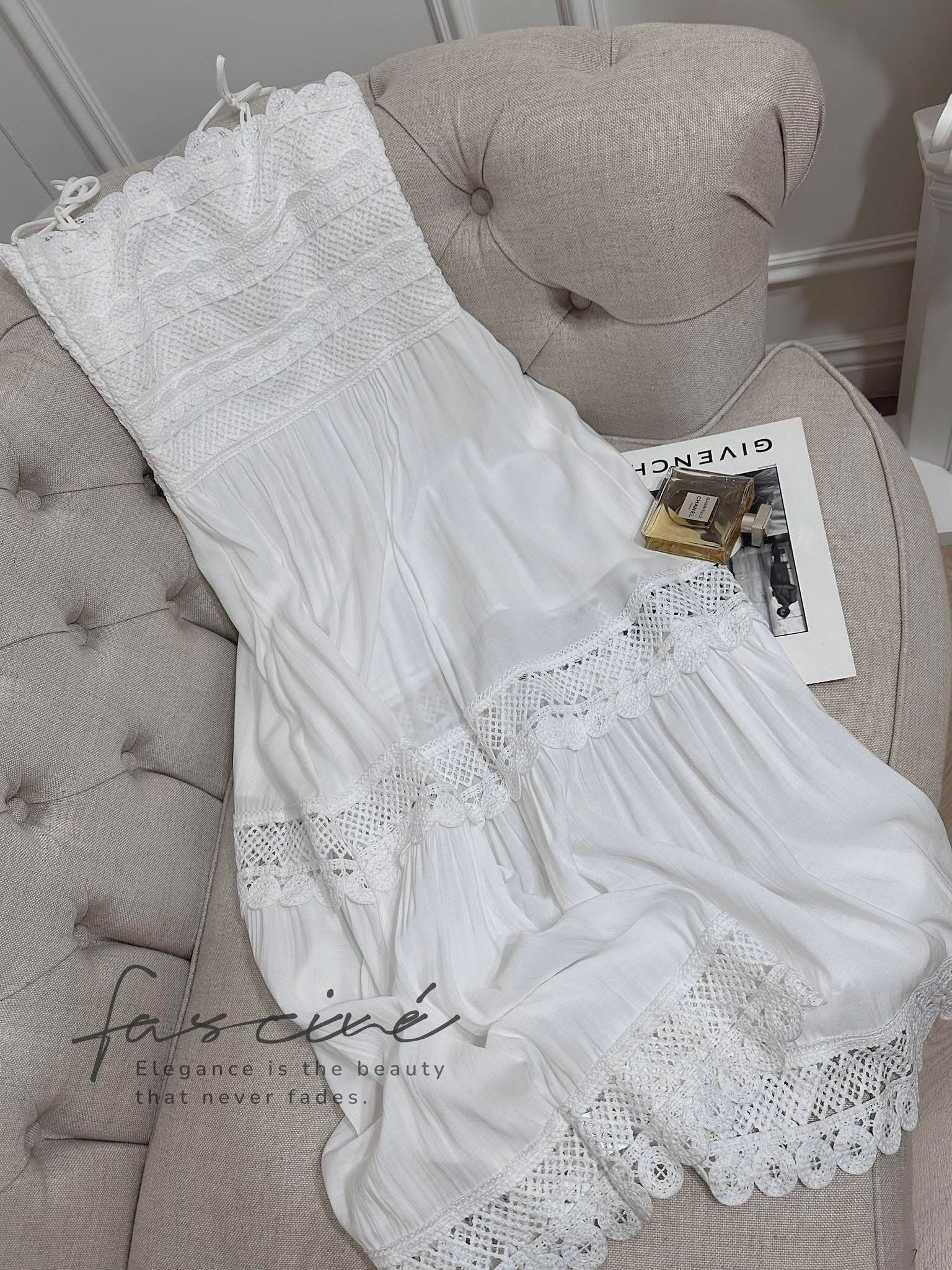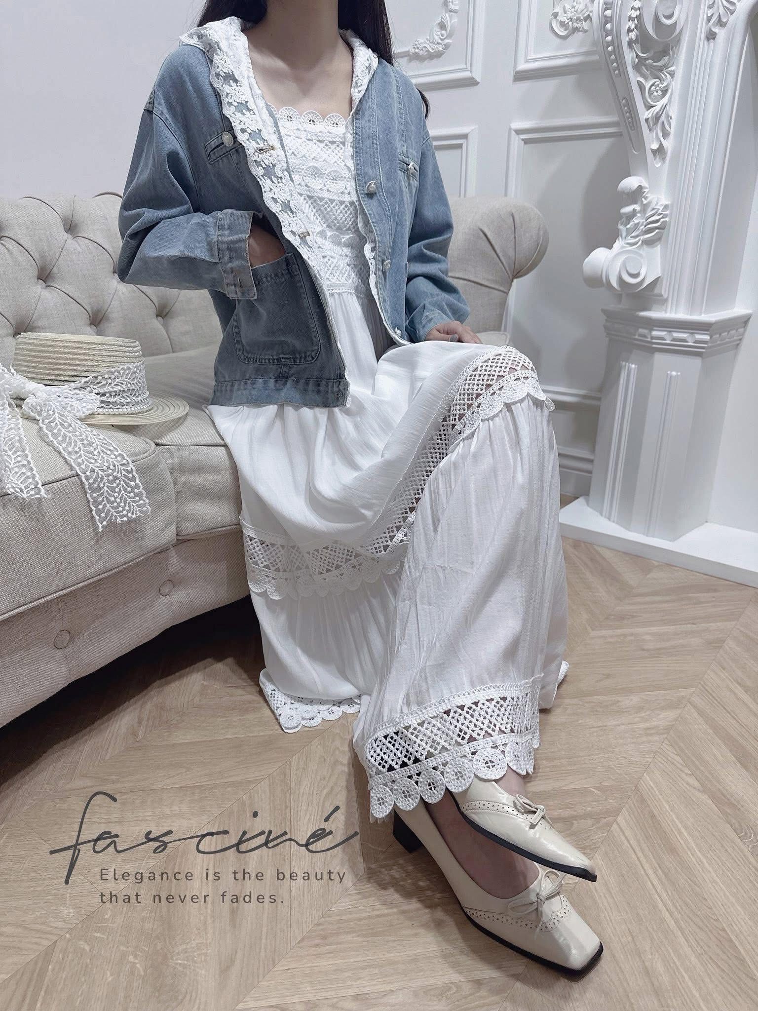 細緻的鈎花蕾絲搭配鏤空層次,不僅呈現優雅的法式氣息,更完美修飾肩頸線條。裙身則選用輕盈垂墜的布料,走動之間微微搖曳,搭配裙擺的波浪花邊設計,既有女孩的浪漫,又帶著成熟的知性韻味。