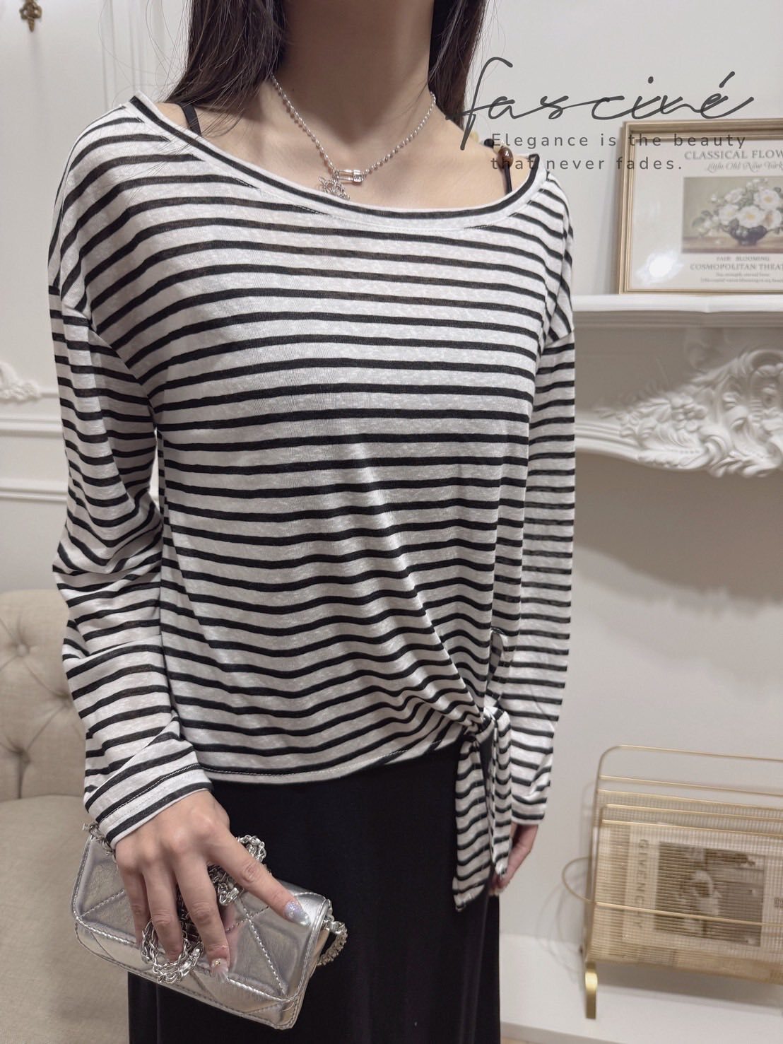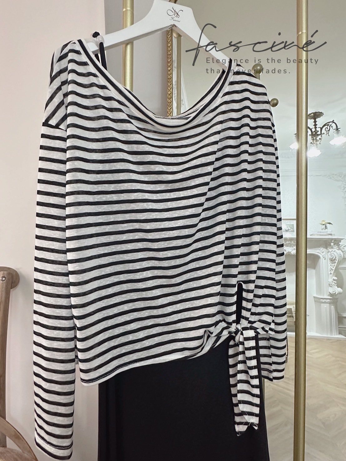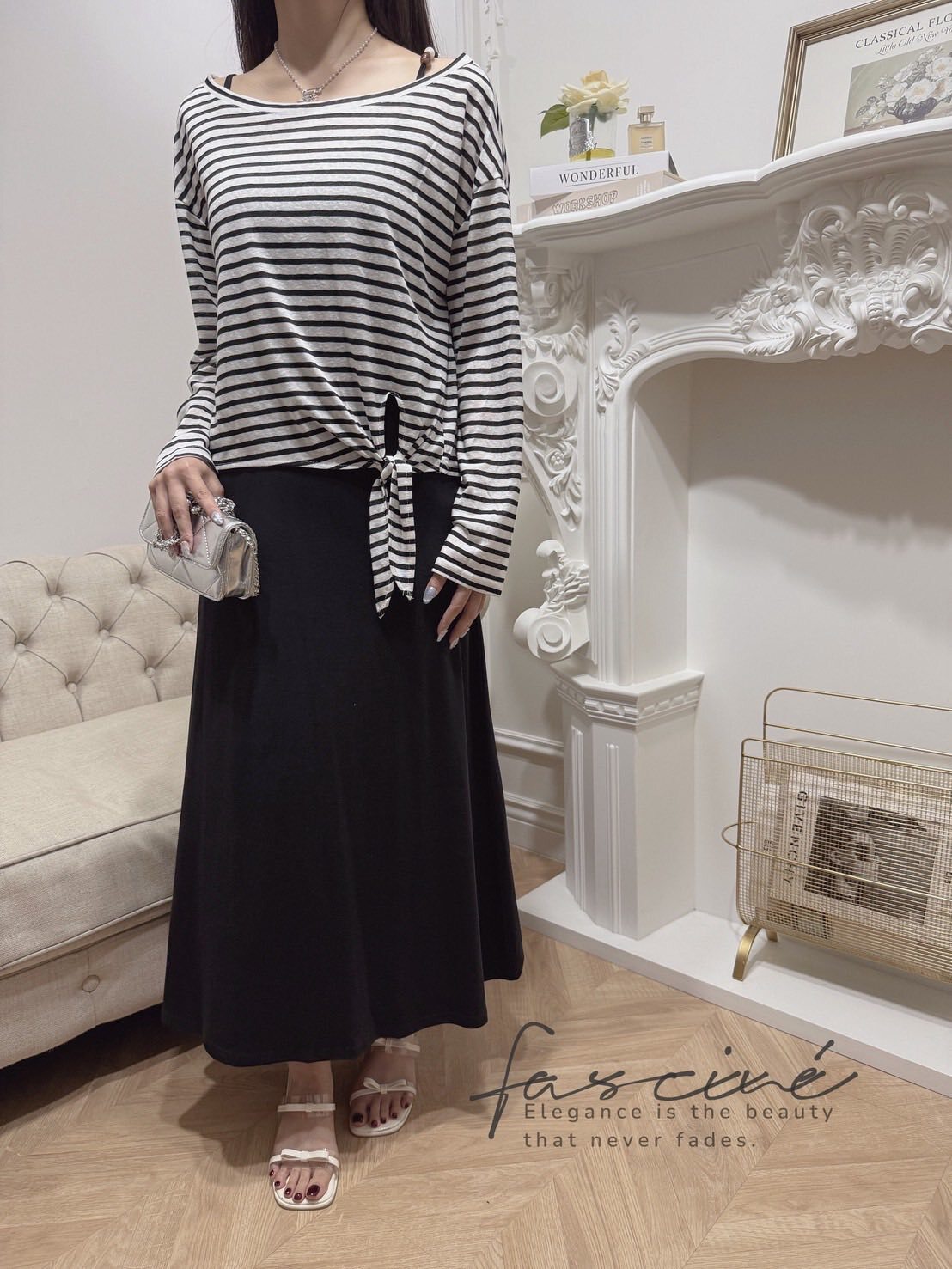 外層選用輕薄混紡,黑白撞色條紋營造隨性海軍風;落肩寬鬆版型遮肉顯瘦,不對稱綁結下擺可自由打結或垂墜,隨步伐搖曳。內層極簡吊帶連衣裙採A字裙擺,瞬間拉長比例,行走間垂墜線條勾勒纖細曲線。兩件可拆—單穿T恤輕鬆出街,單穿長裙優雅晚宴,疊穿則層次滿分,從通勤到度假一鍵切換。配銀色小包或珍珠項鍊,即刻擁抱左岸風情。