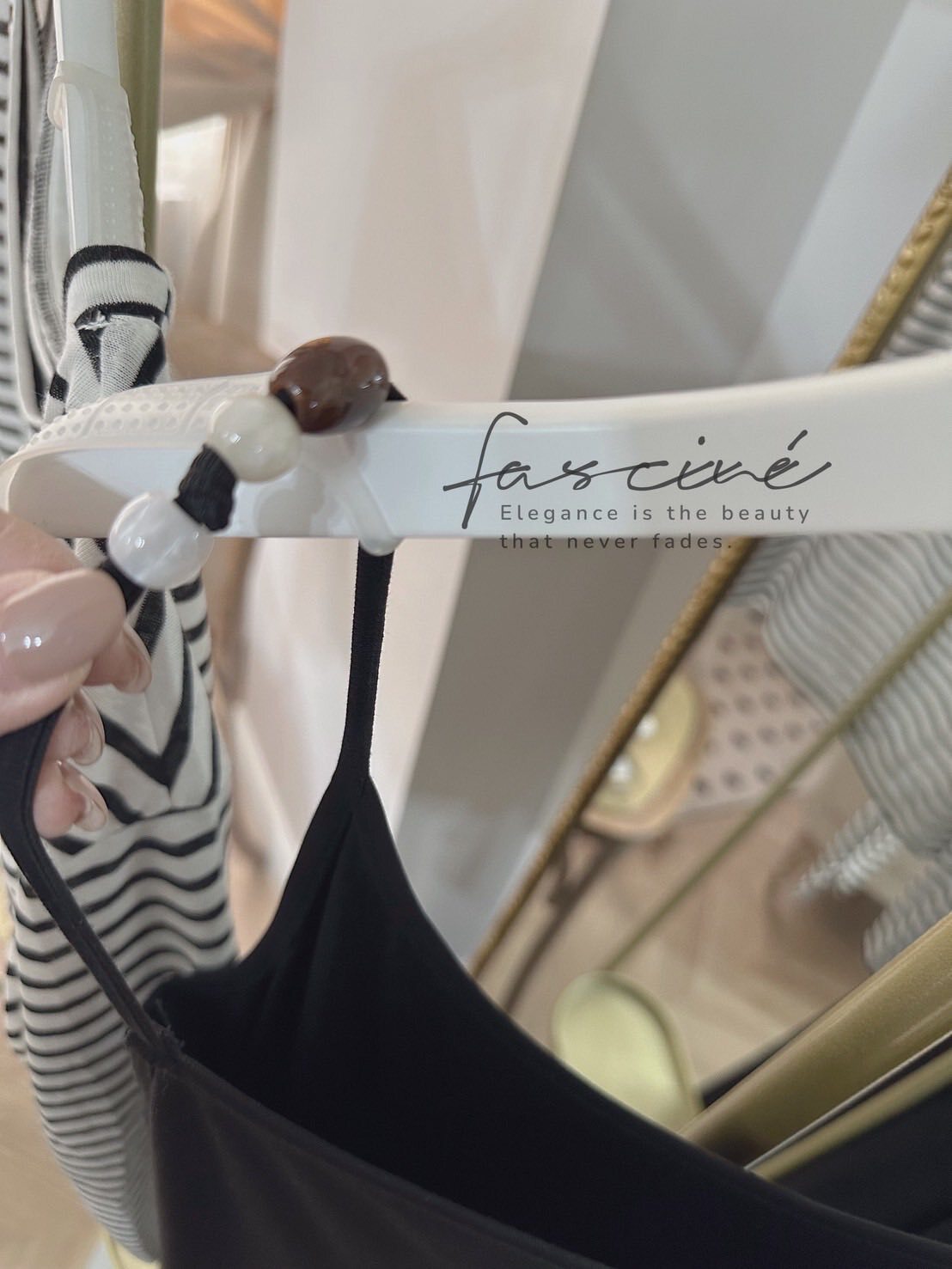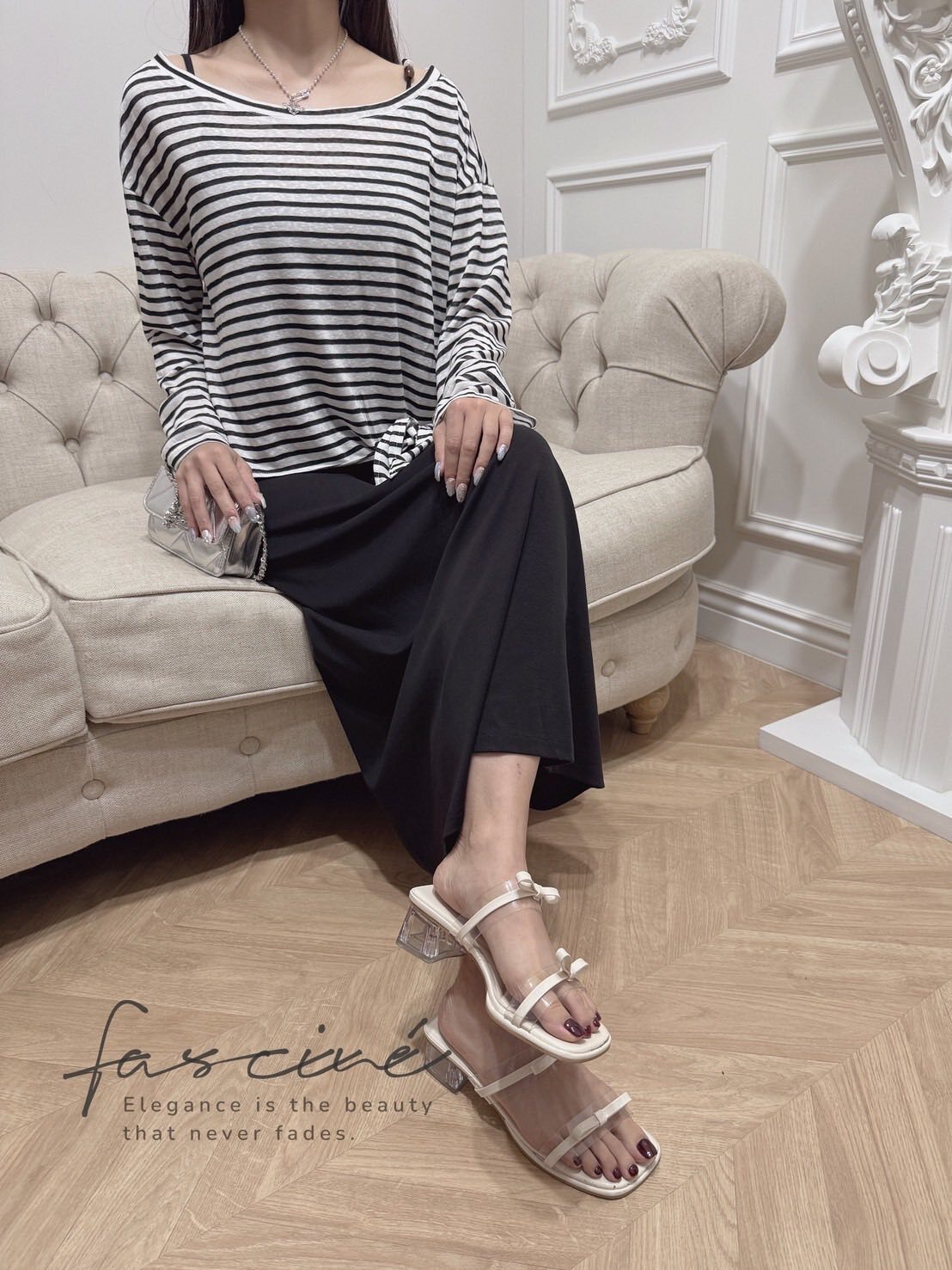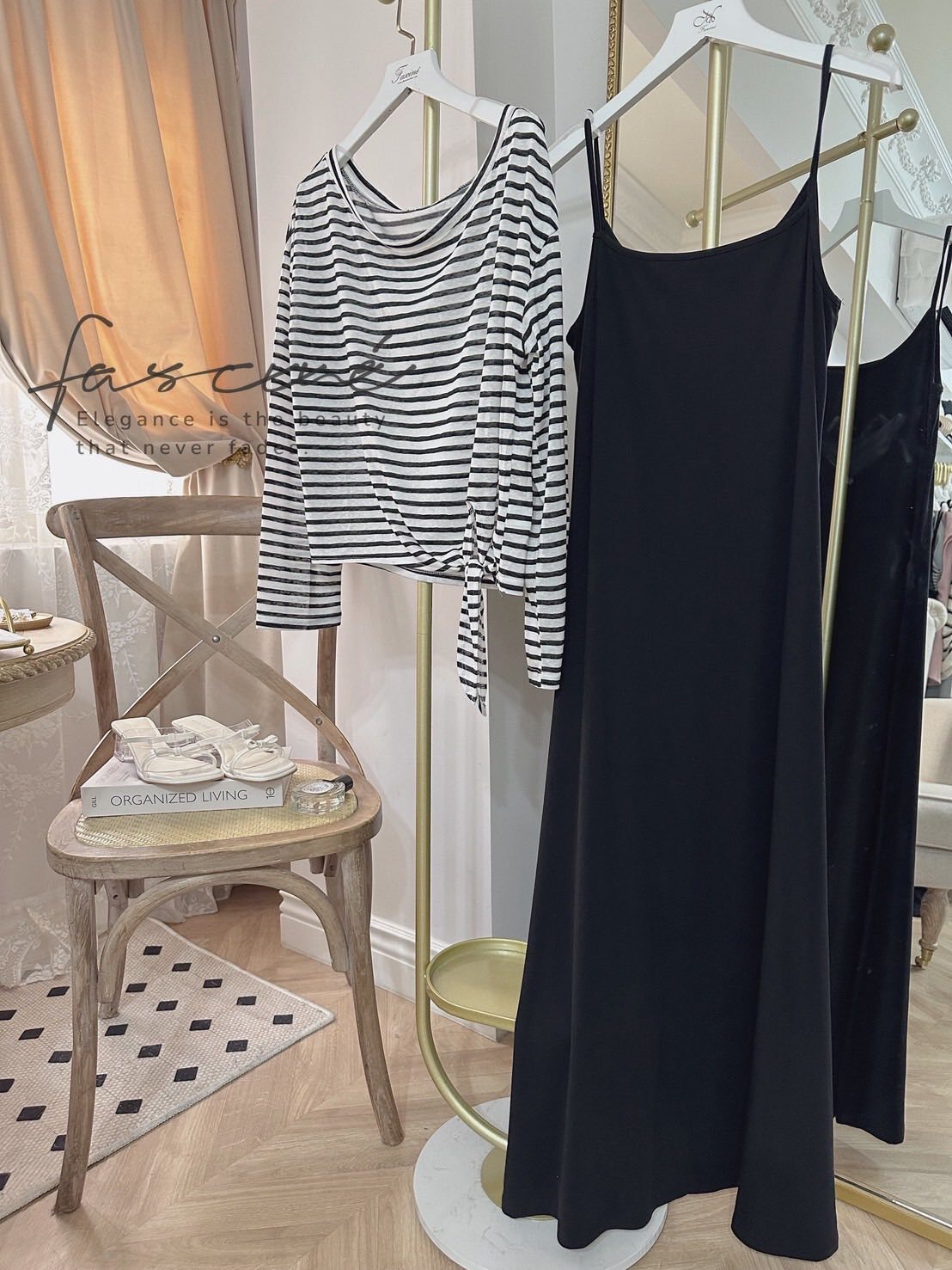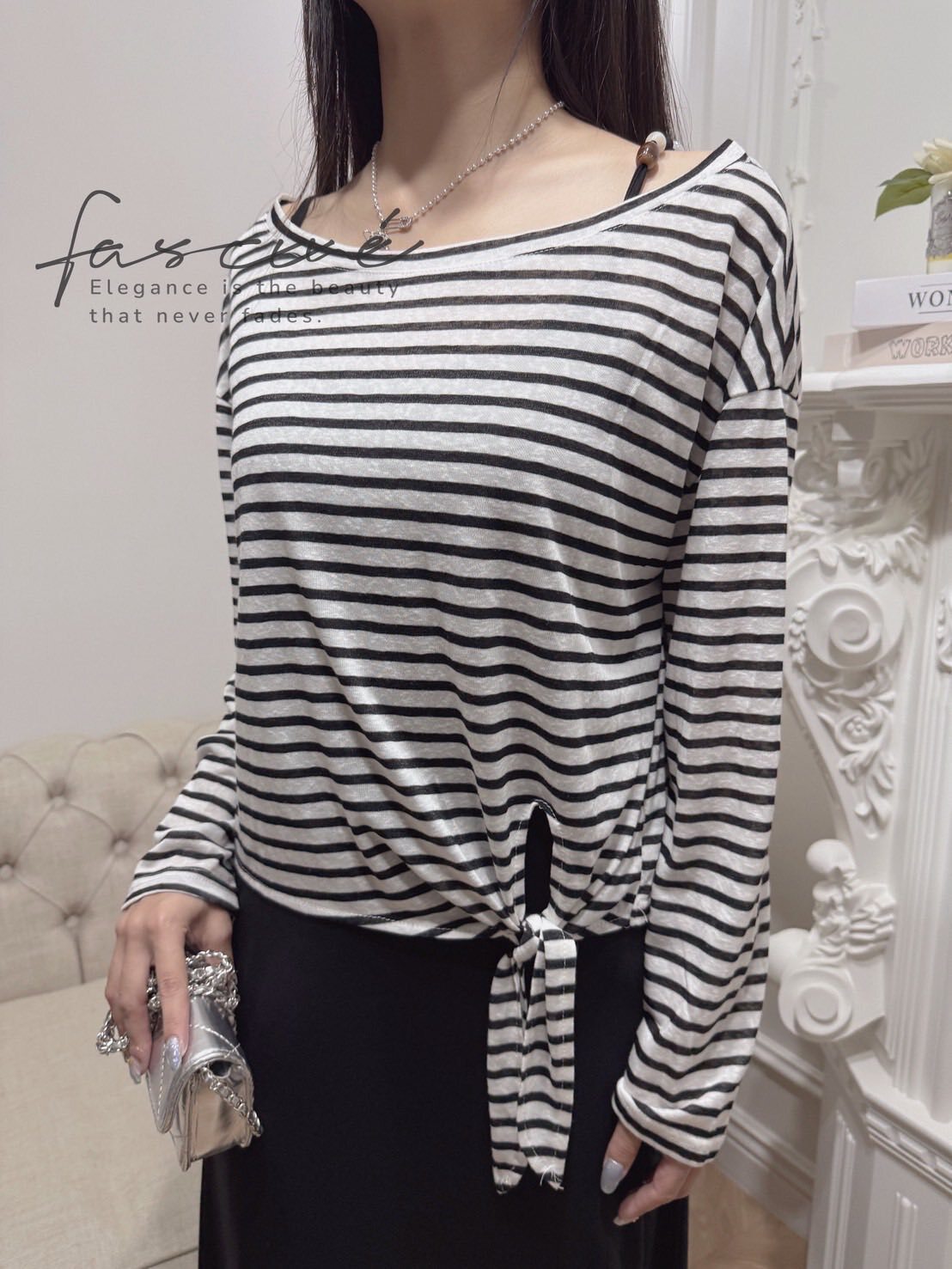 外層選用輕薄混紡,黑白撞色條紋營造隨性海軍風;落肩寬鬆版型遮肉顯瘦,不對稱綁結下擺可自由打結或垂墜,隨步伐搖曳。內層極簡吊帶連衣裙採A字裙擺,瞬間拉長比例,行走間垂墜線條勾勒纖細曲線。兩件可拆—單穿T恤輕鬆出街,單穿長裙優雅晚宴,疊穿則層次滿分,從通勤到度假一鍵切換。配銀色小包或珍珠項鍊,即刻擁抱左岸風情。