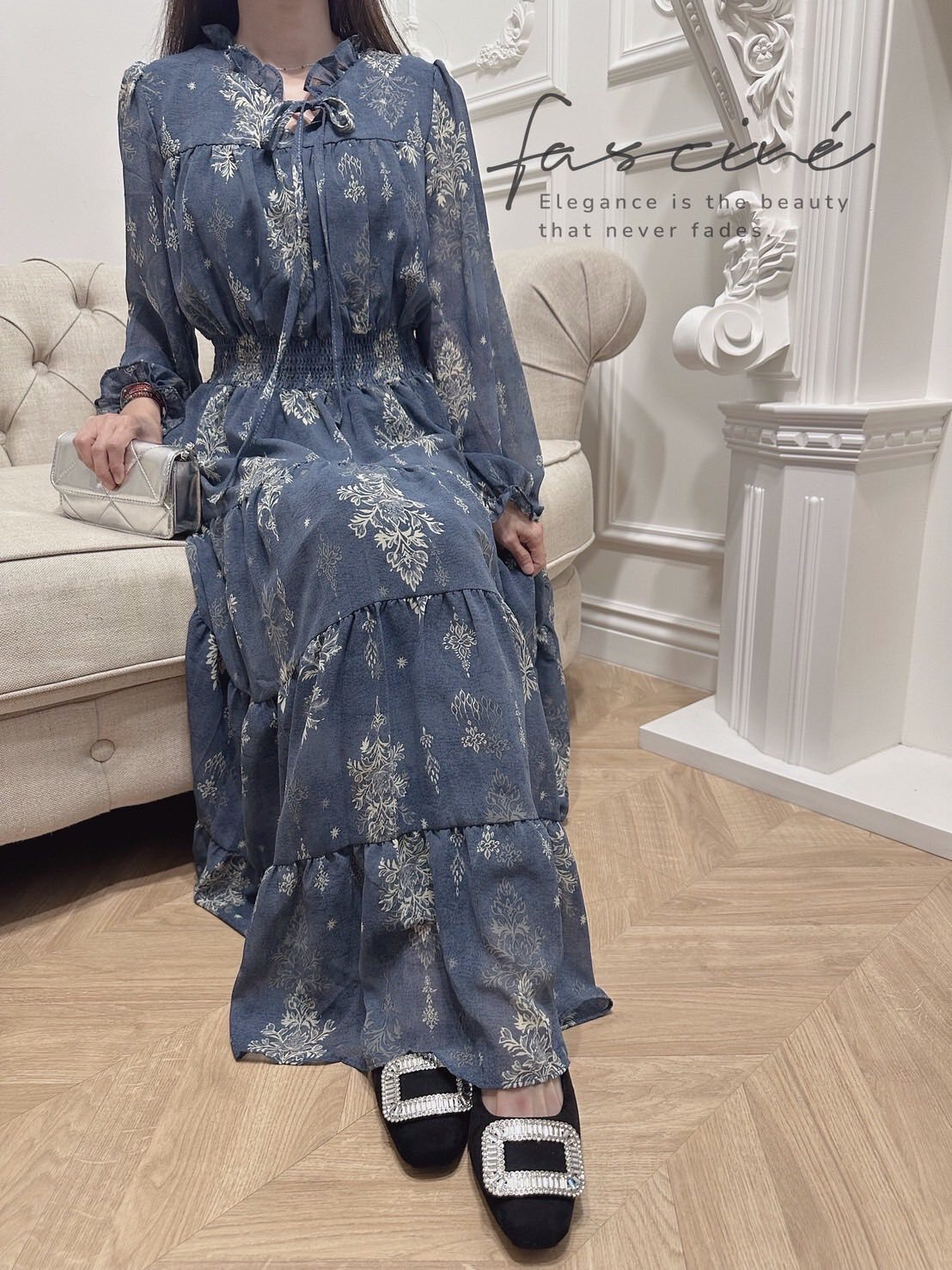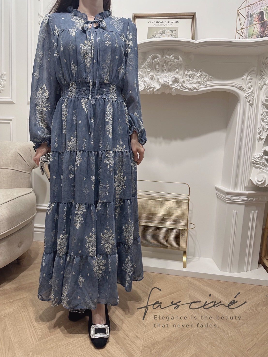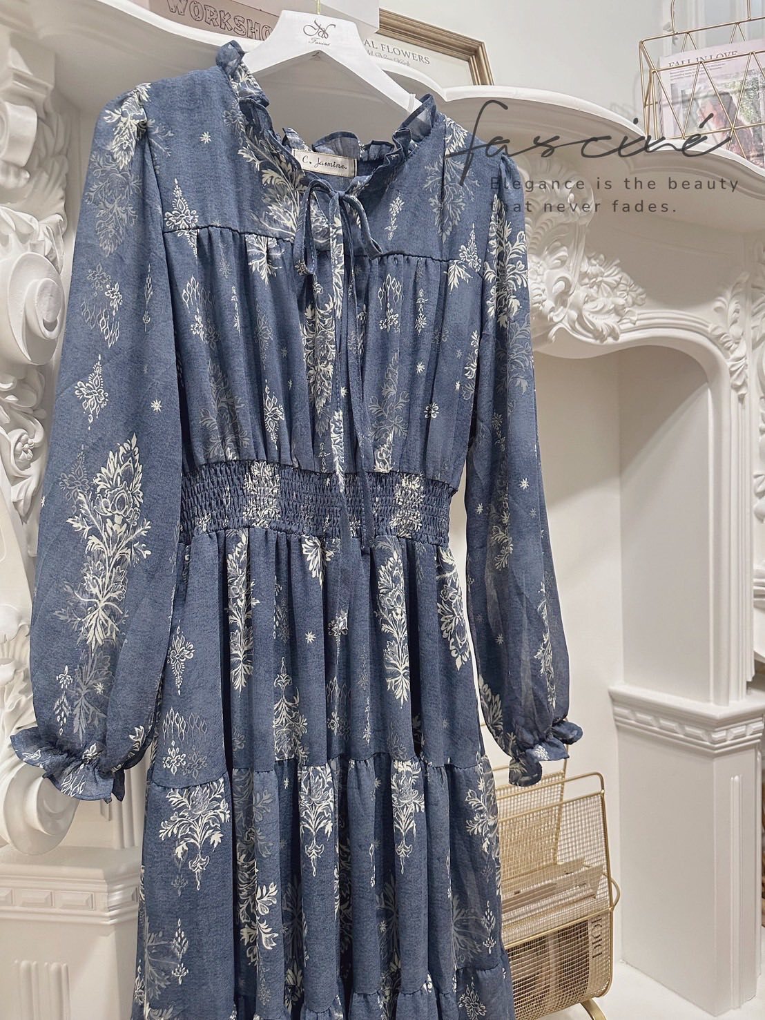 (09T19-25B)法式印花蝴蝶結綁帶雪紡長洋裝