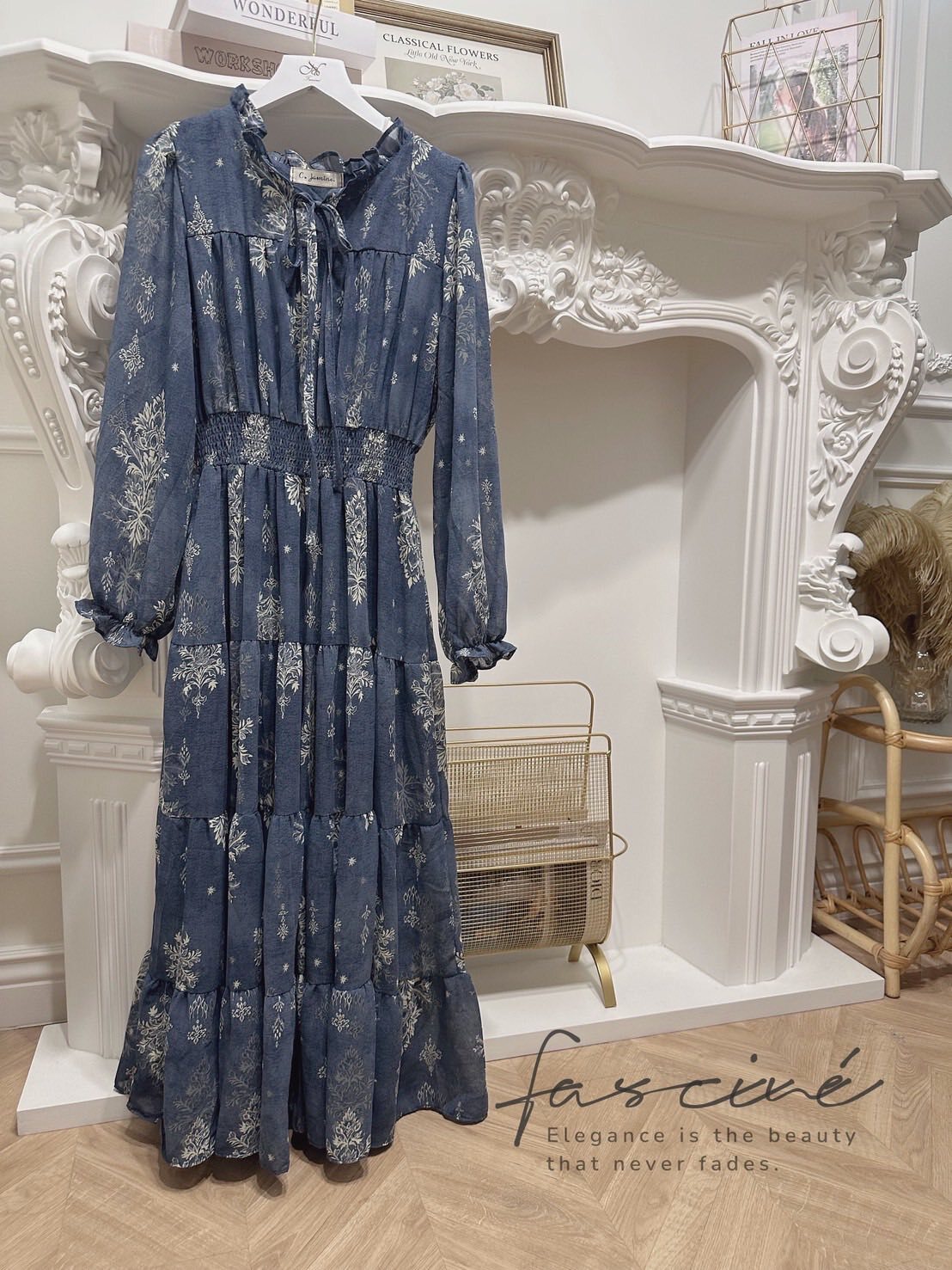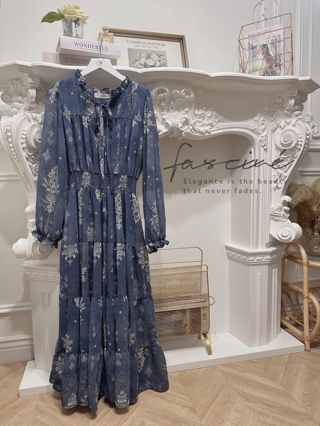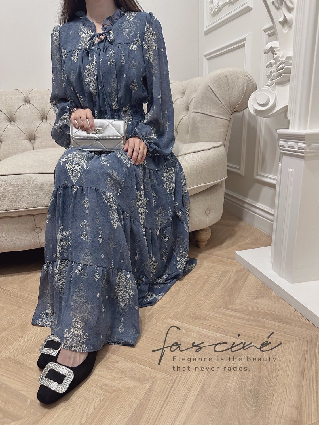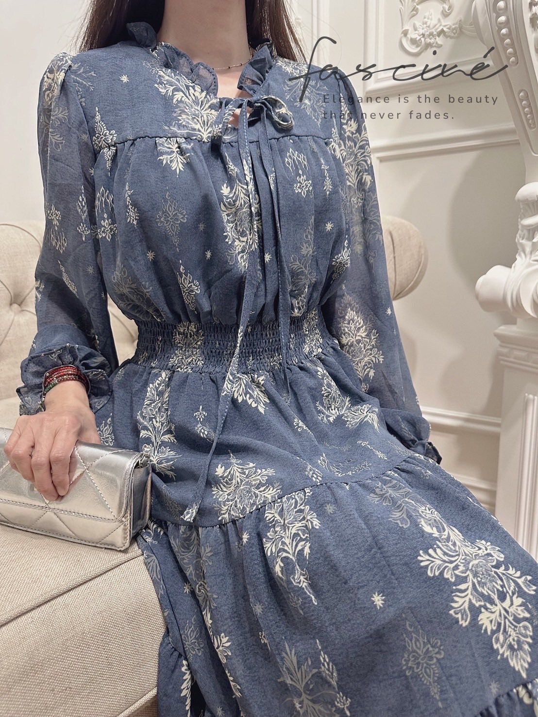 法式小荷葉領結合蝴蝶結綁帶,映襯鎖骨線條,甜而不膩的優雅氛圍瞬間展開 。細緻花序鋪陳霧藍雪紡,走動間層層裙擺飄逸,日常與約會都能恰到好處 。 彈力鬆緊腰輕鬆收束比例,舒適包覆同時保留活動度,長時間穿著也自在 。