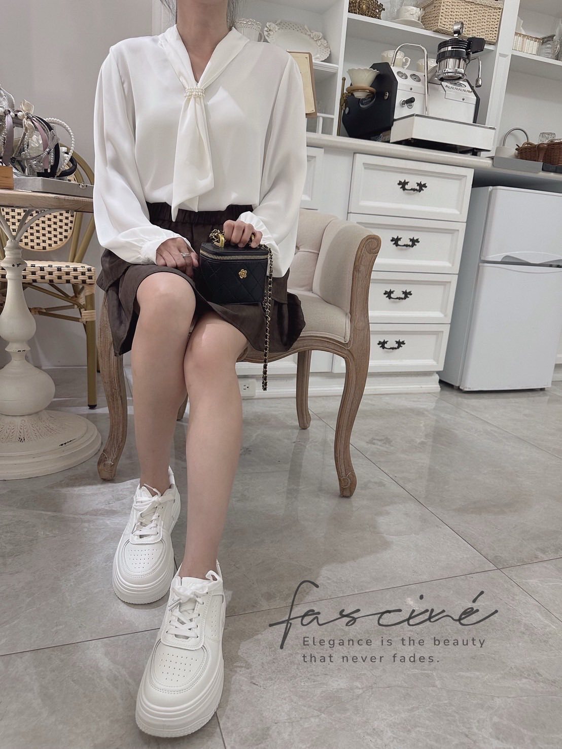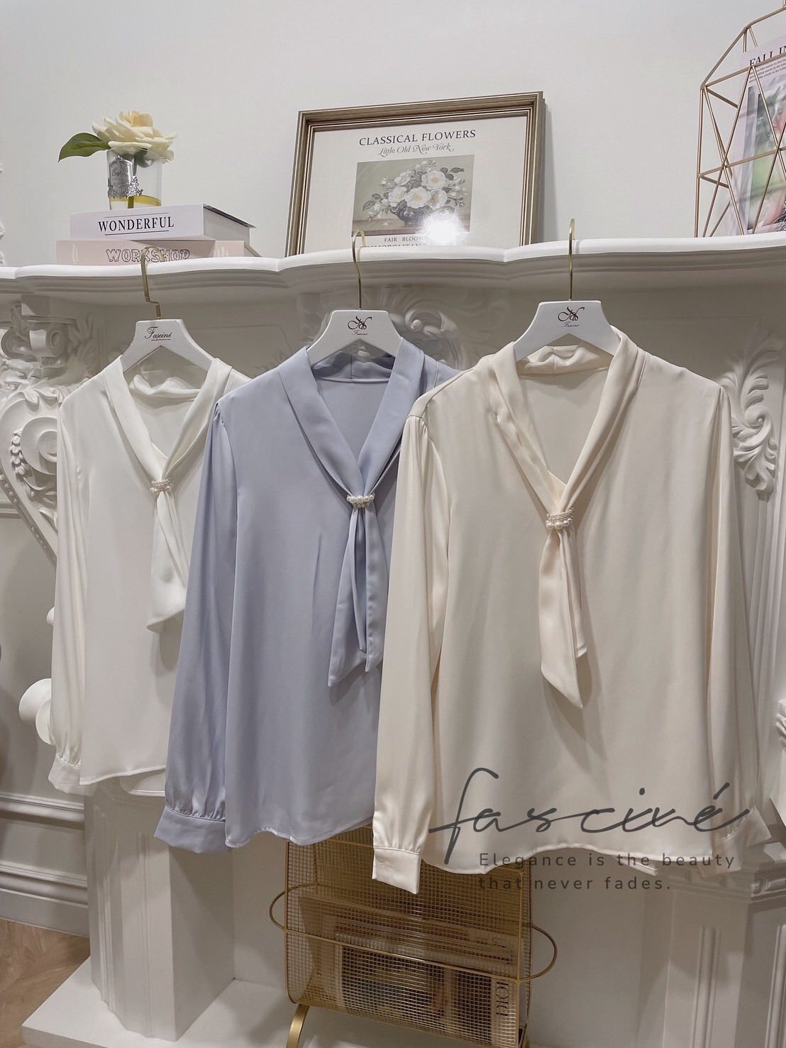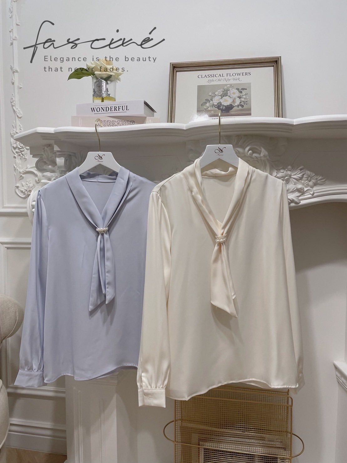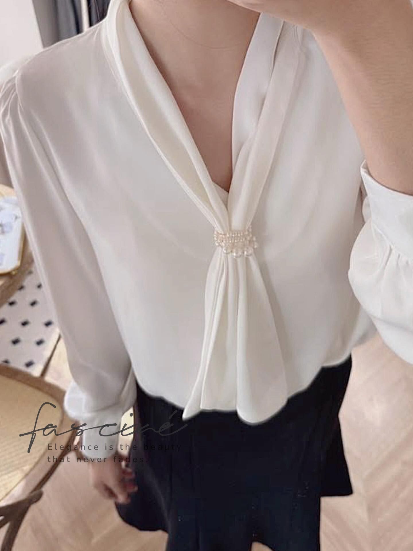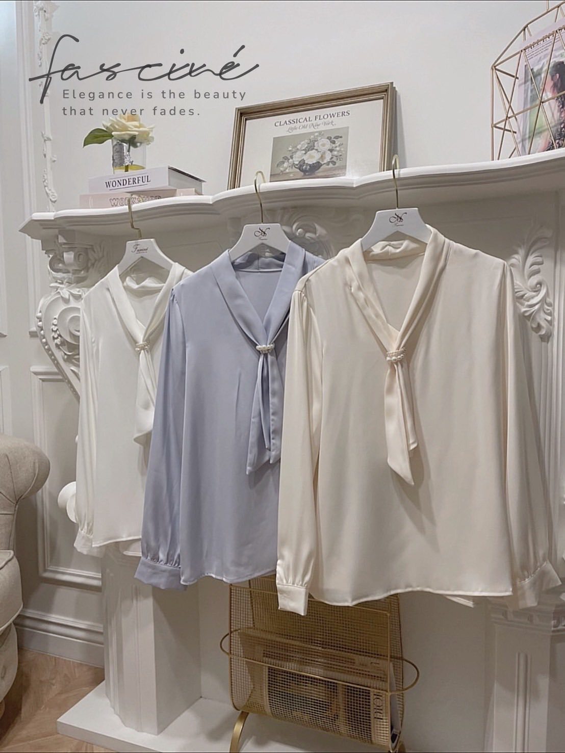 法式珠鍊可拆領中緞面上衣,可拆式珠鍊領結,輕鬆切換綁帶或簡約V領,通勤到約會一件搞定 。 緞面微光澤與順滑垂墜,修飾肩頸線條,呈現俐落而不呆板的優雅 。 三色各有氣質:霧藍知性、白色清新、杏色溫柔,百搭不挑膚 。