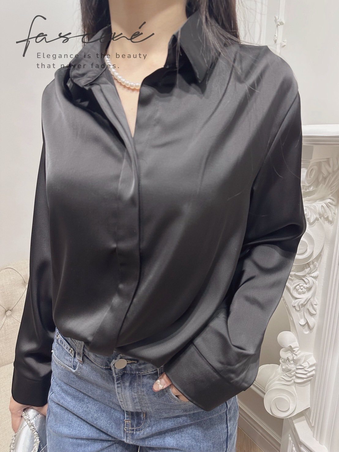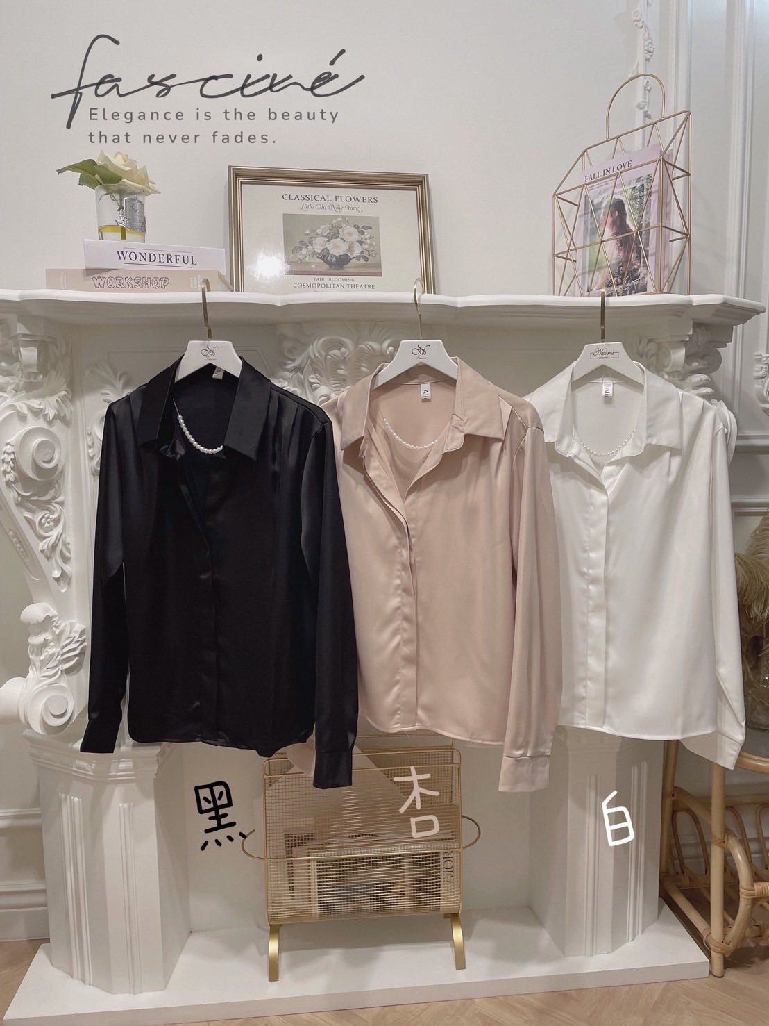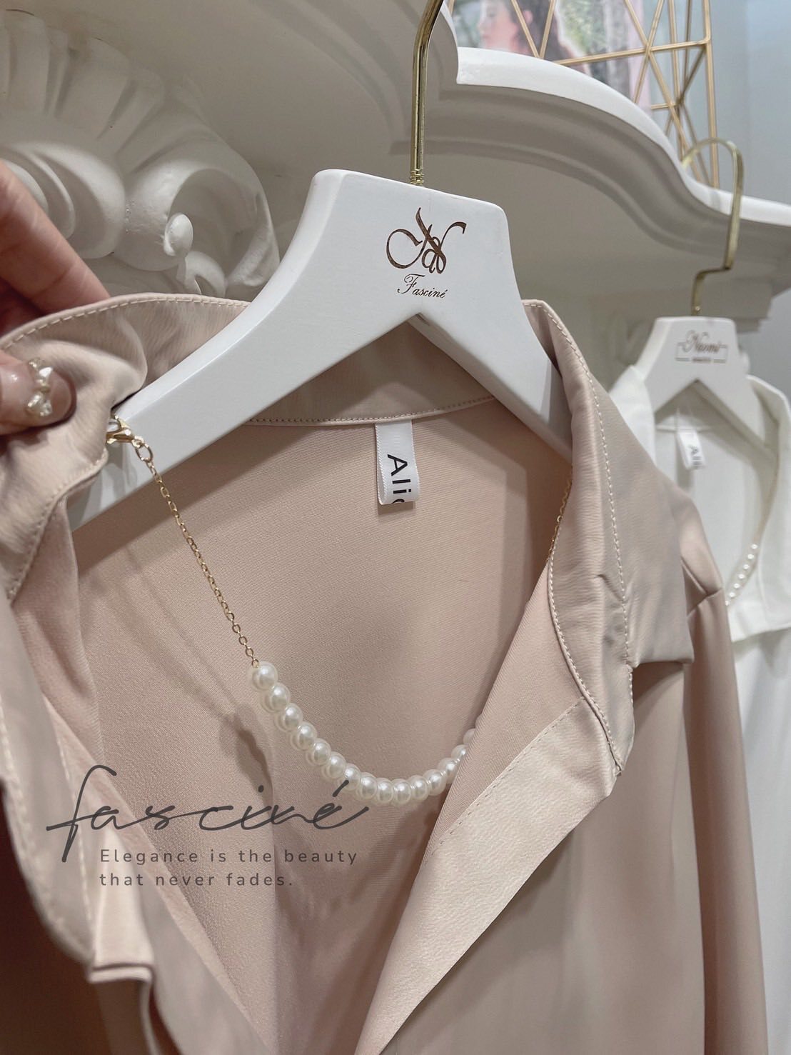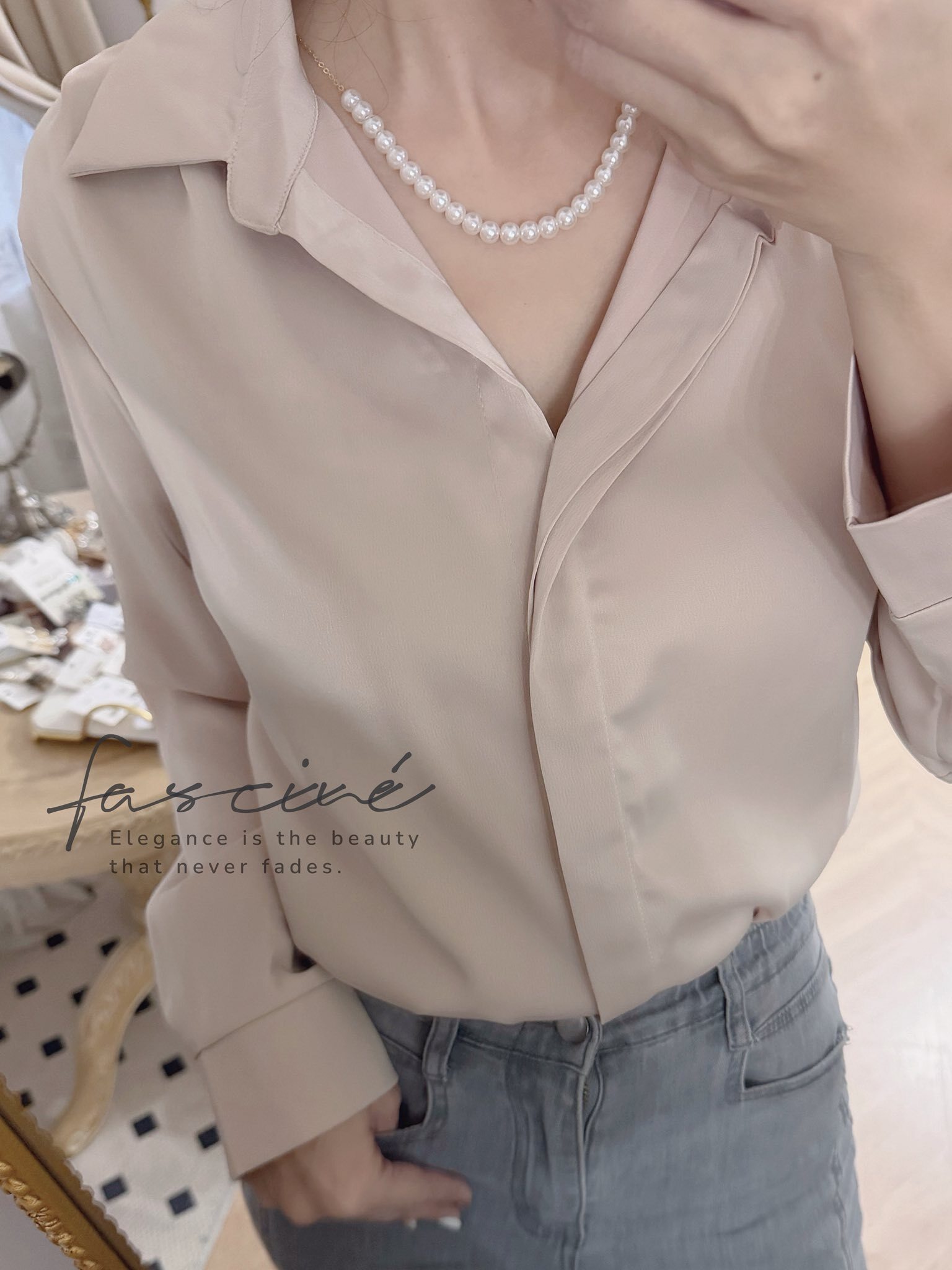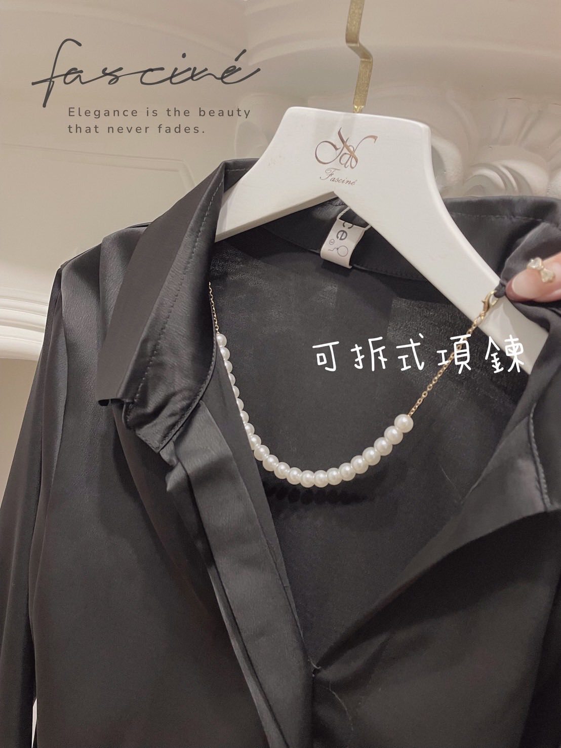 絲滑雪紡微光澤,V領修飾臉型;可拆珍珠鏈一秒切換優雅與極簡。隱形排釦與立體袖口,版型俐落不貼身,通勤約會一件搞定。