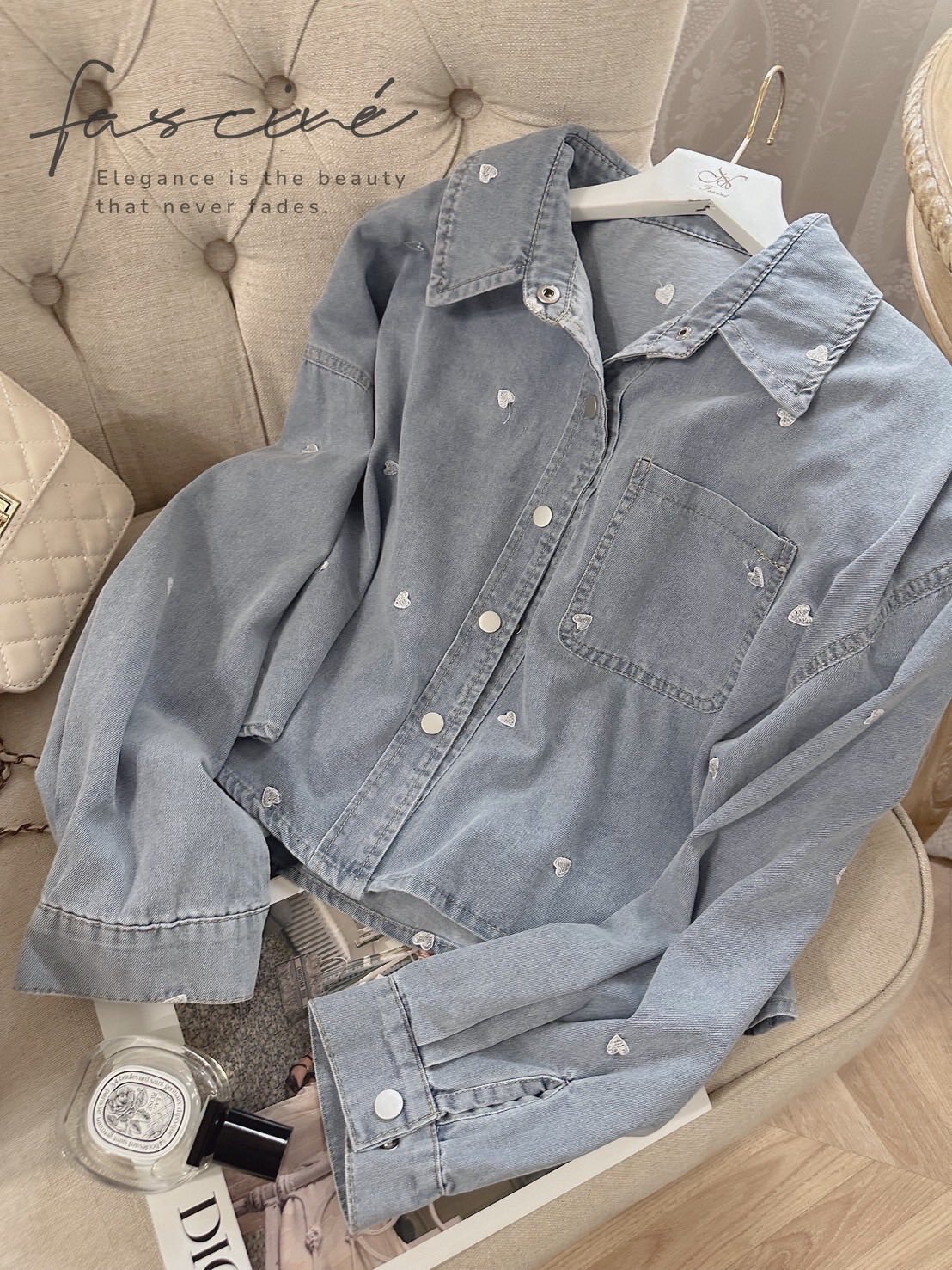 (10T21-25B)法式翻領貼袋甜美撞色愛心刺繡牛仔襯衫