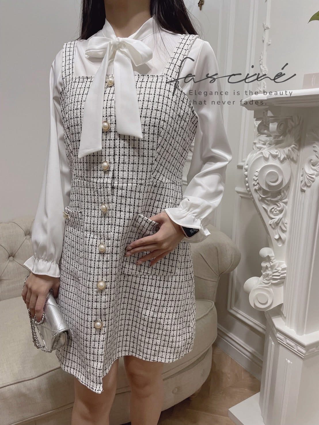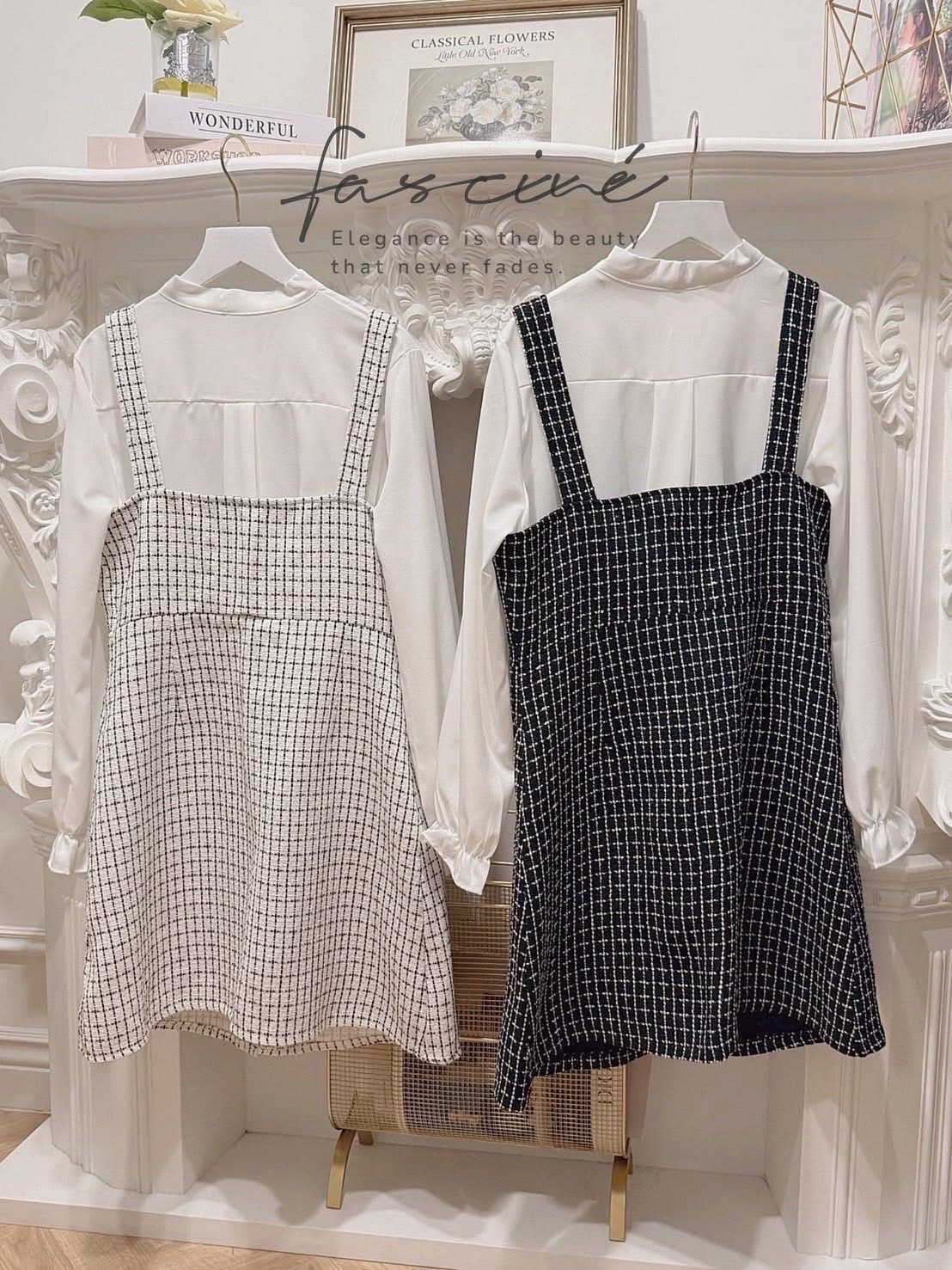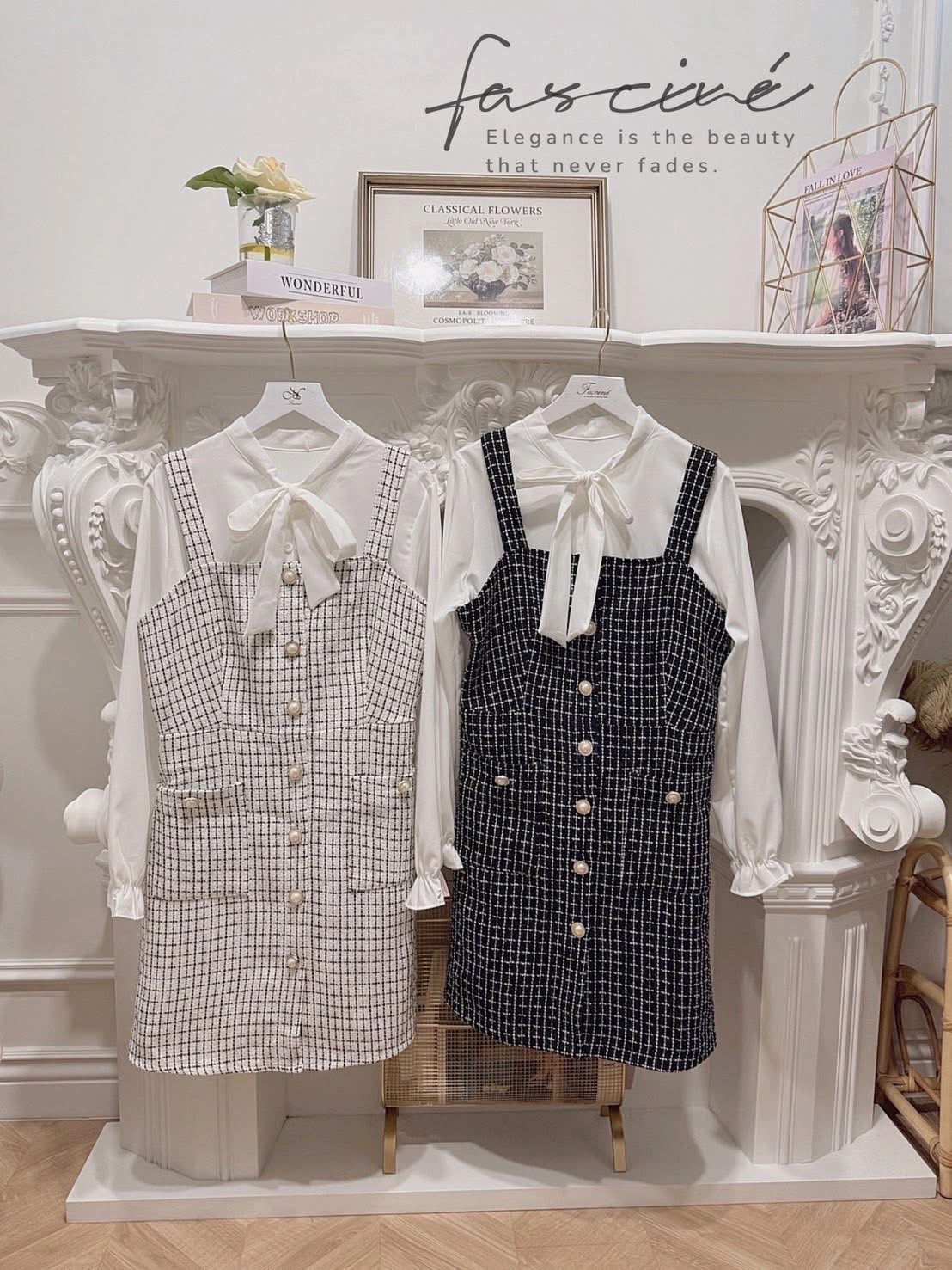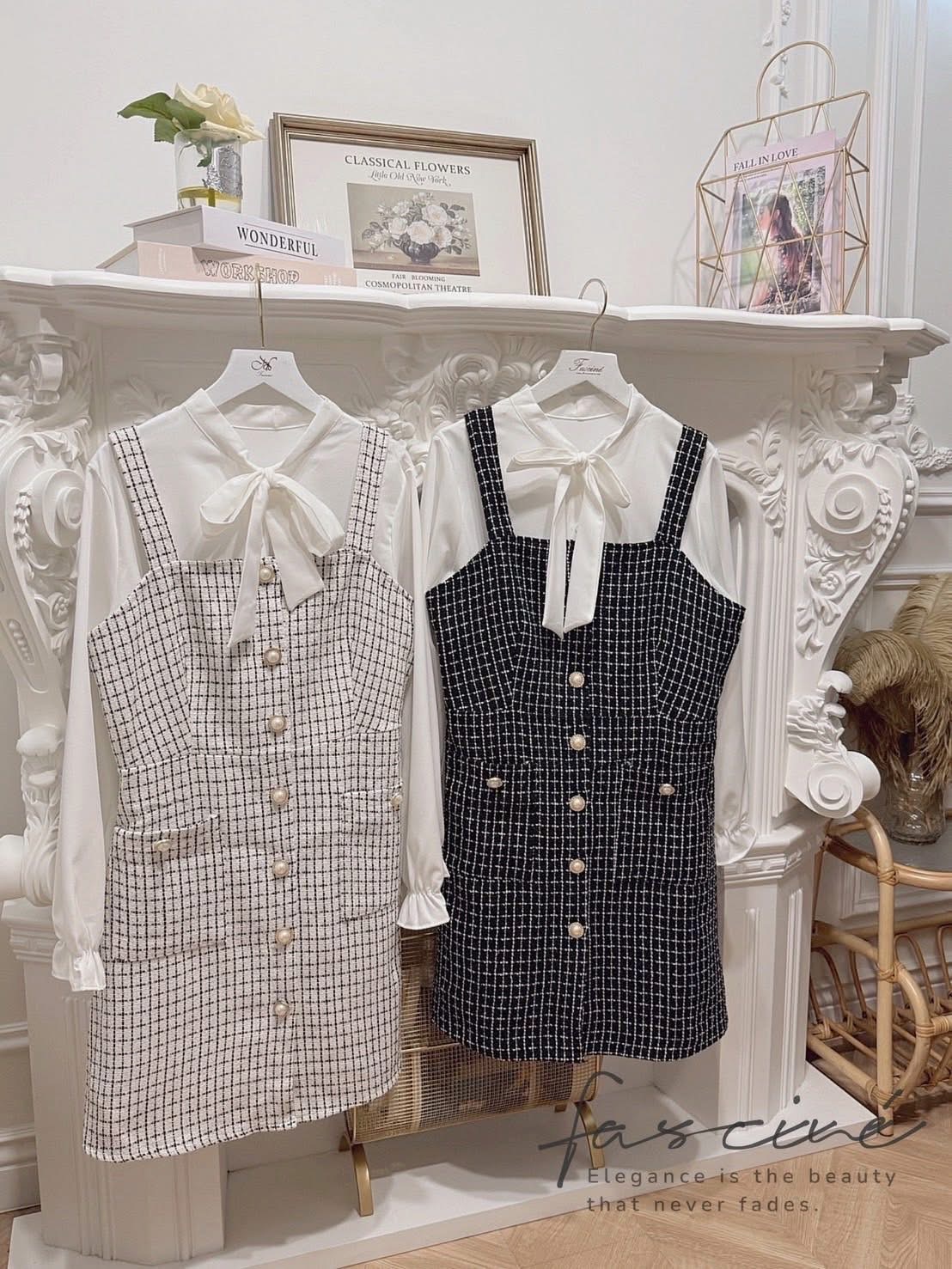 ✨𝒩𝑒𝓌 𝒜𝓇𝓇𝒾𝓋𝒶𝓁✨ (10T26-25)法式小香風名媛氣質蝴蝶結襯衫粗花呢格子吊帶連衣裙(兩件套)$890