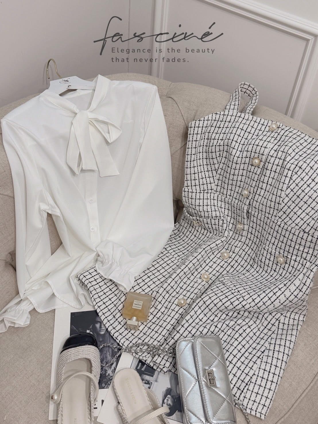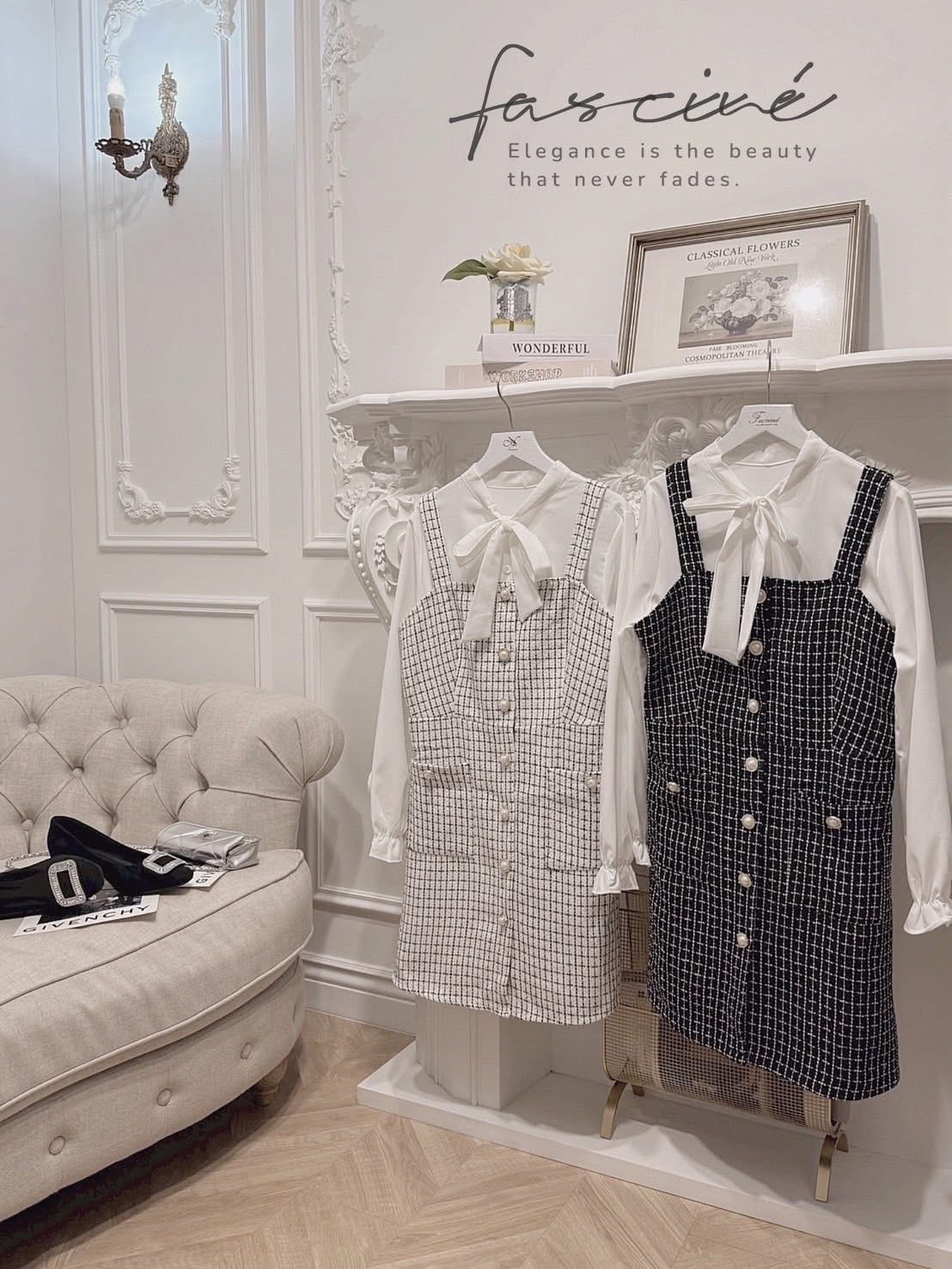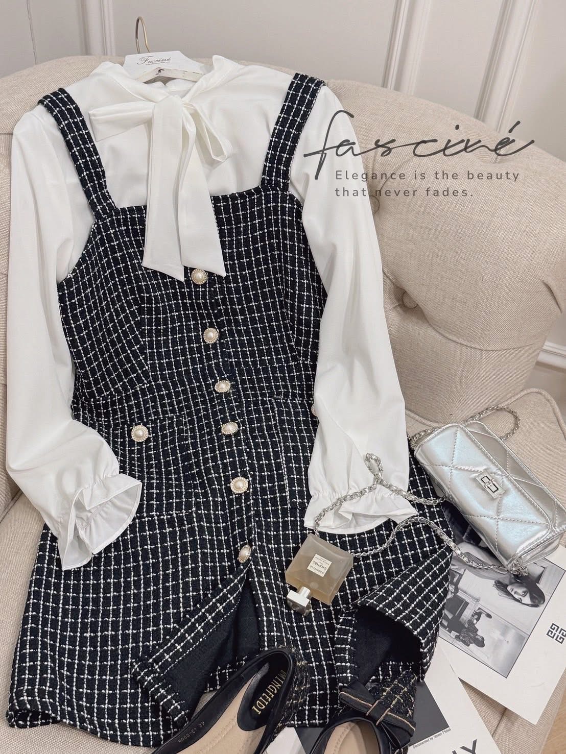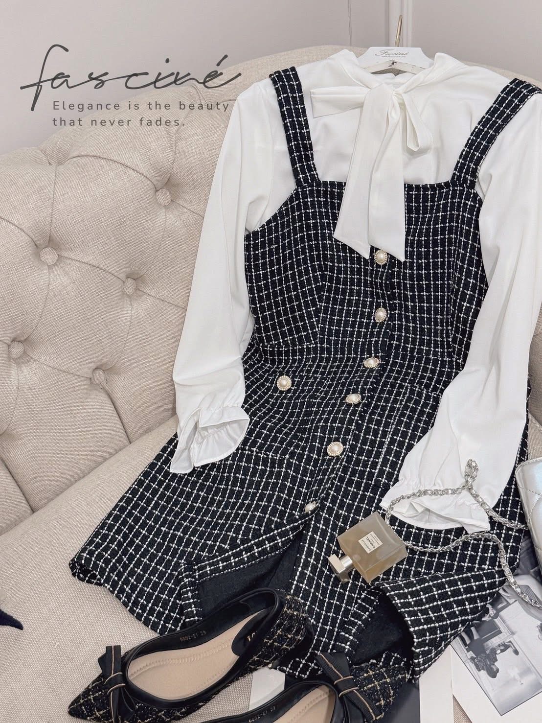 ✨𝒩𝑒𝓌 𝒜𝓇𝓇𝒾𝓋𝒶𝓁✨ (10T26-25)法式小香風名媛氣質蝴蝶結襯衫粗花呢格子吊帶連衣裙(兩件套)$890