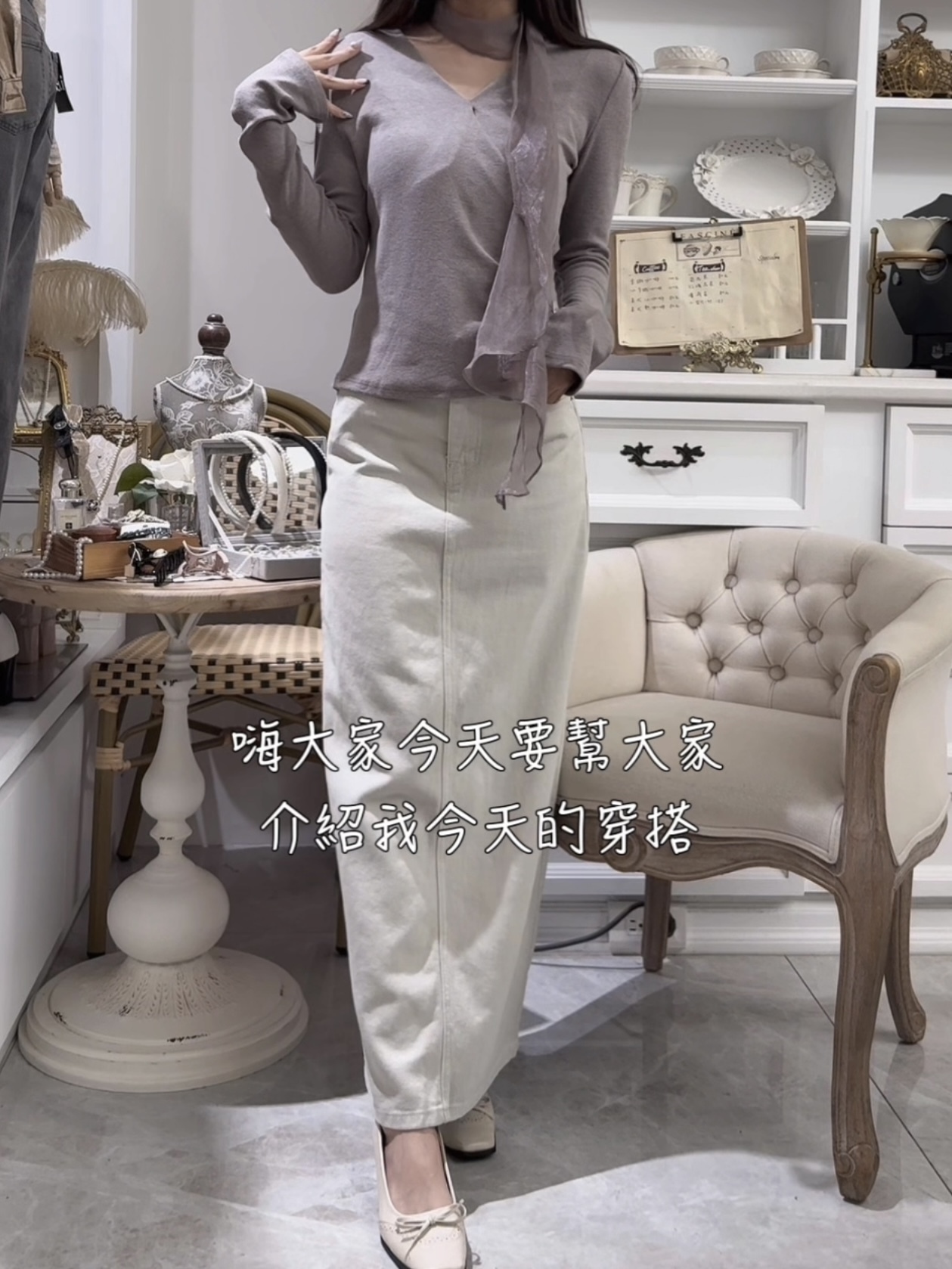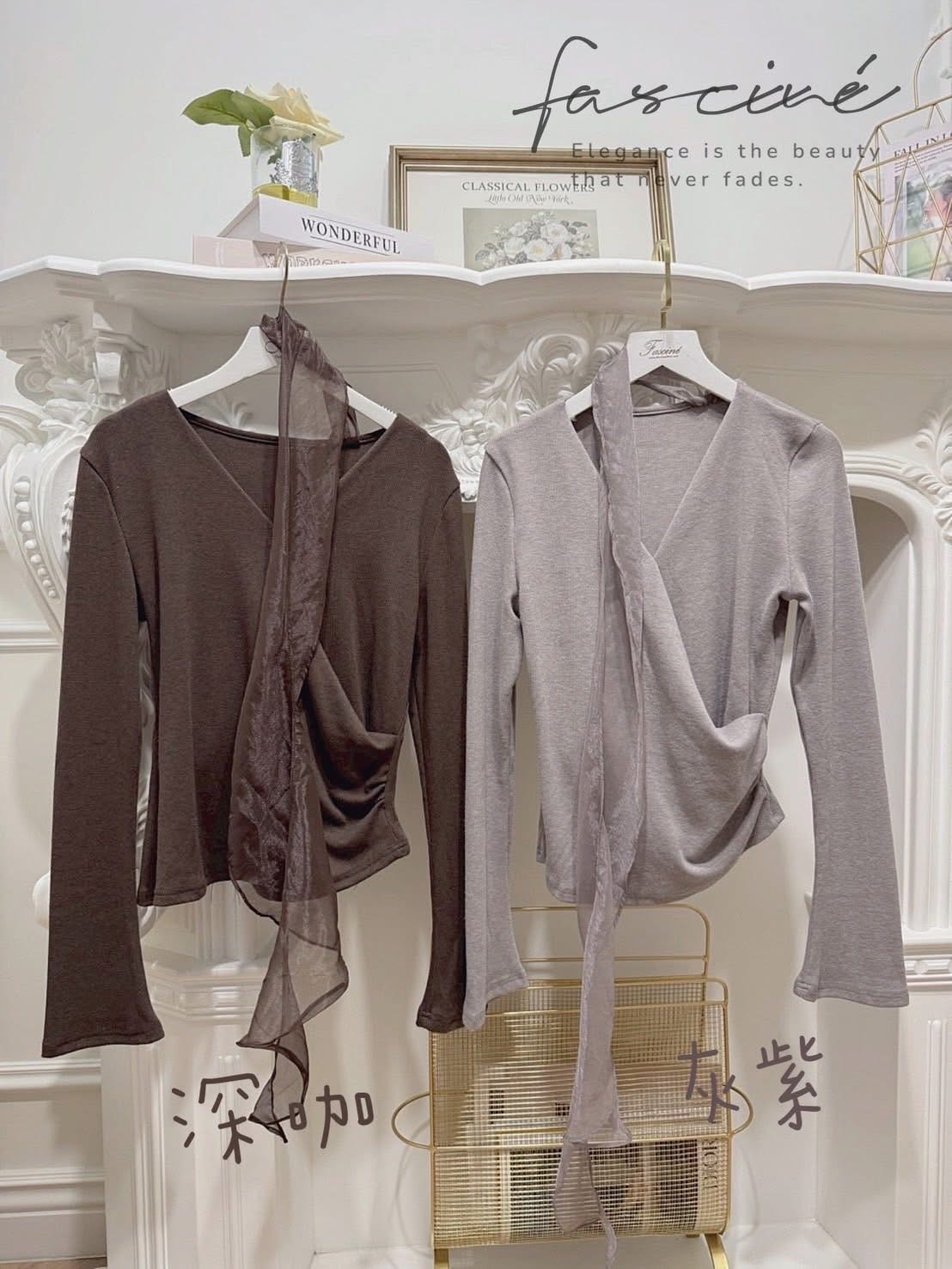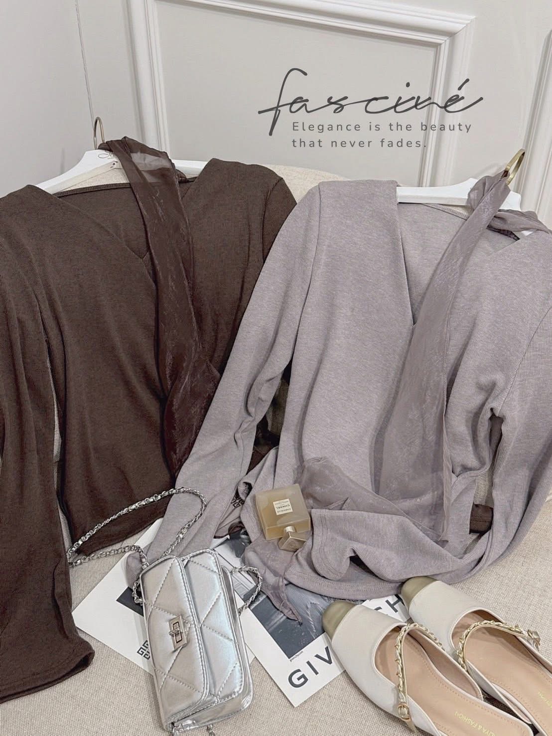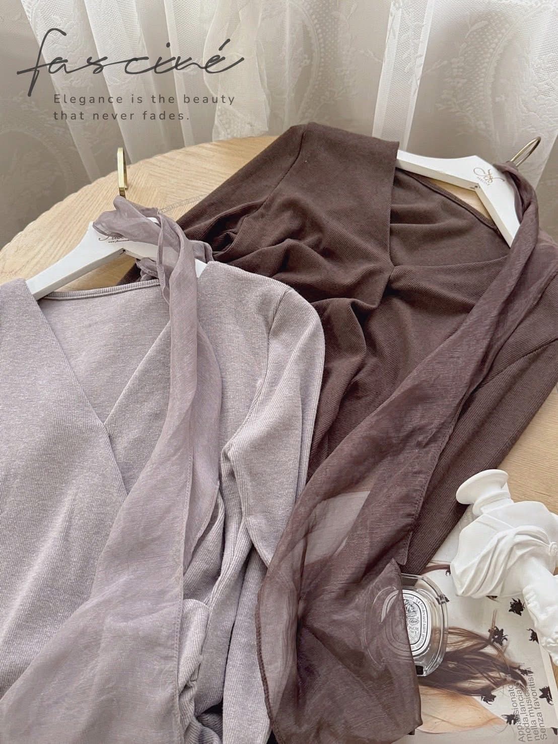 彈力細針織輕貼身形,V領修飾鎖骨與頸線,顯瘦不緊繃,霧透亮紗可繞頸、垂墜或打結,立現法式層次與氣質💕