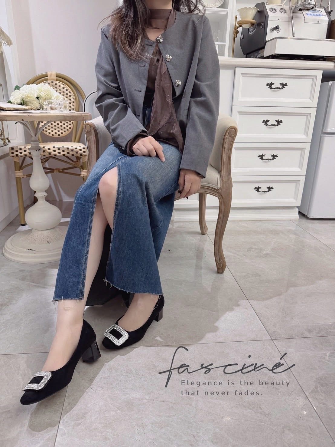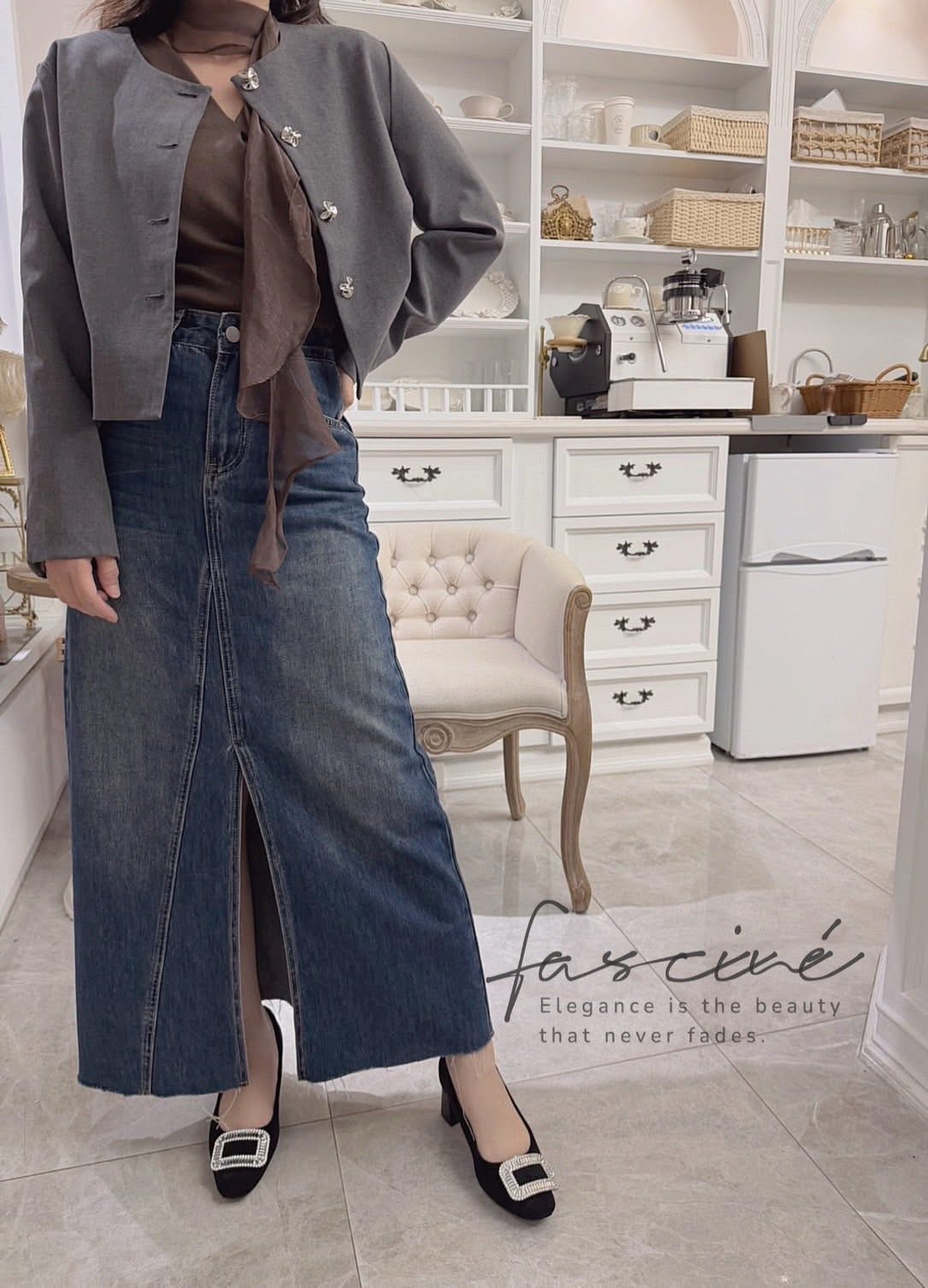 建議搭配短版挺肩外套+高腰開衩牛仔長裙+方鑽低跟鞋,比例出眾