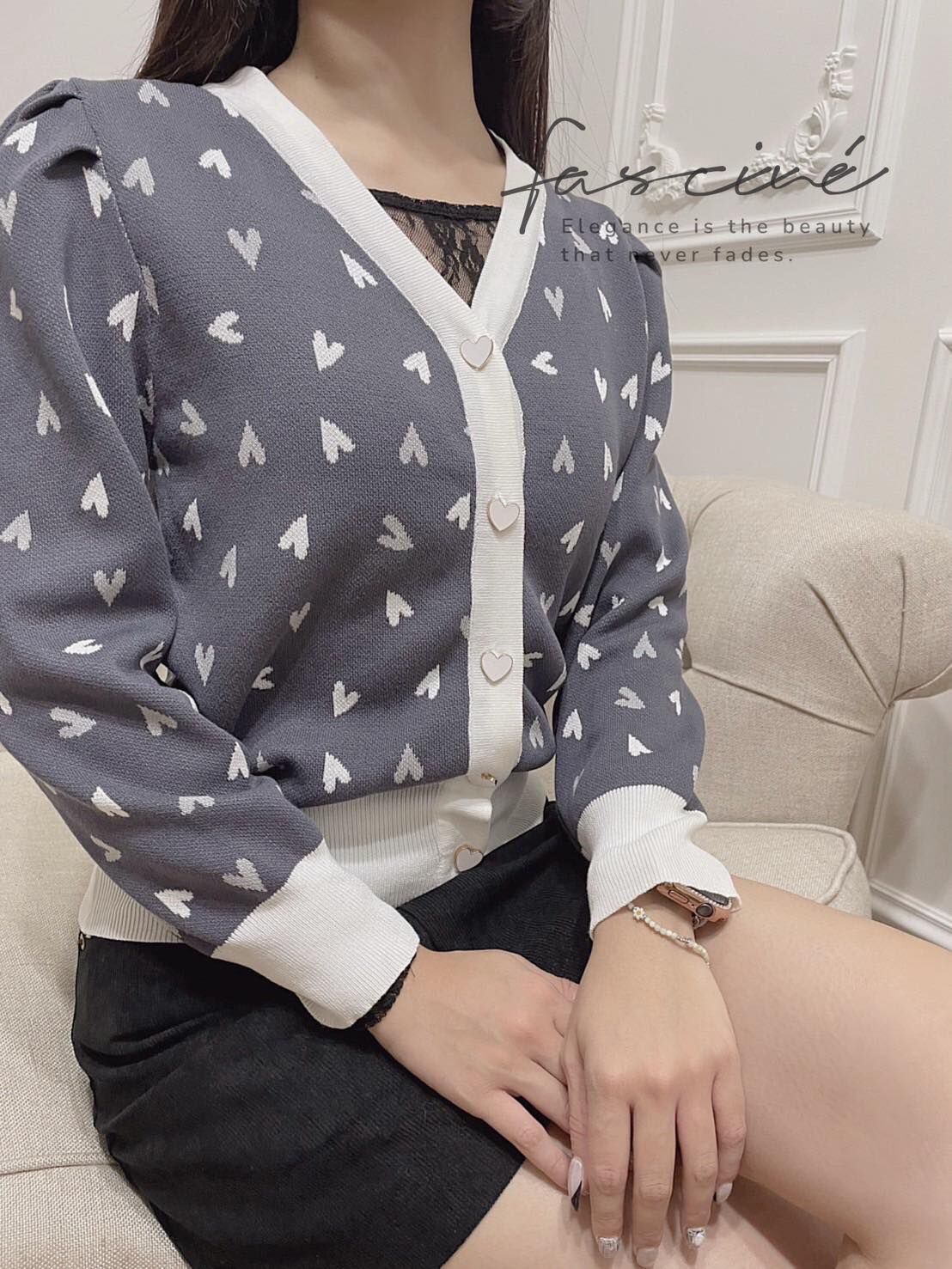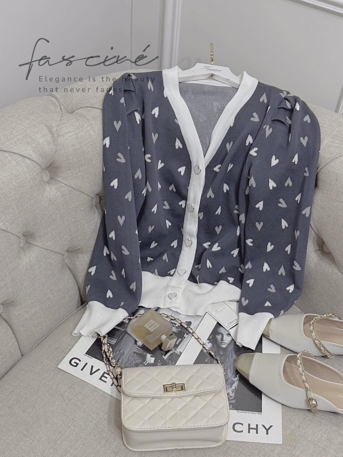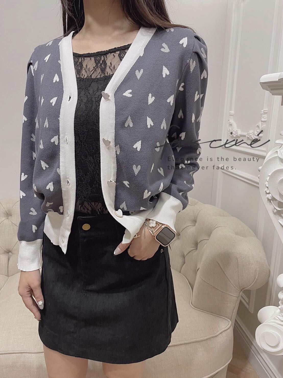 霧灰愛心鋪滿於細緻針織面,親膚輕盈不厚重,穿上即是法式溫柔濾鏡。對比白邊V領連結愛心鈕釦,微澎肩修飾頭肩比;短版比例更顯腿長與腰線。通勤、約會、出遊皆百搭,單穿當上衣或作薄外套都能快速完成甜雅造型。