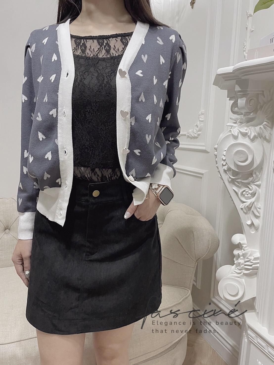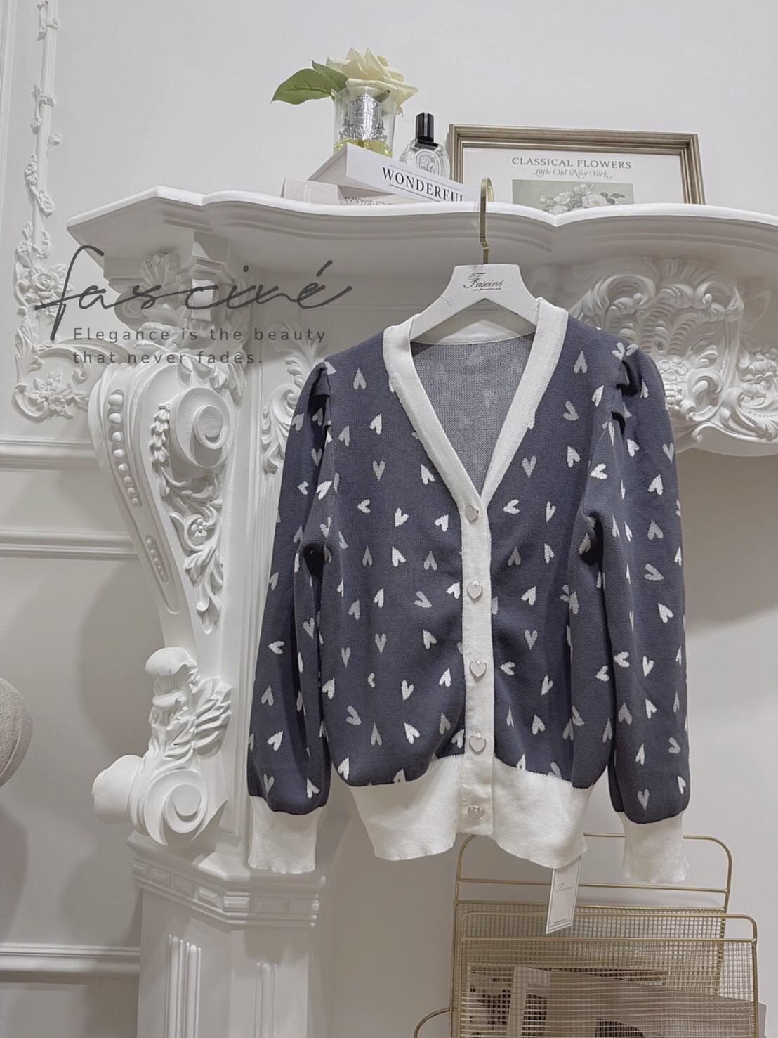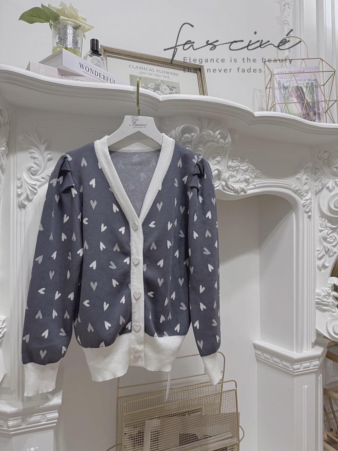 霧灰愛心鋪滿於細緻針織面,親膚輕盈不厚重,穿上即是法式溫柔濾鏡。對比白邊V領連結愛心鈕釦,微澎肩修飾頭肩比;短版比例更顯腿長與腰線。通勤、約會、出遊皆百搭,單穿當上衣或作薄外套都能快速完成甜雅造型。
