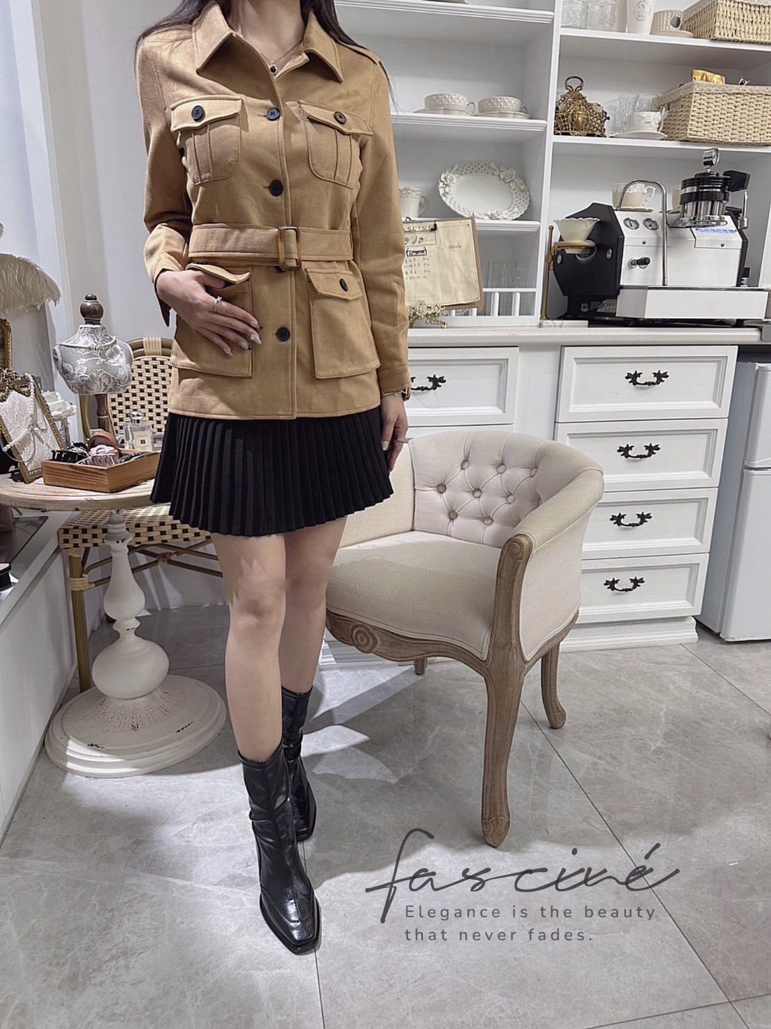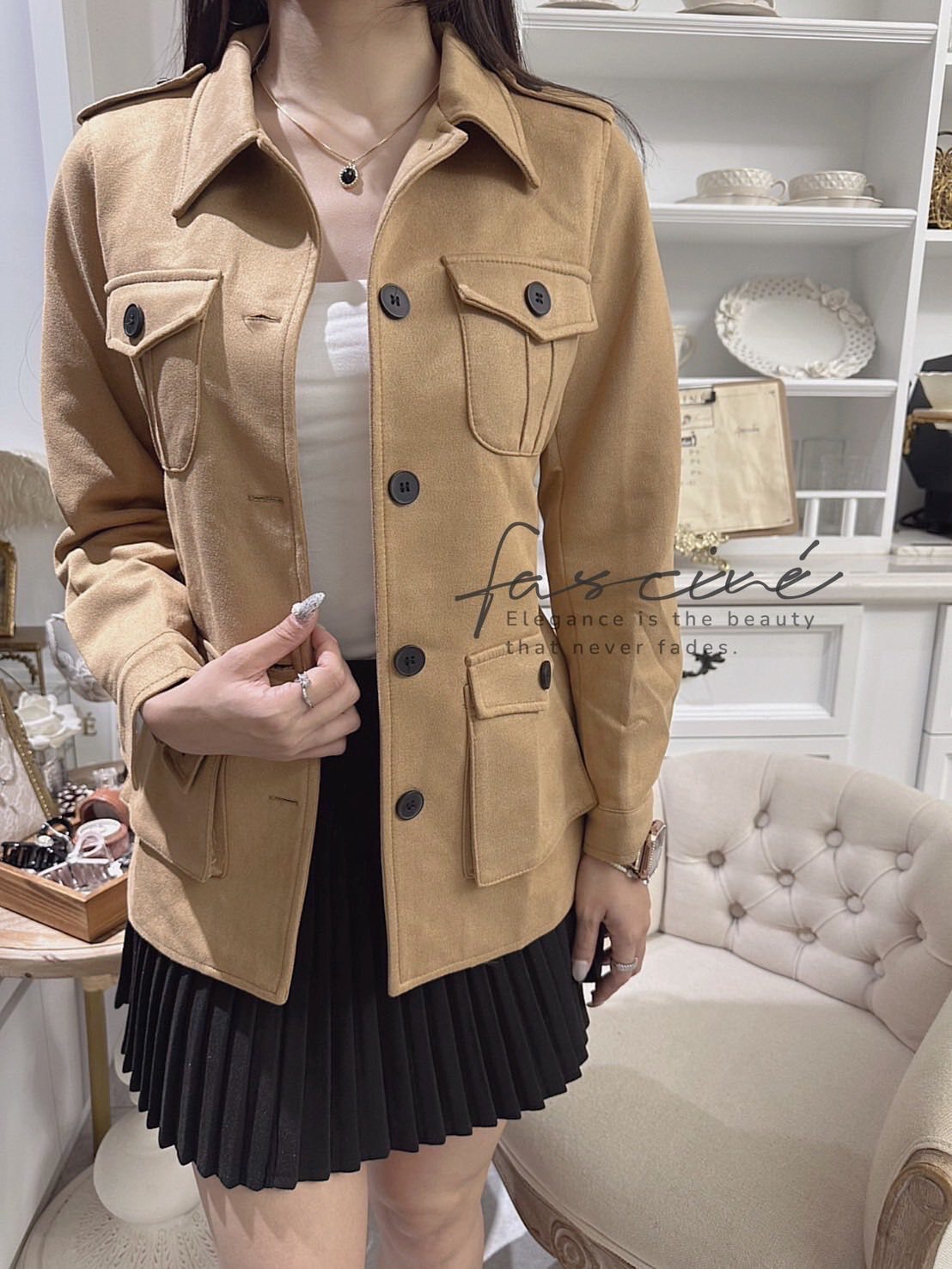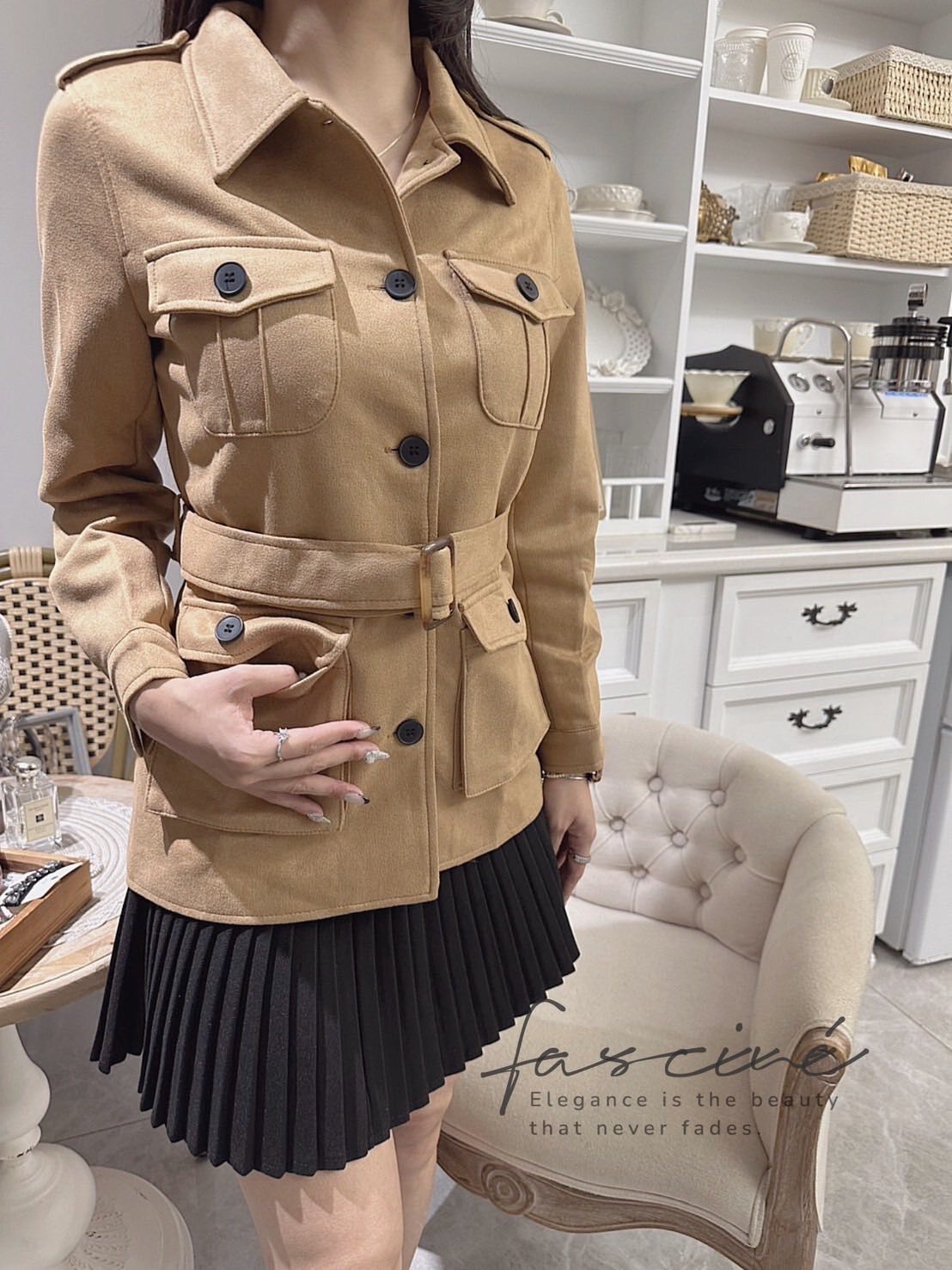 精緻的雙胸口立體貼袋設計,搭配經典排釦與可拆卸腰帶,讓妳隨心所欲打造收腰曲線或俐落廓形。柔軟的麂皮材質自帶絲滑光澤,觸感細膩舒適,營造低調奢華的氛圍。