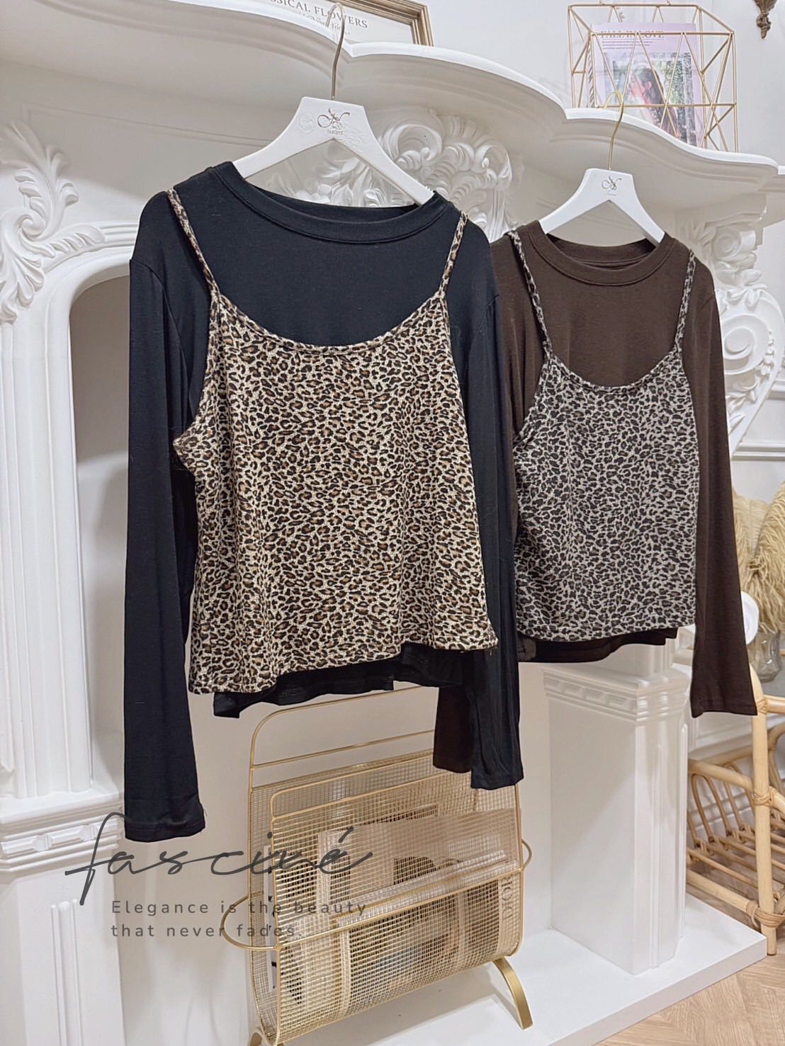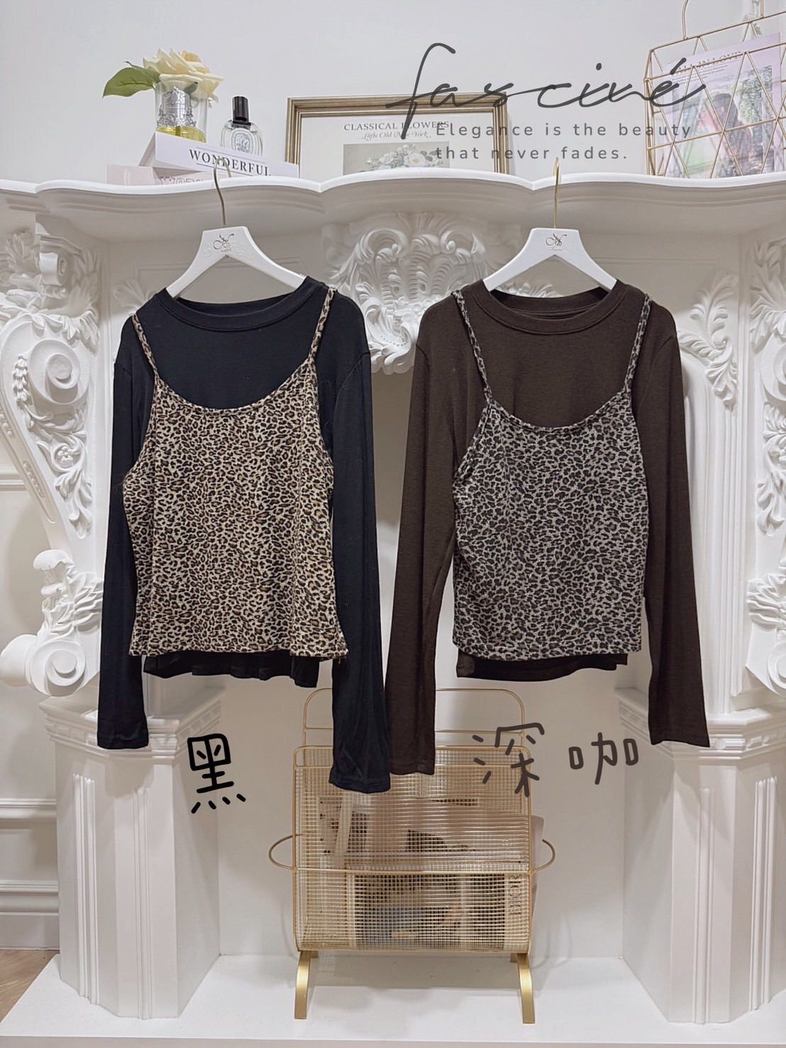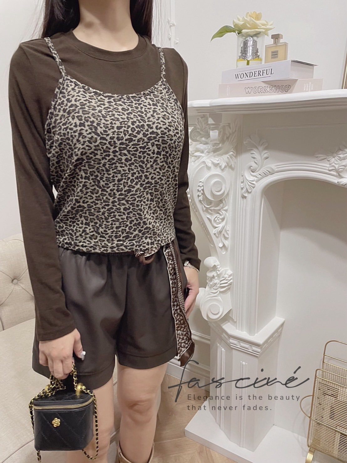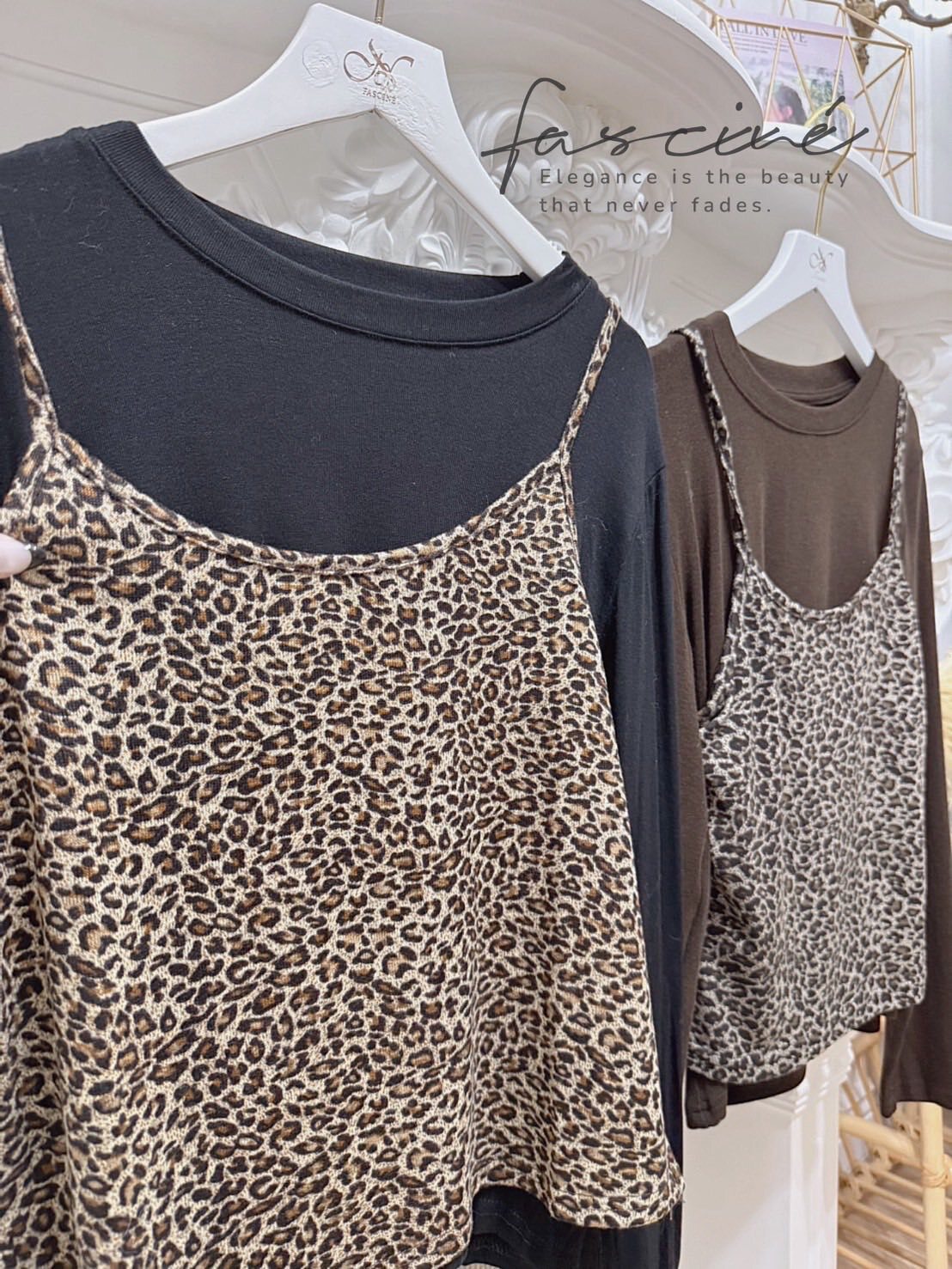 (10T96-25B)法式氣質疊穿豹紋吊帶背心簡約圓T恤(兩件套)