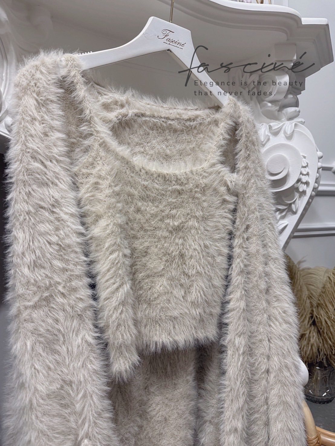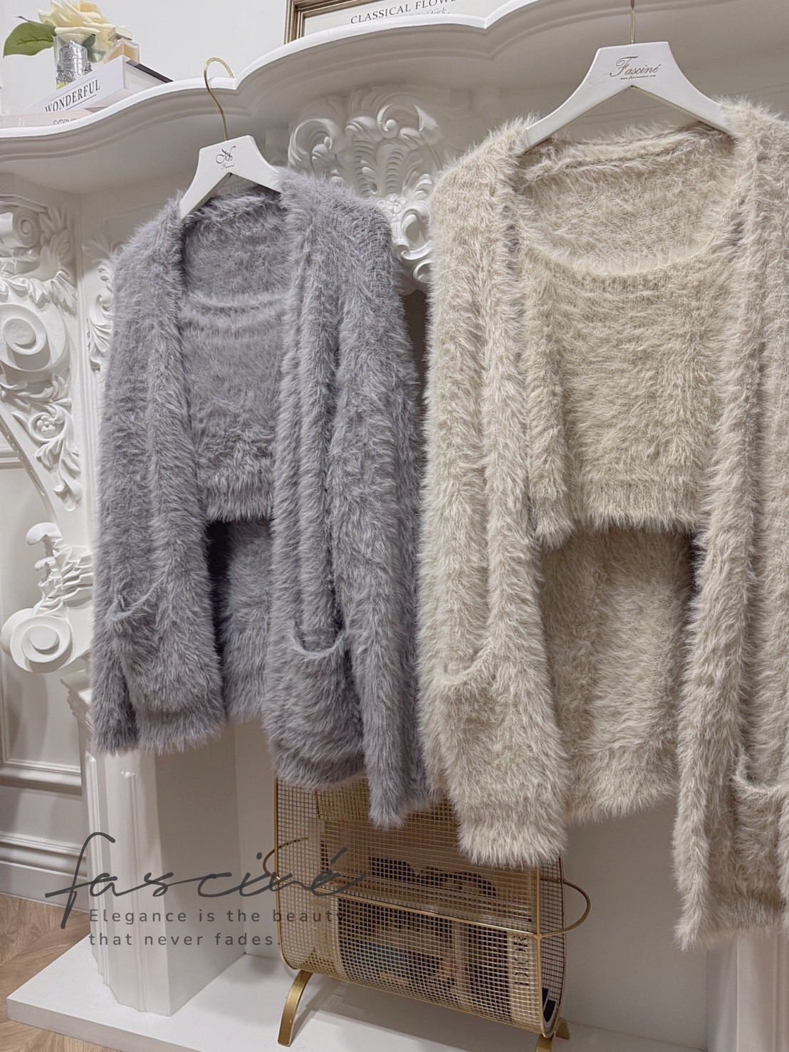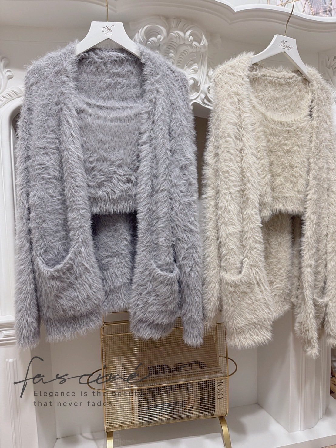 (11T06-25B) 法式名媛小香風毛衣開衫長款外搭軟糯仿貂絨針織外套+短背心(兩件套)$590