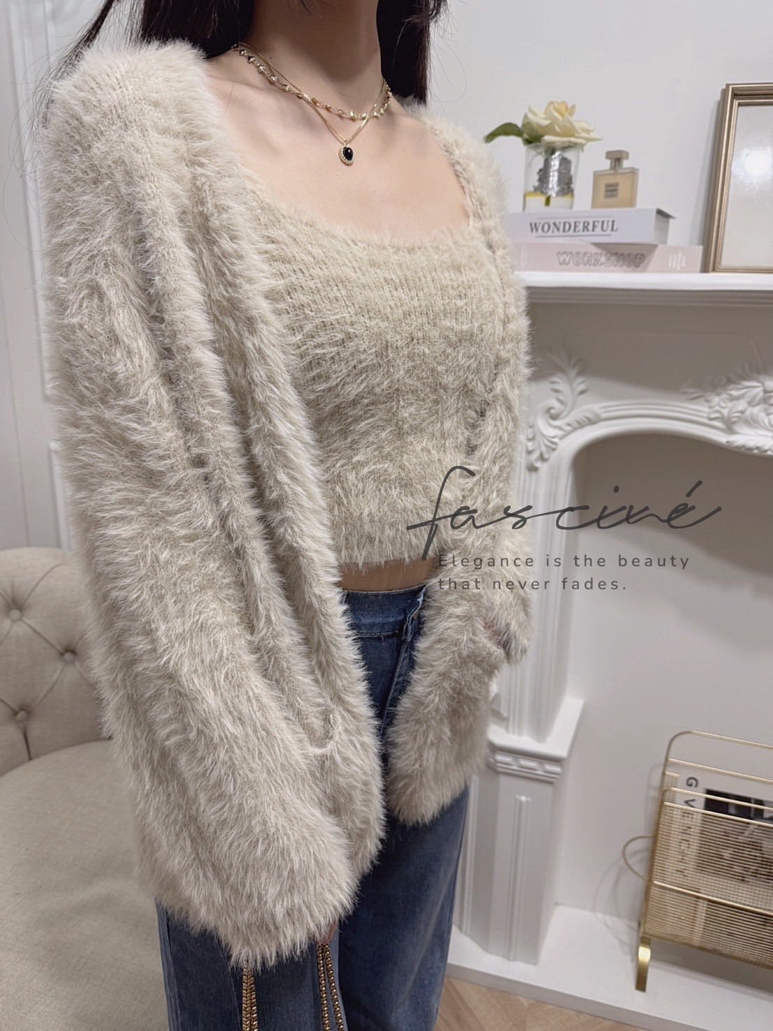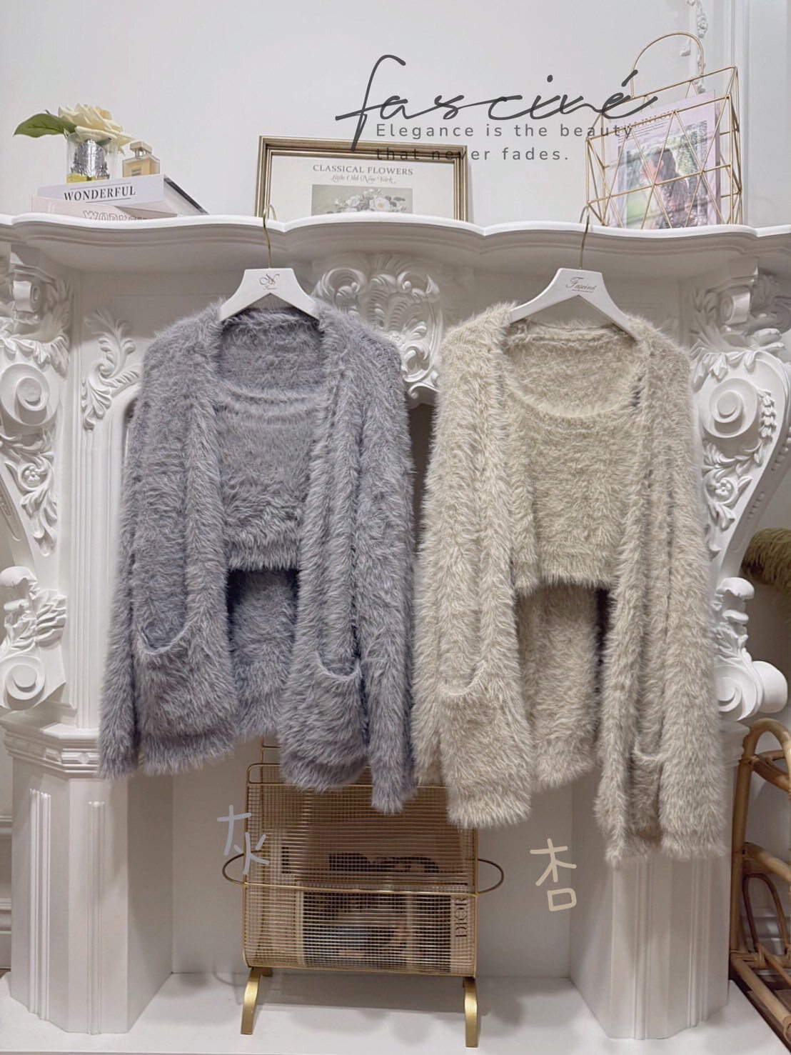 法式名媛小香風毛衣開衫長款外搭軟糯仿貂絨針織外套+短背心(兩件套)$590