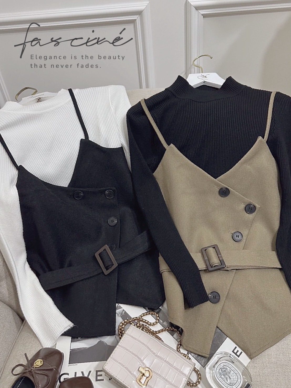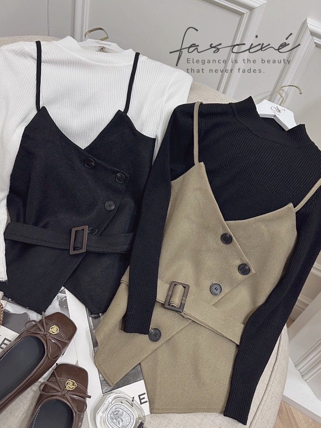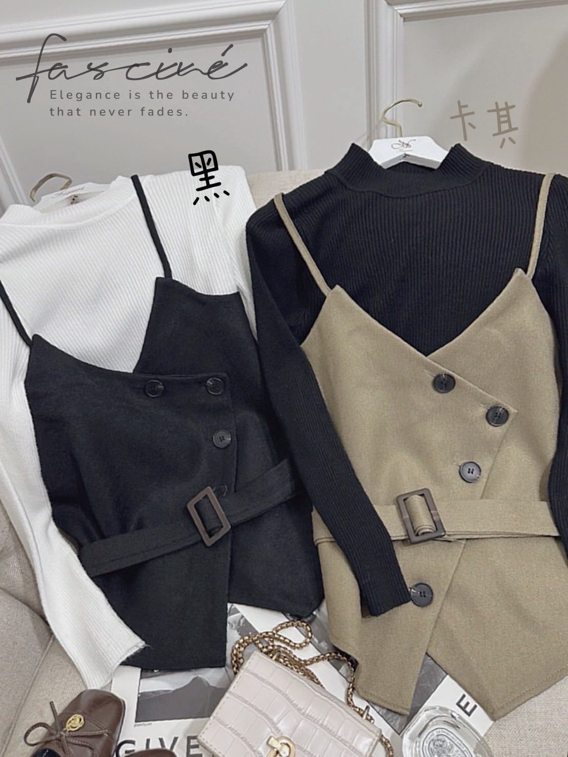 (11T06-25B) 法式輕奢風時尚氣質吊帶馬甲+修身針織上衣(兩件套)