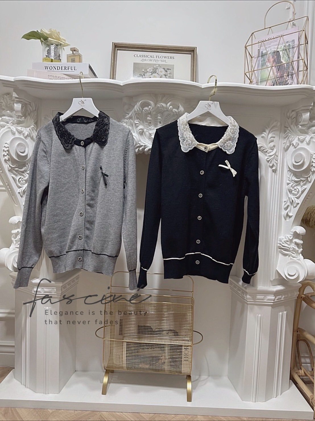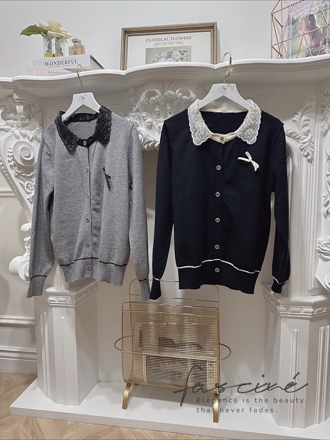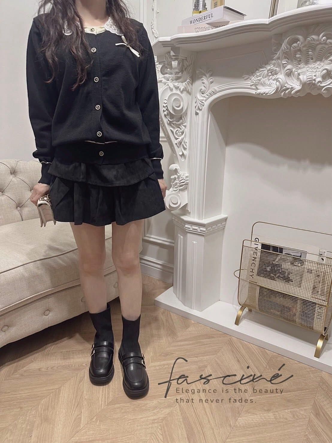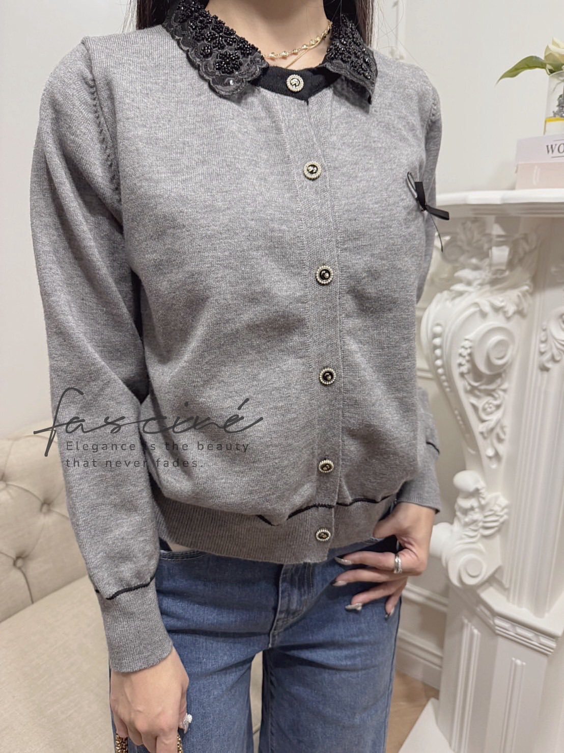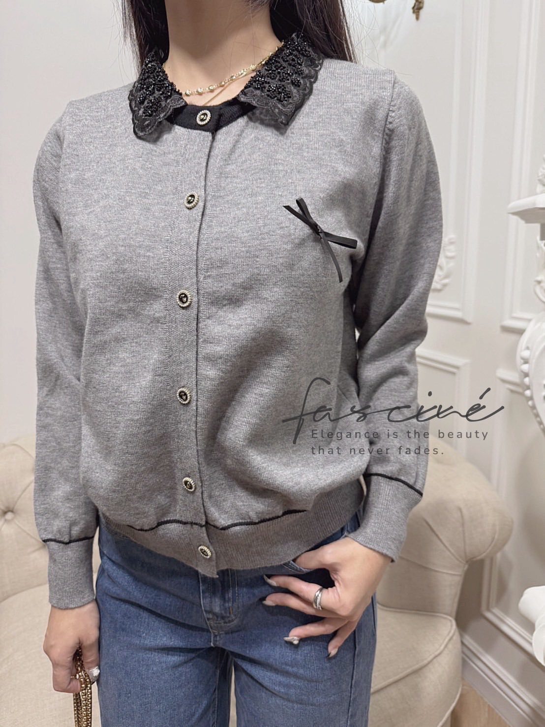 閃耀珠繡蕾絲娃娃領映亮膚色與氣質,一穿即散發法式優雅氛圍。胸前緞帶蝴蝶結搭配復古金釦,細節滿分,通勤到約會都自帶焦點。微鬆版型結合彈力針織不緊繃,袖口與下擺滾邊修飾比例,單穿外搭皆出色。