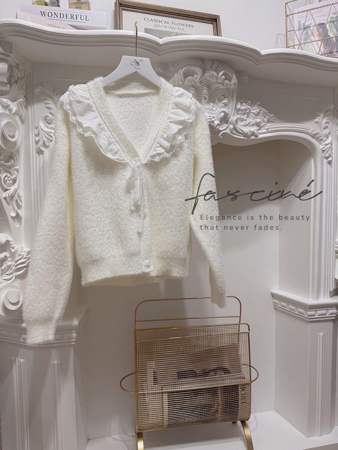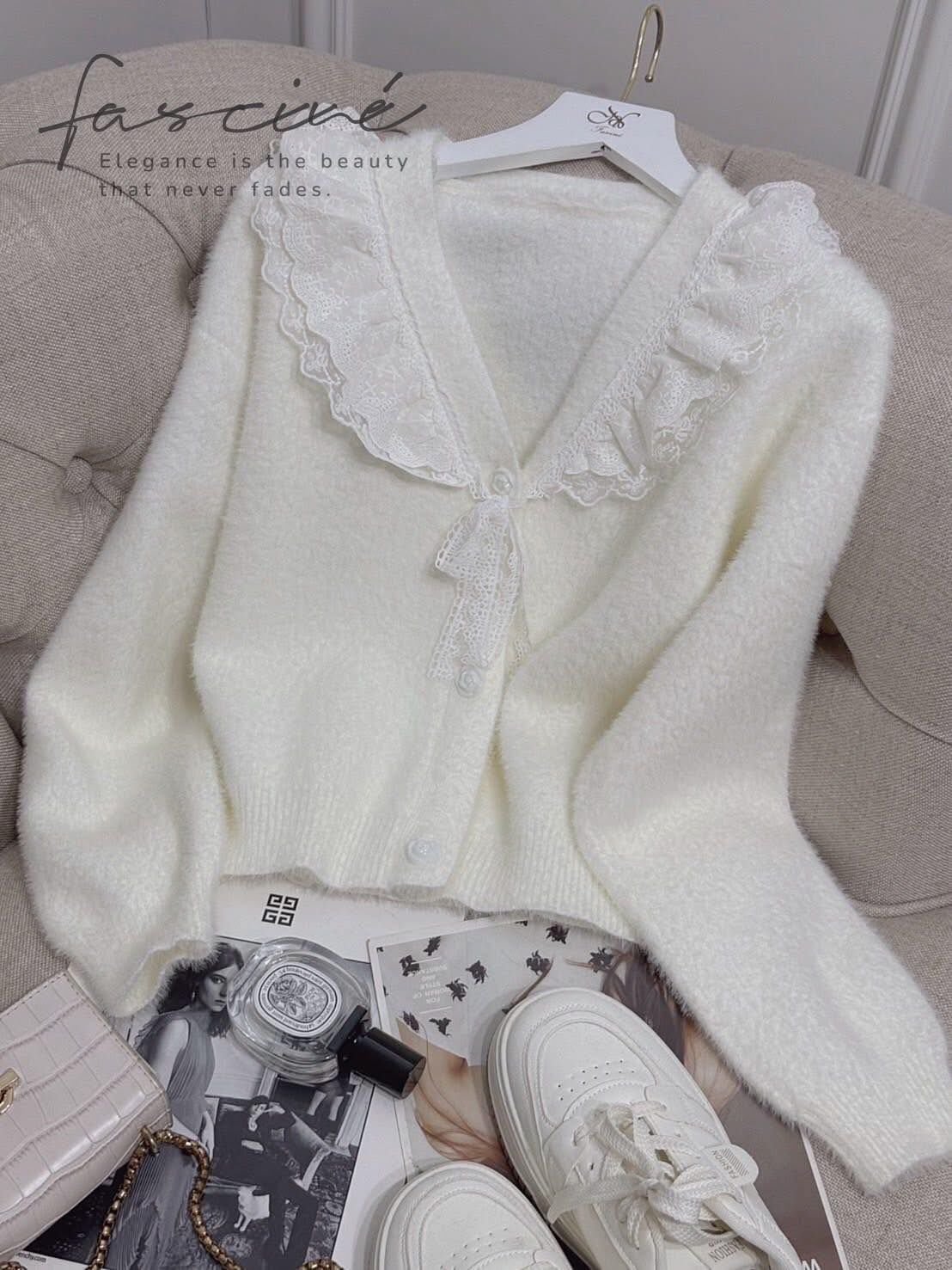 (11T18-25)法式慵懶娃娃領水貂絨軟糯蕾絲V領甜美針織毛衣上衣$590