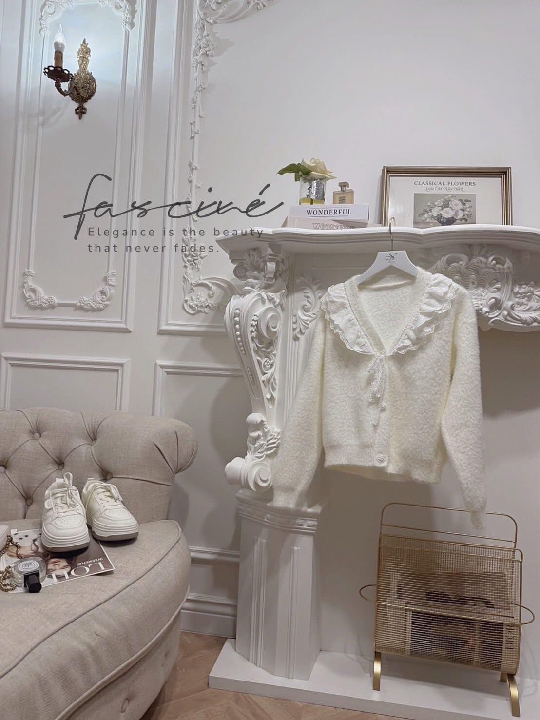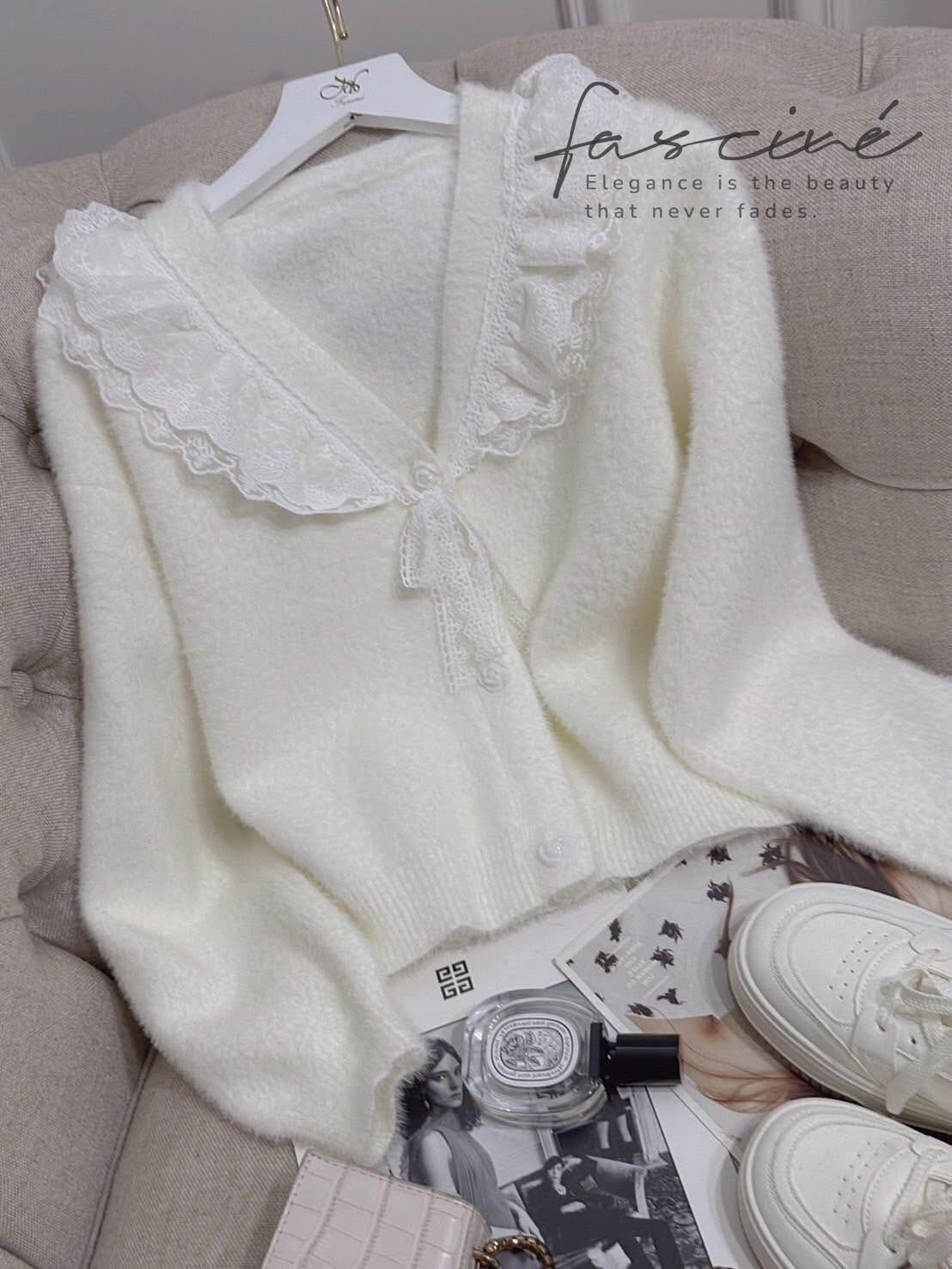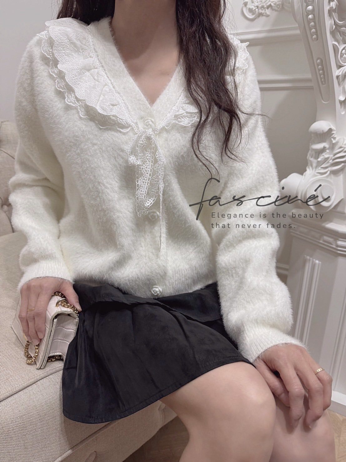 軟糯水貂絨觸感輕盈不厚重,親膚不刺癢,穿上就是奶霜級柔軟與溫度。蕾絲荷葉娃娃領結合V領修飾臉部與頸線,單穿甜美,外搭大衣依然亮眼。