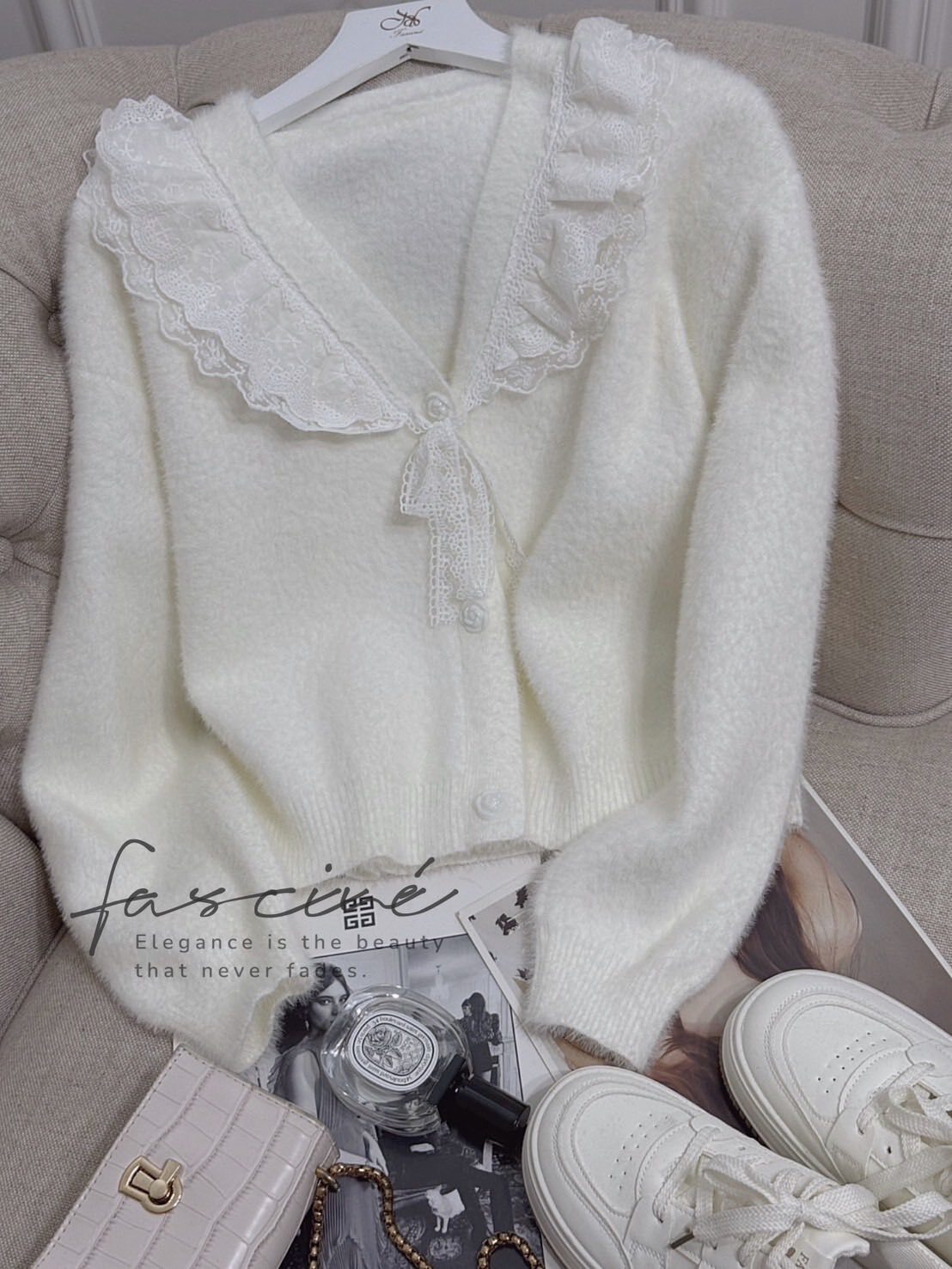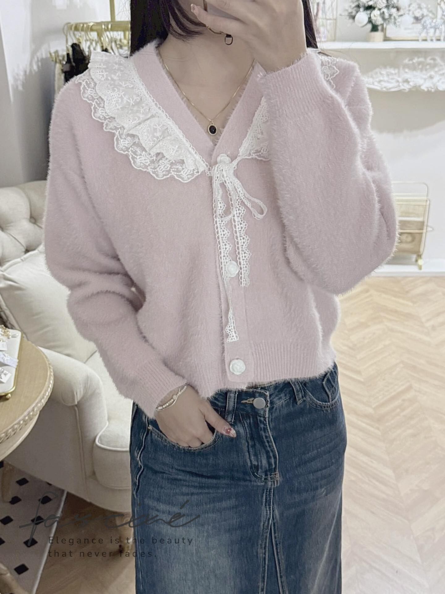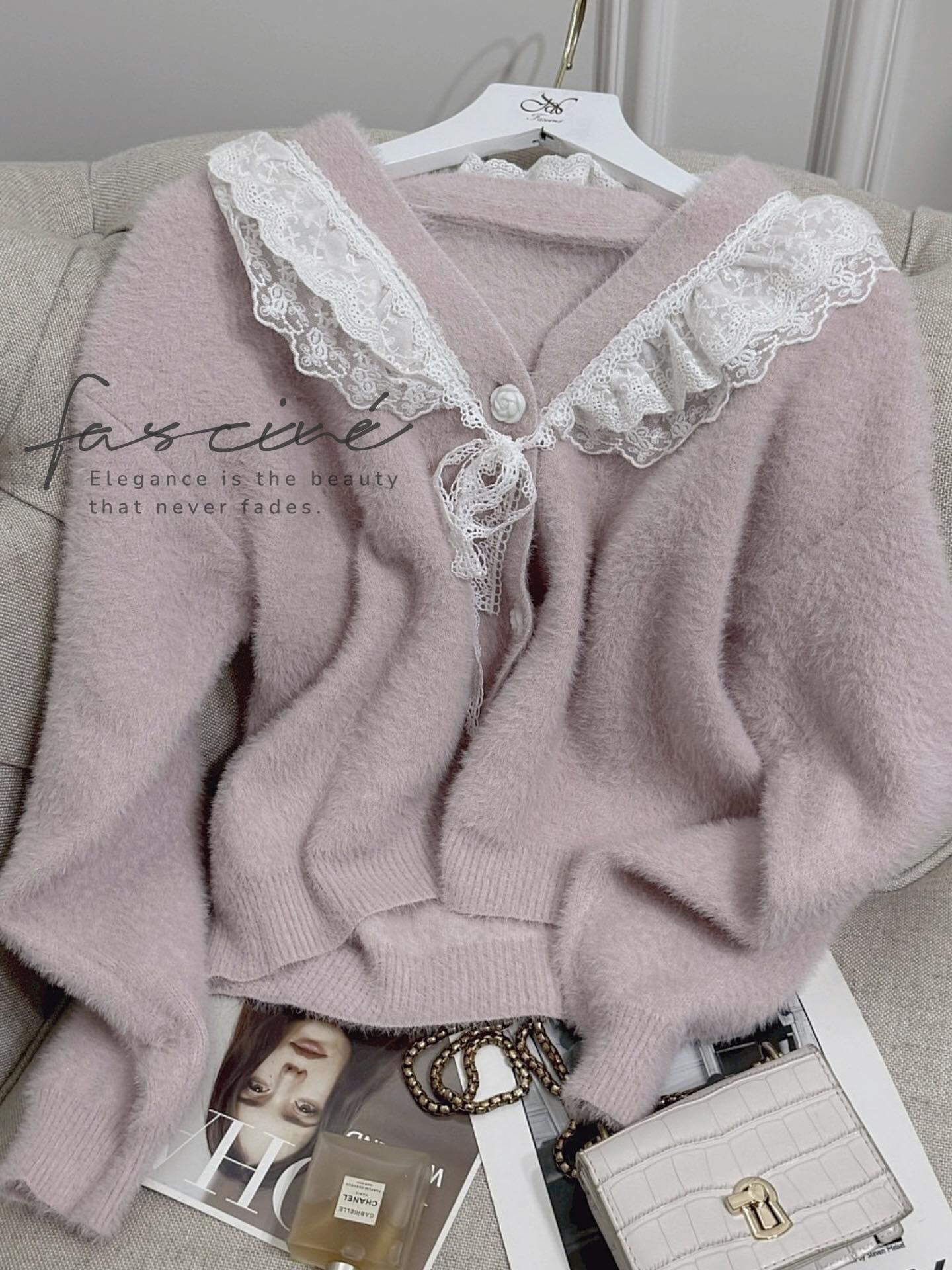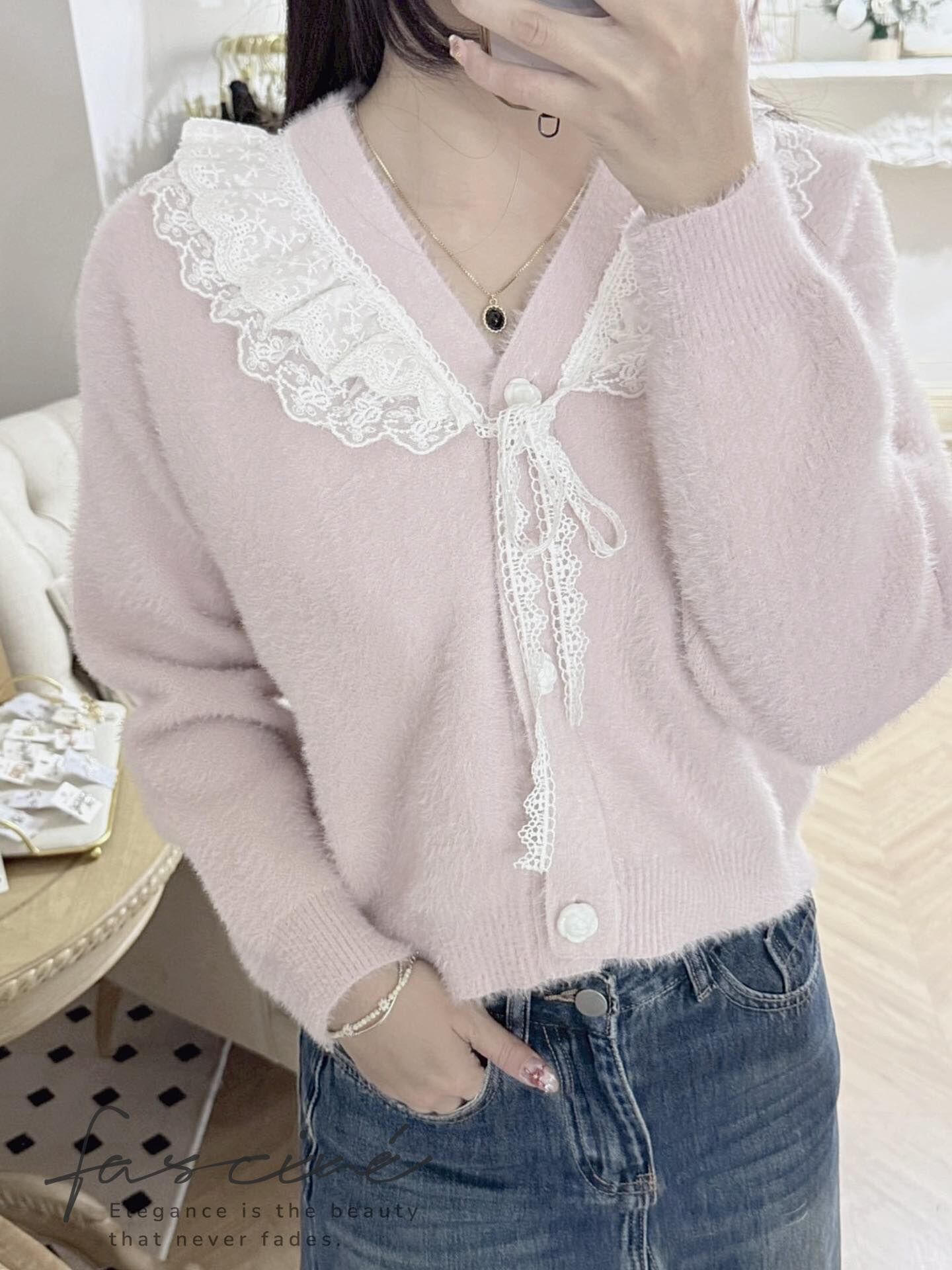 (11T18-25)法式慵懶娃娃領水貂絨軟糯蕾絲V領甜美針織毛衣上衣
