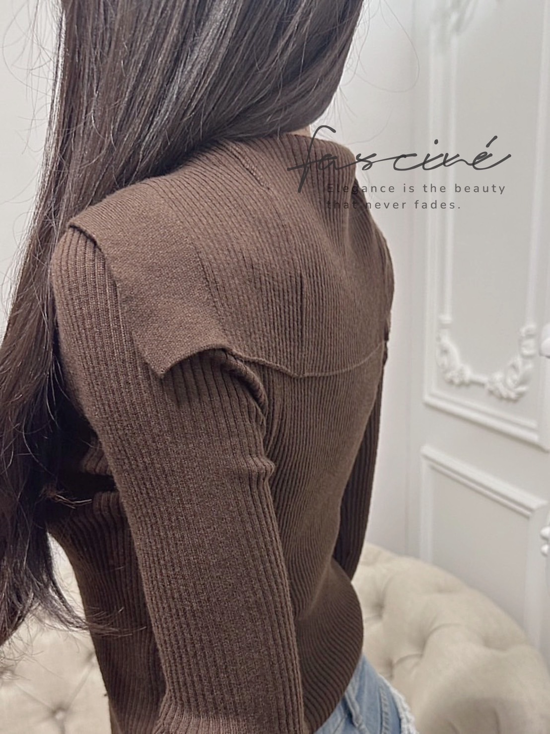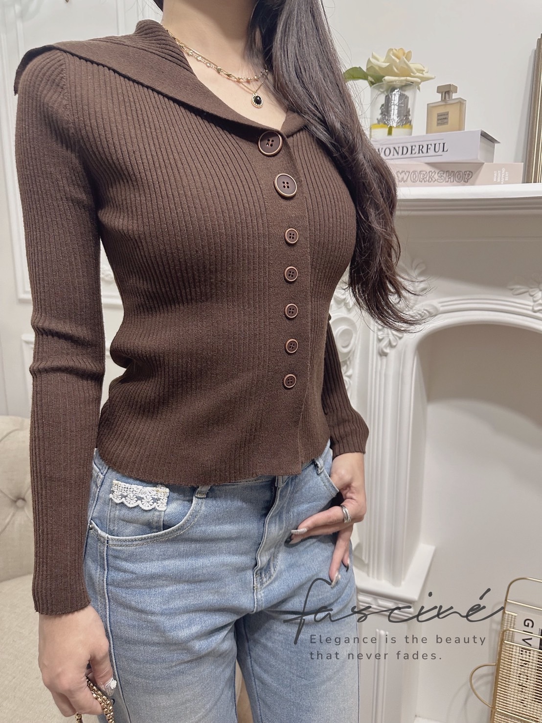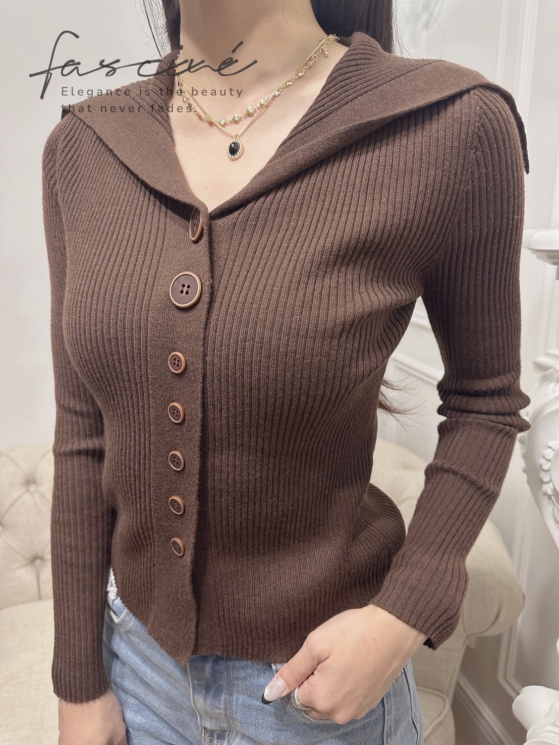 海軍領優雅延展至後肩,視覺拉長頸線,咖啡調針織自帶法式溫柔與質感。  柔彈羅紋貼合曲線、下擺微弧更顯比例,輕鬆駕馭高腰下裝與各式外套。