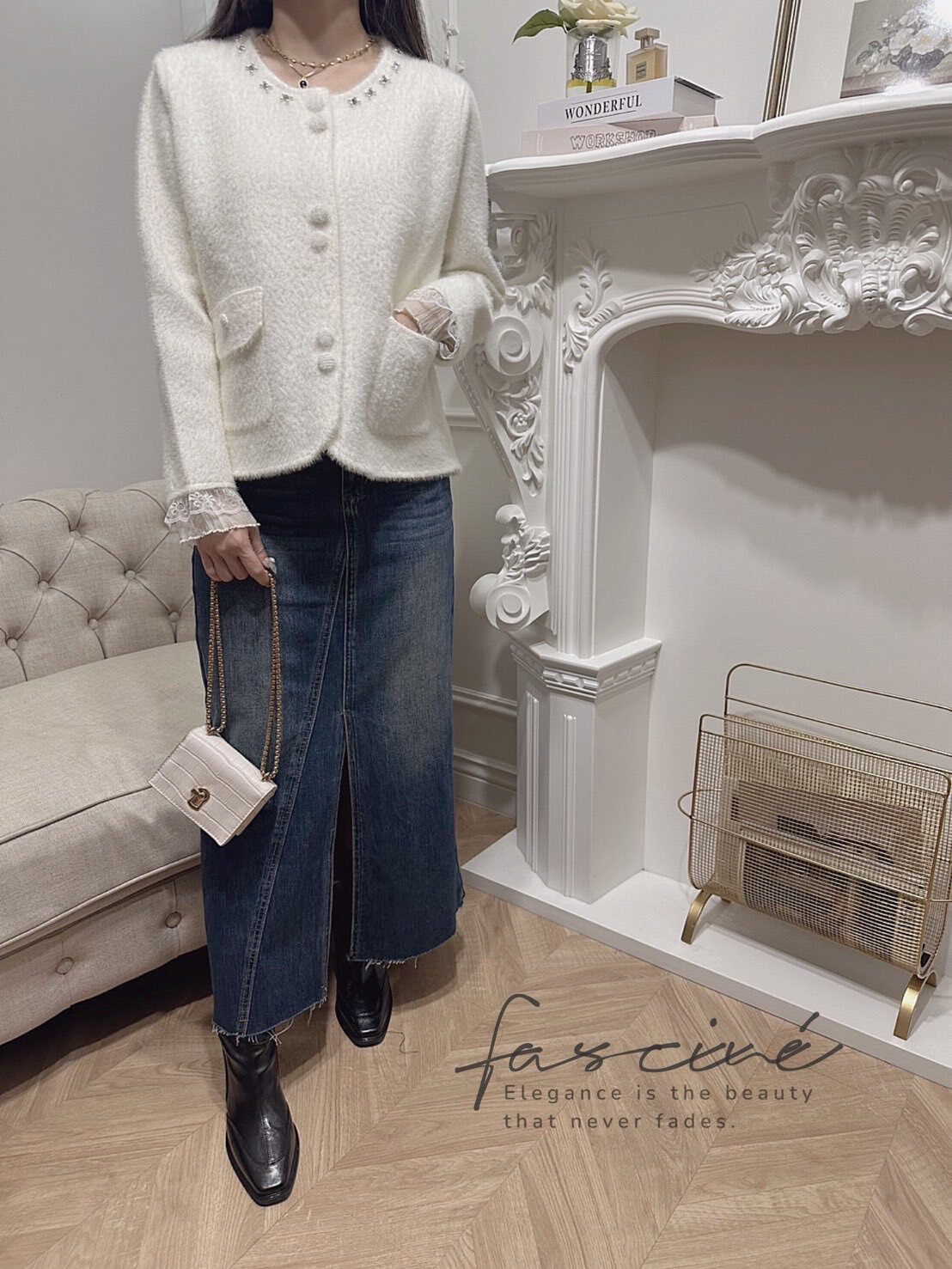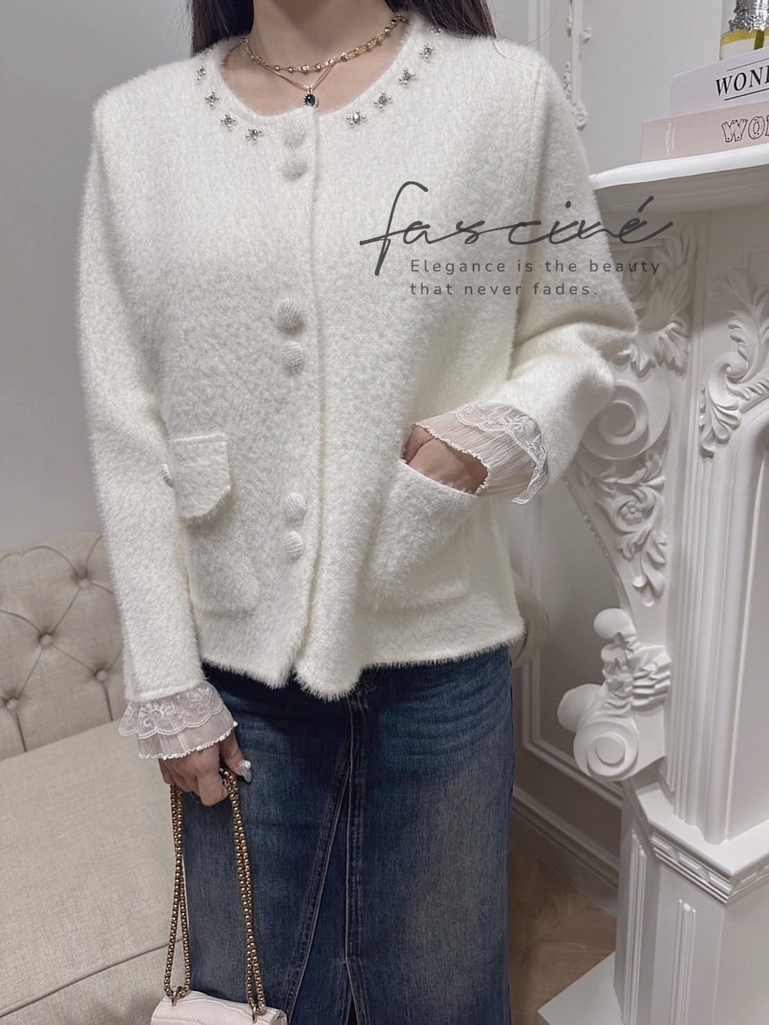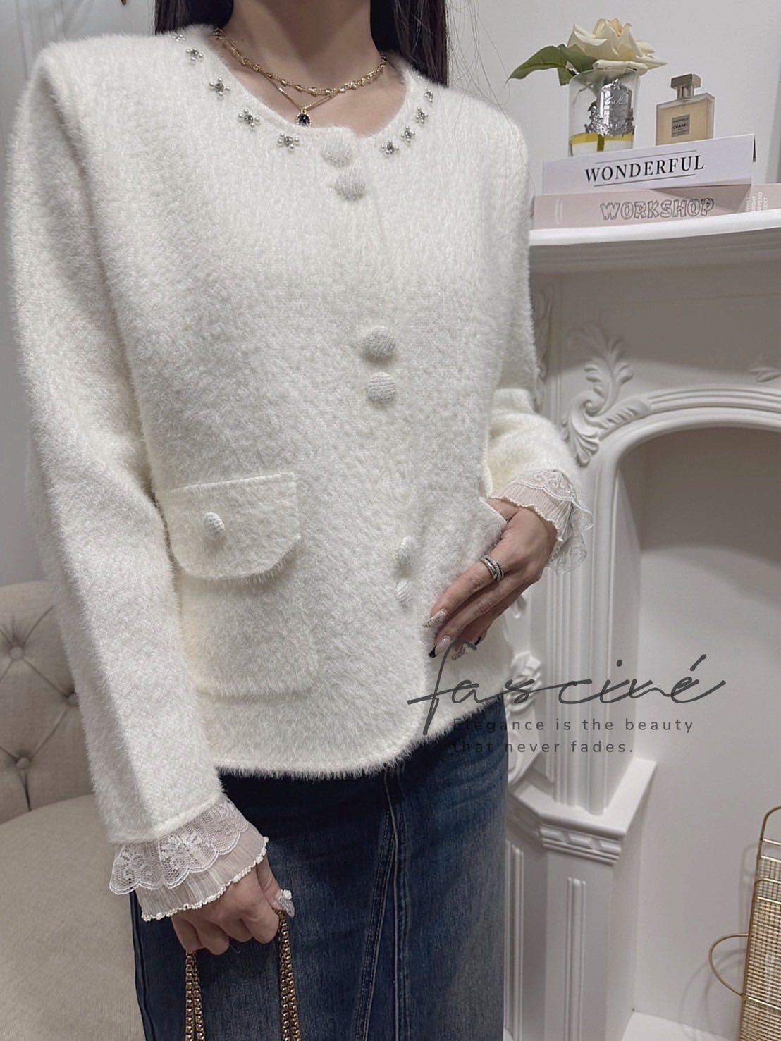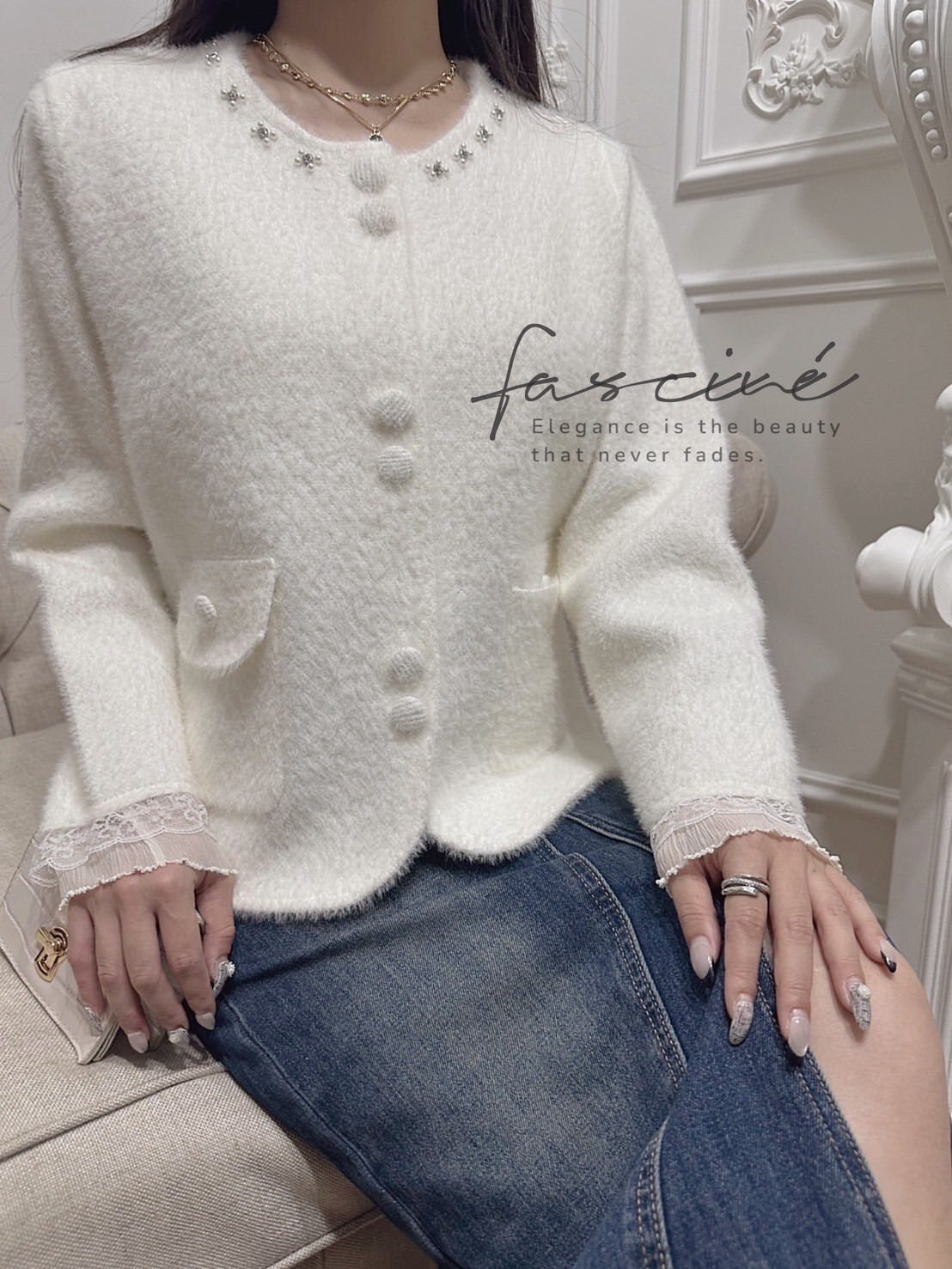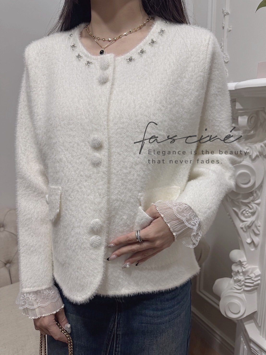 奶霜絨感面料搭配圓領釘珠光澤,視覺輕奢且襯膚顯氣質。袖口蕾絲拼接與包覆布釦細節,放大法式優雅而不過度張揚。修身不緊繃的直筒剪裁與微弧下擺,單穿是上衣、解扣是外套一件多用。