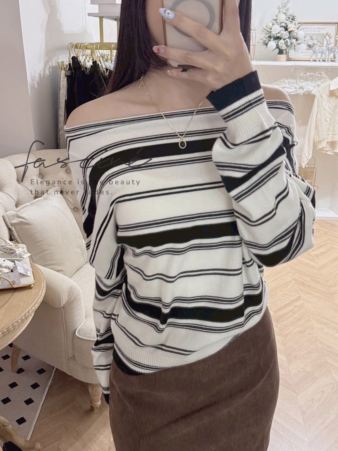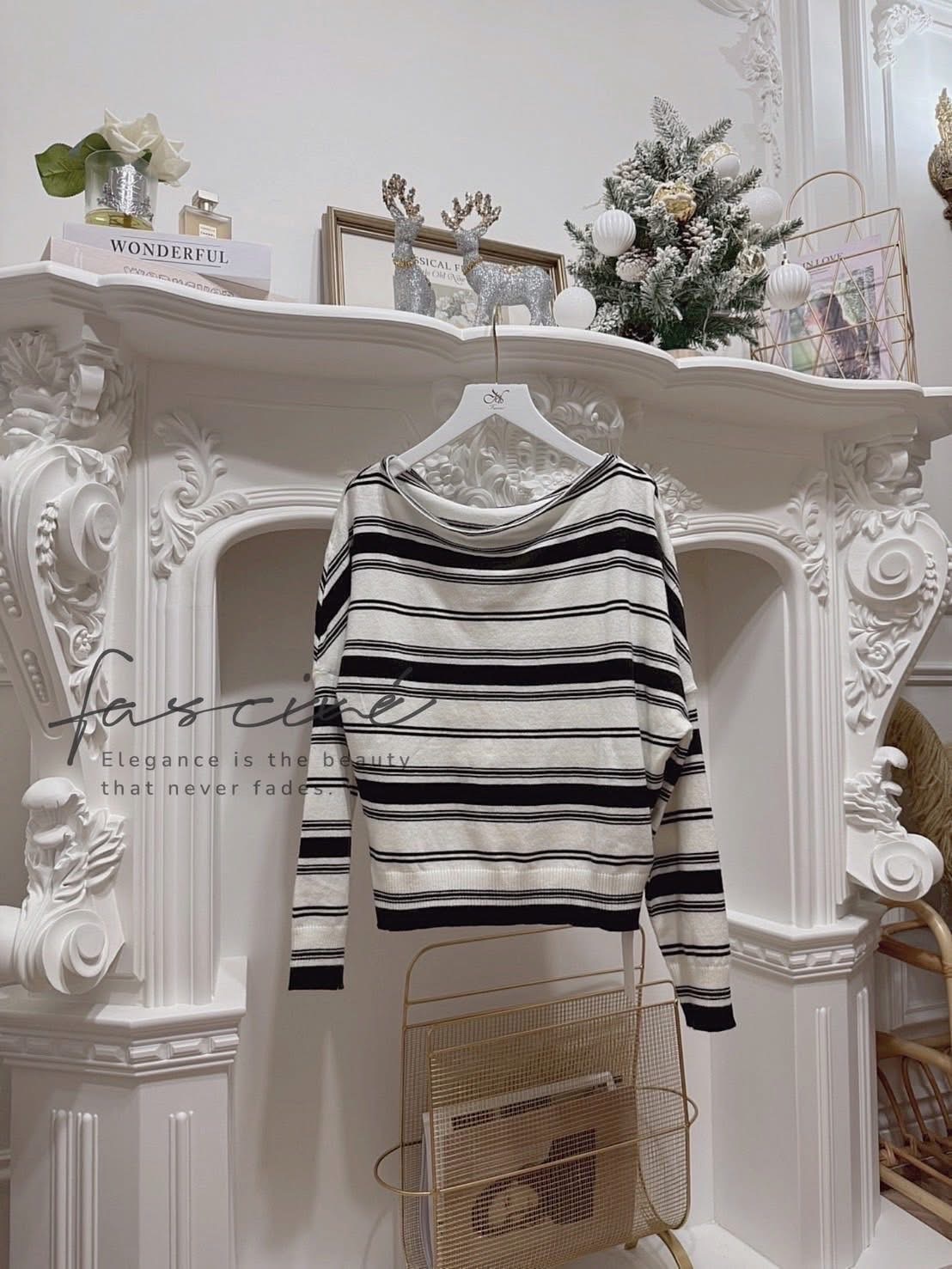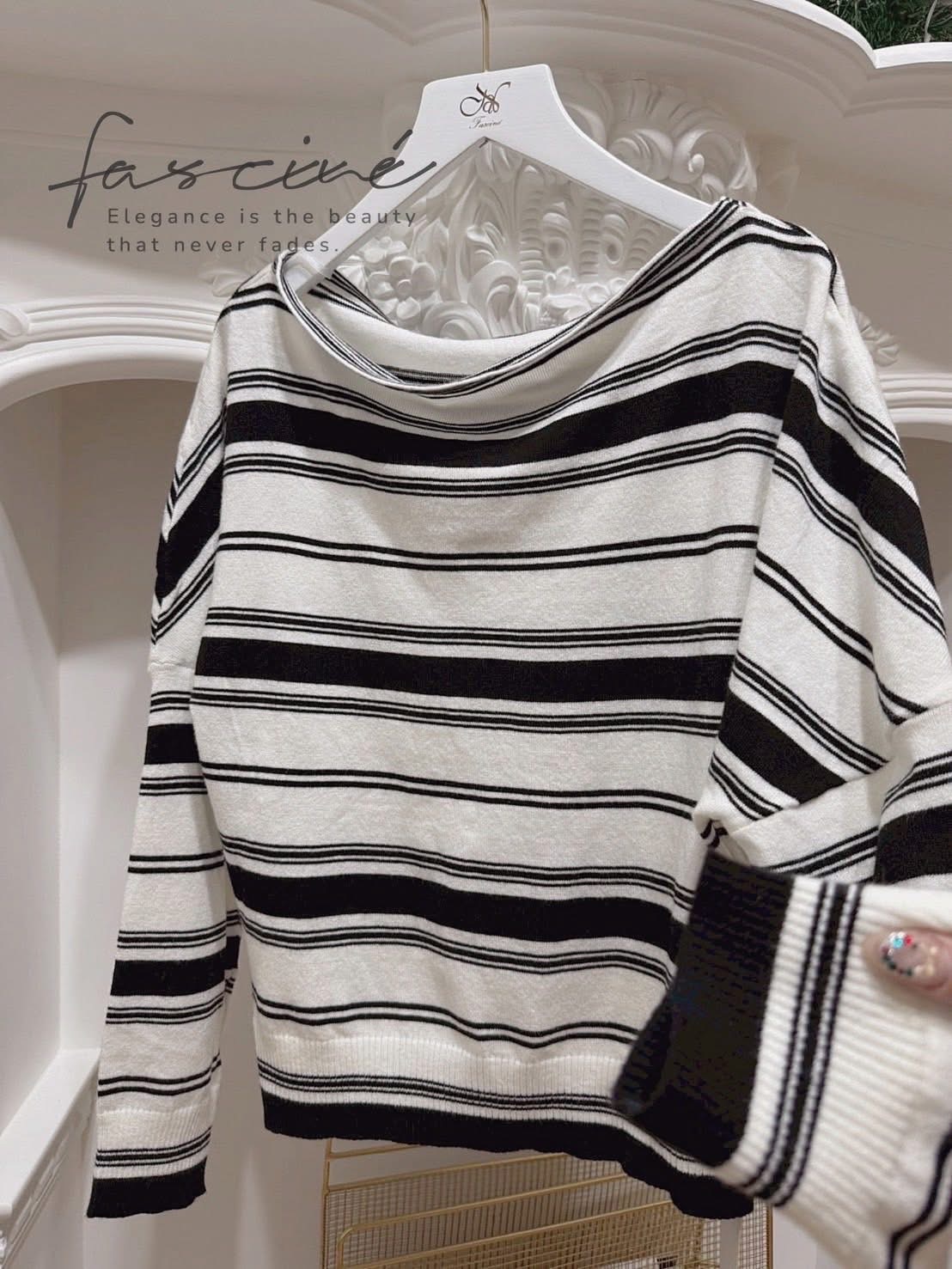 此款以法式率性斜領設計,營造隨性露肩美感,巧妙展現鎖骨線條與女人味。寬鬆剪裁兼具舒適與修身,針織混紡材質輕柔親膚,適合秋冬層次穿搭。經典黑白條紋,低調卻極具品味,休閒場合、約會聚會都能散發自信魅力。
