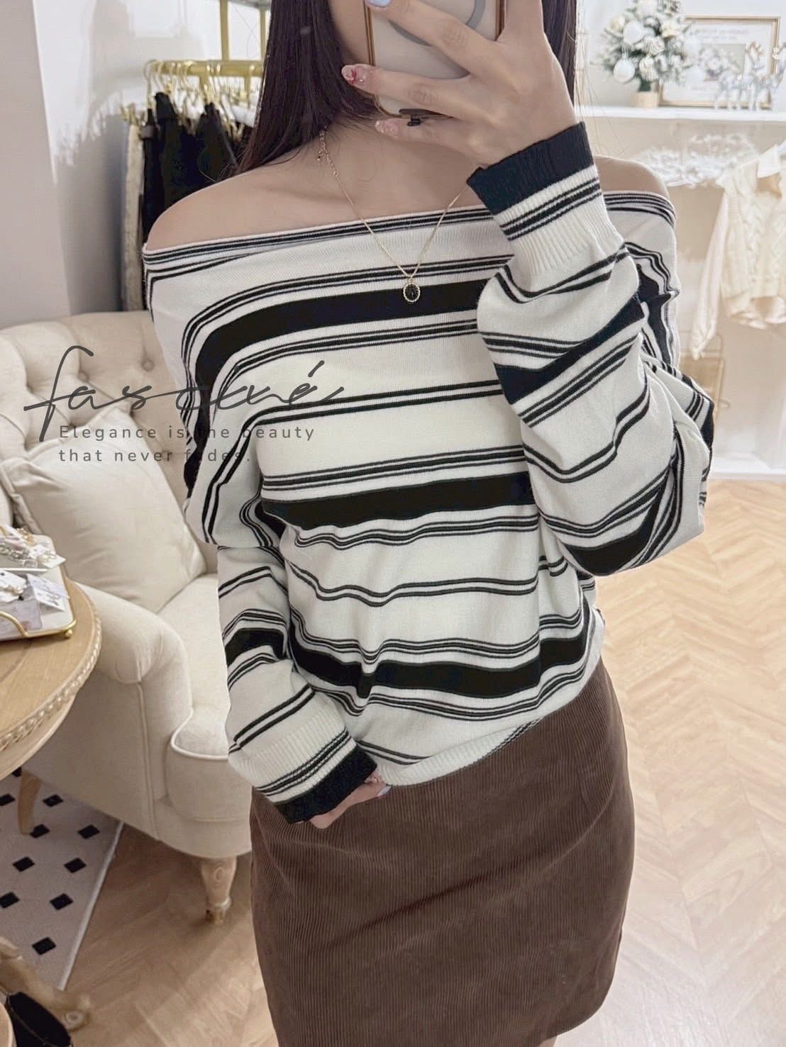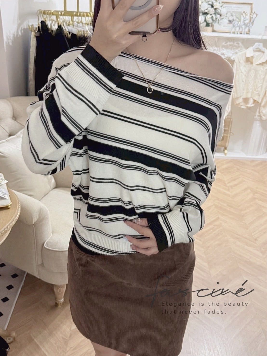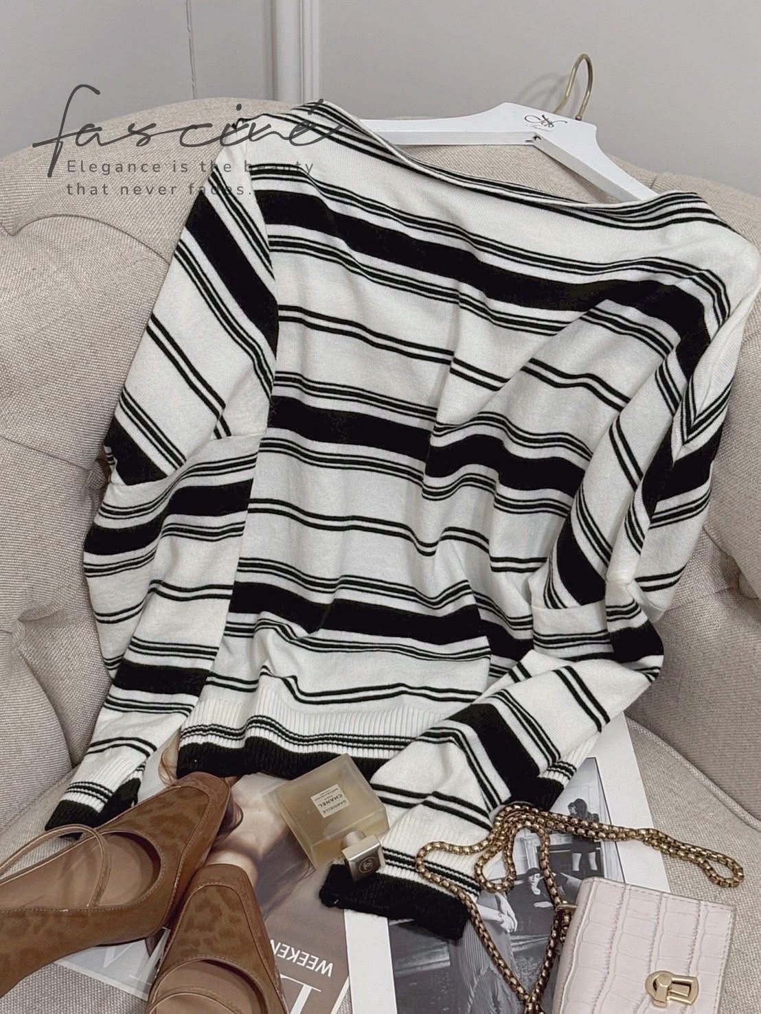 此款以法式率性斜領設計,營造隨性露肩美感,巧妙展現鎖骨線條與女人味。寬鬆剪裁兼具舒適與修身,針織混紡材質輕柔親膚,適合秋冬層次穿搭。經典黑白條紋,低調卻極具品味,休閒場合、約會聚會都能散發自信魅力。