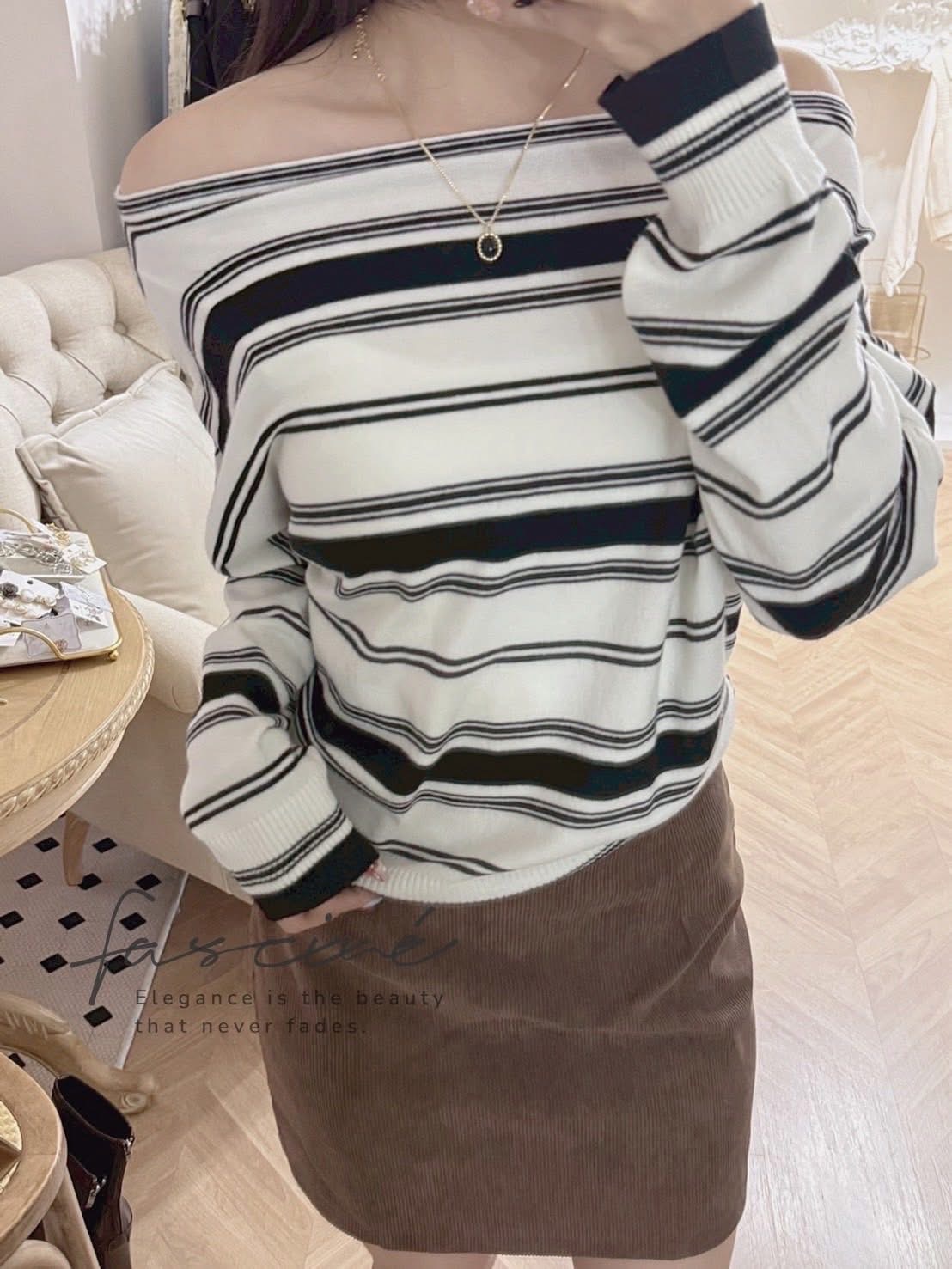 (11T48-25B)法式個性斜領露肩寬鬆休閒條紋針織上衣