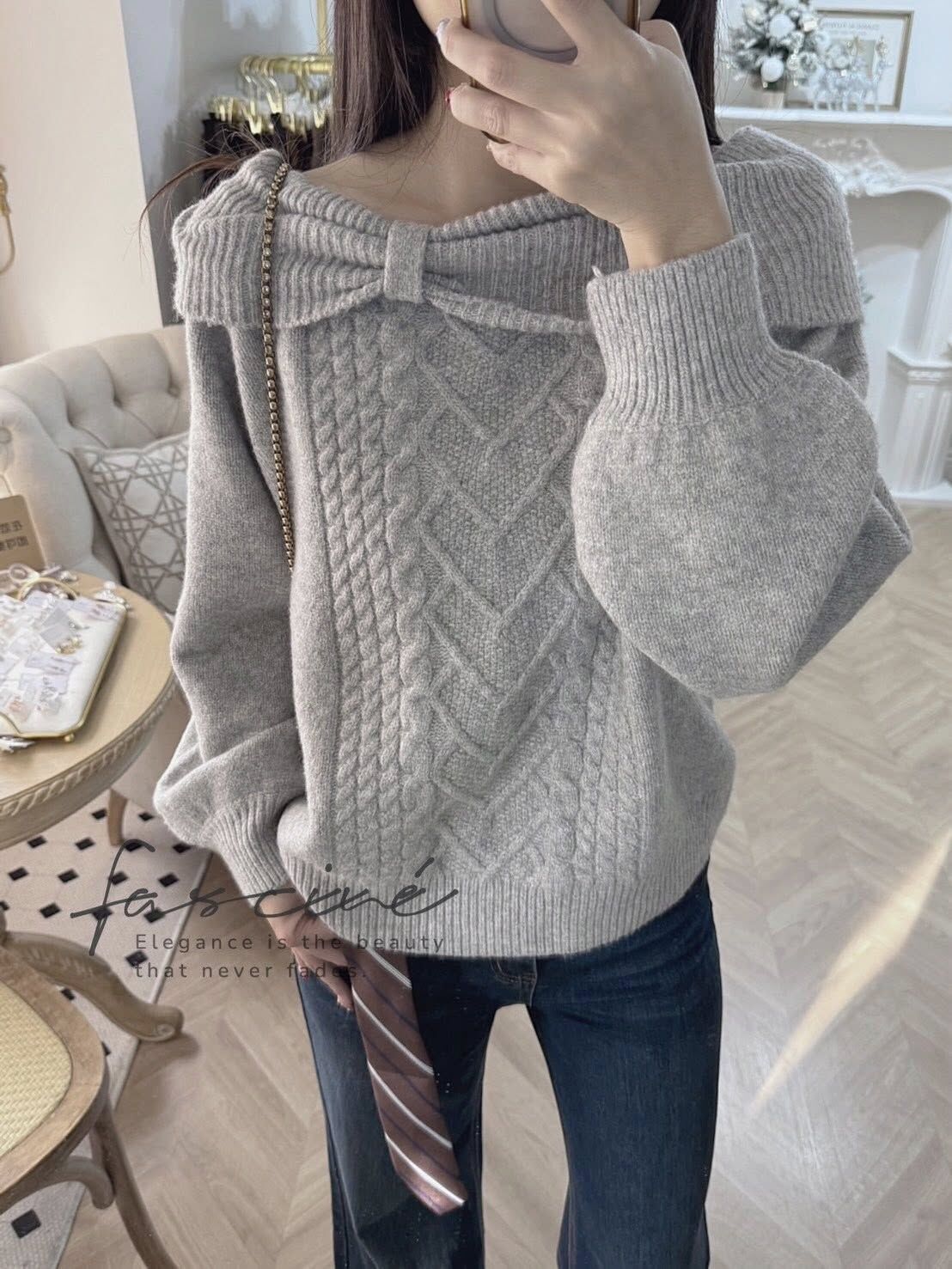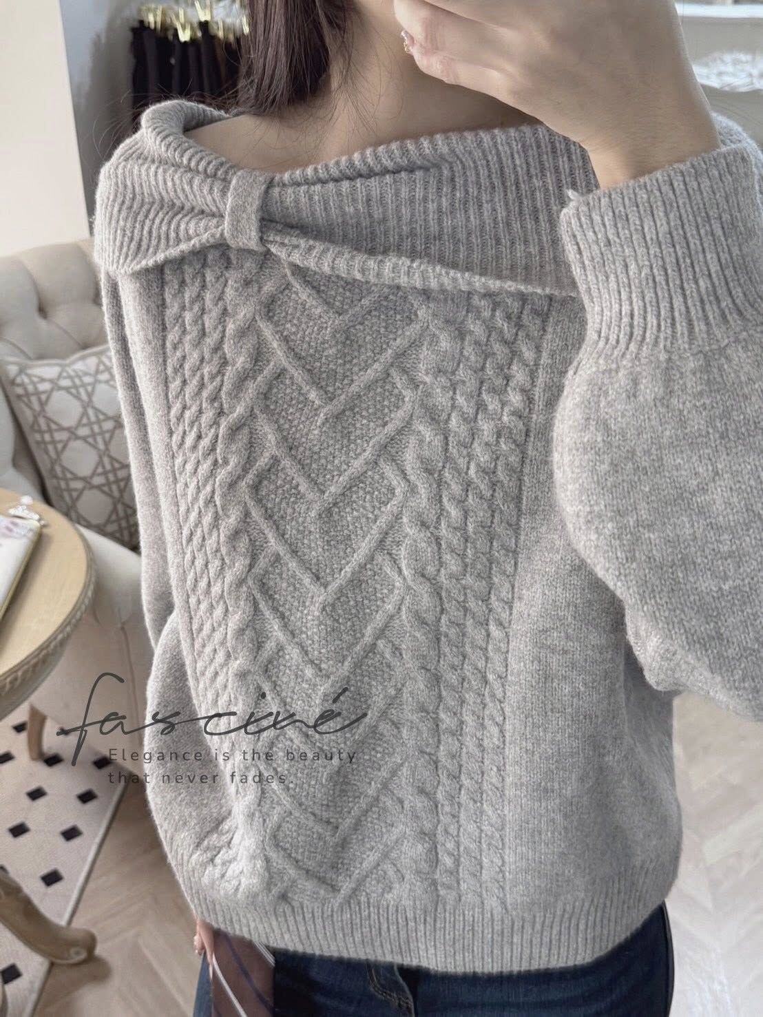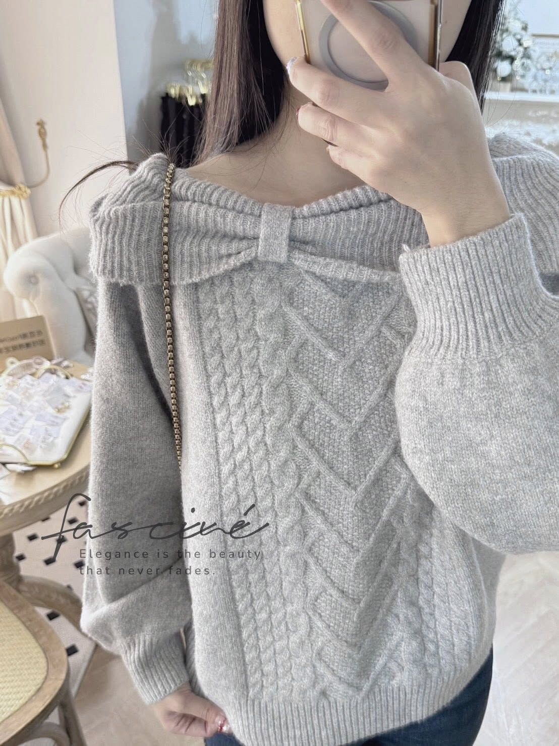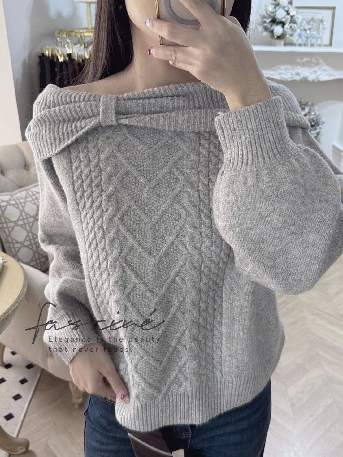 (11T59-25B)法式氛圍感蝴蝶結溫柔百搭麻花紋一字肩顯瘦針織毛衣