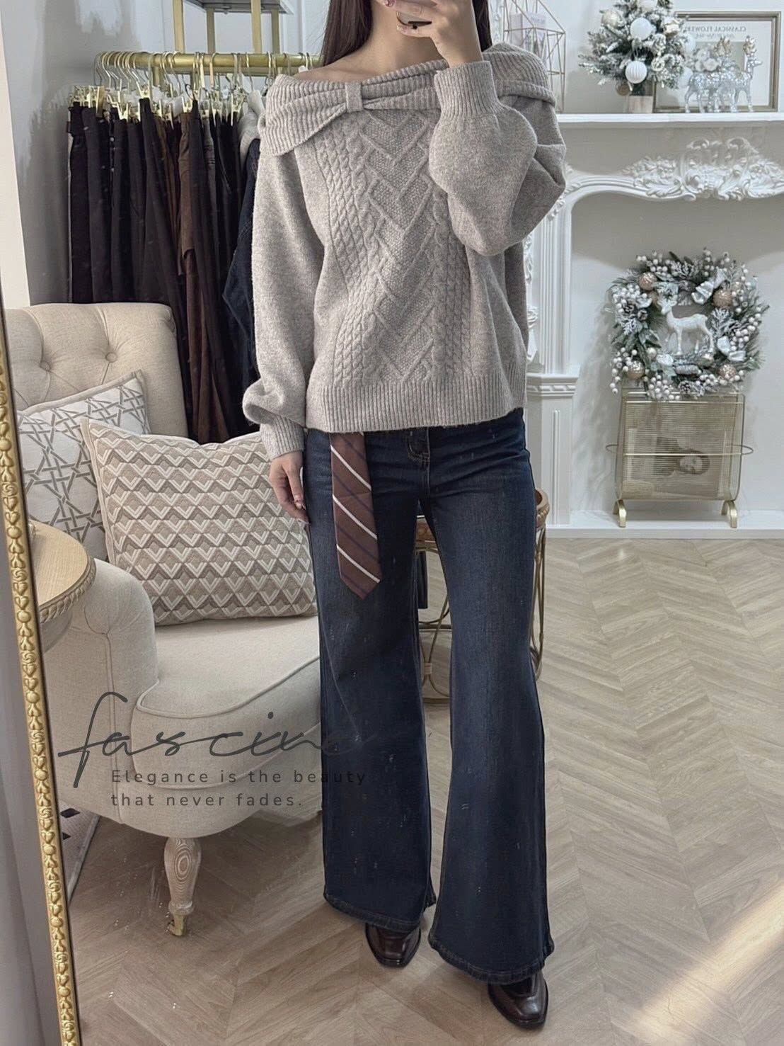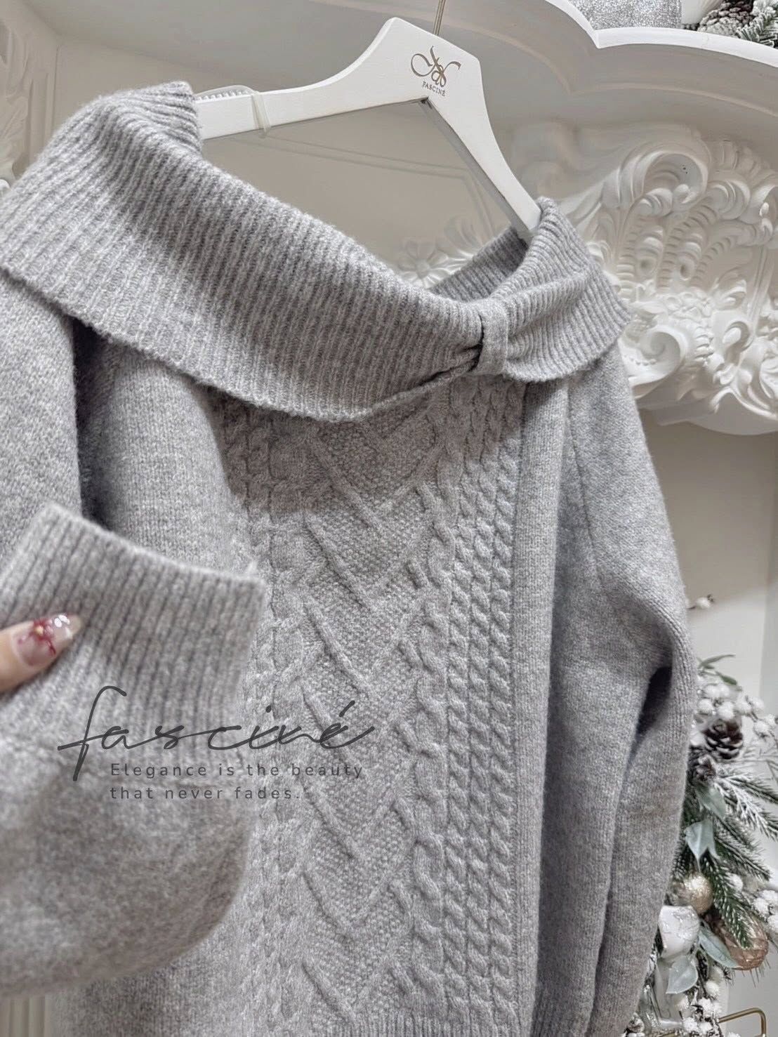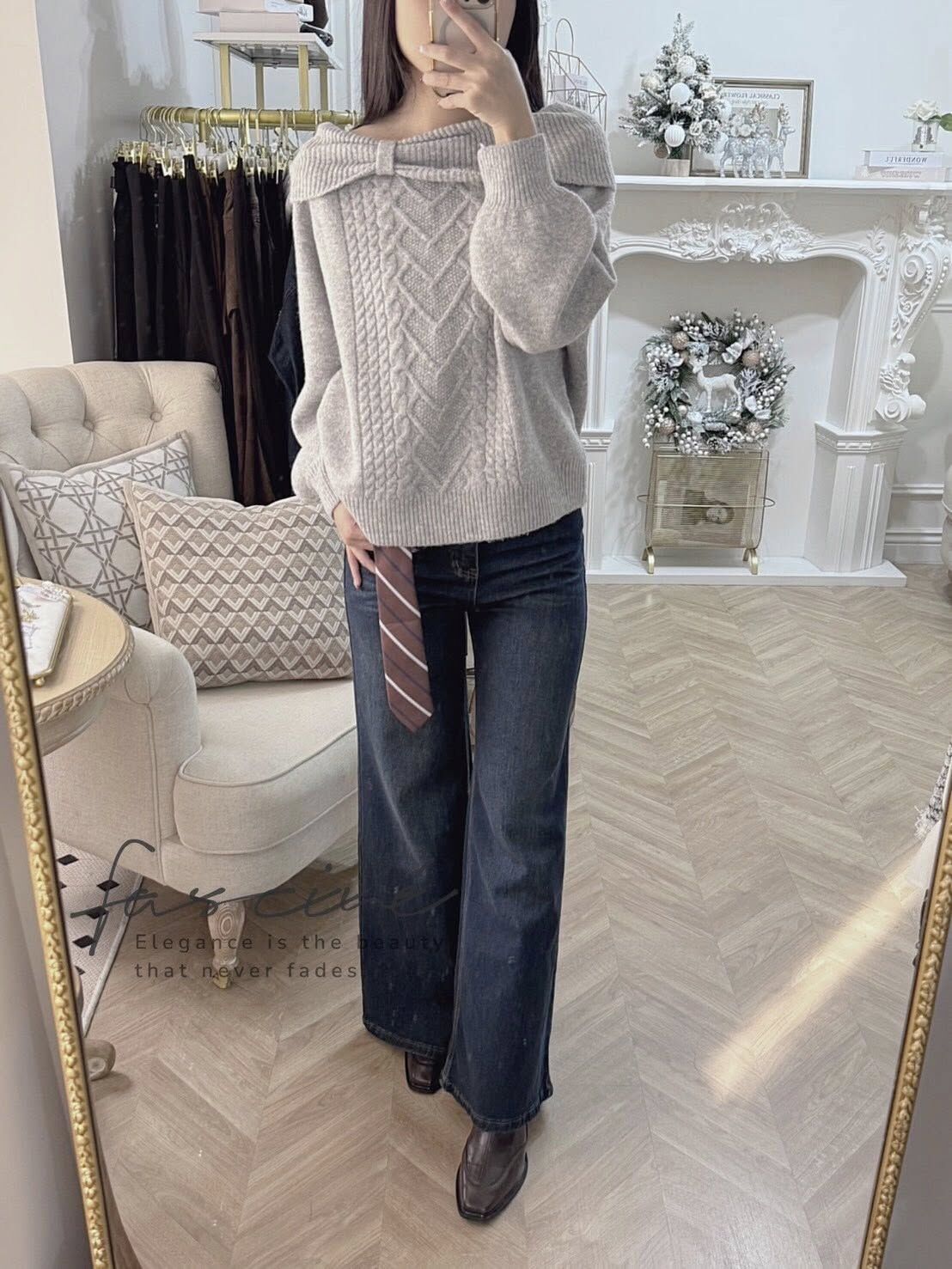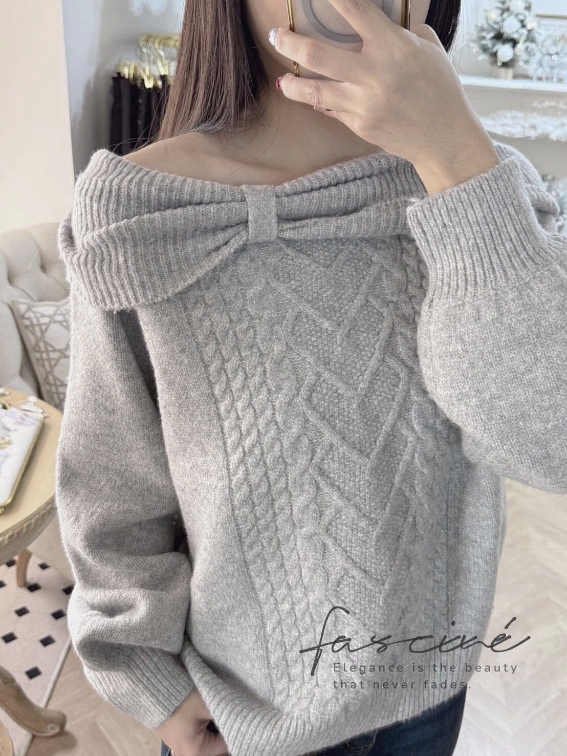 (11T59-25B)法式氛圍感蝴蝶結溫柔百搭麻花紋一字肩顯瘦針織毛衣
