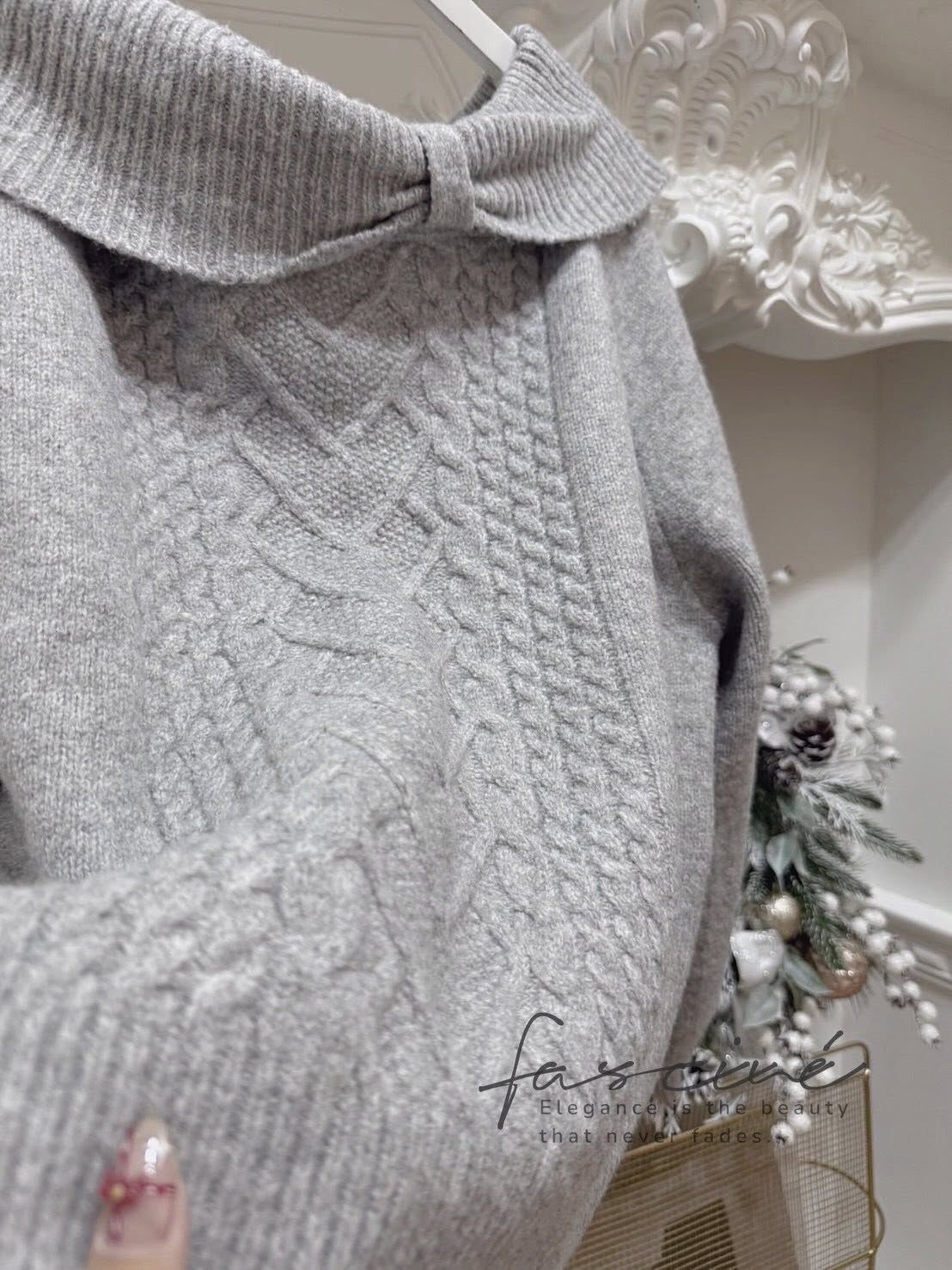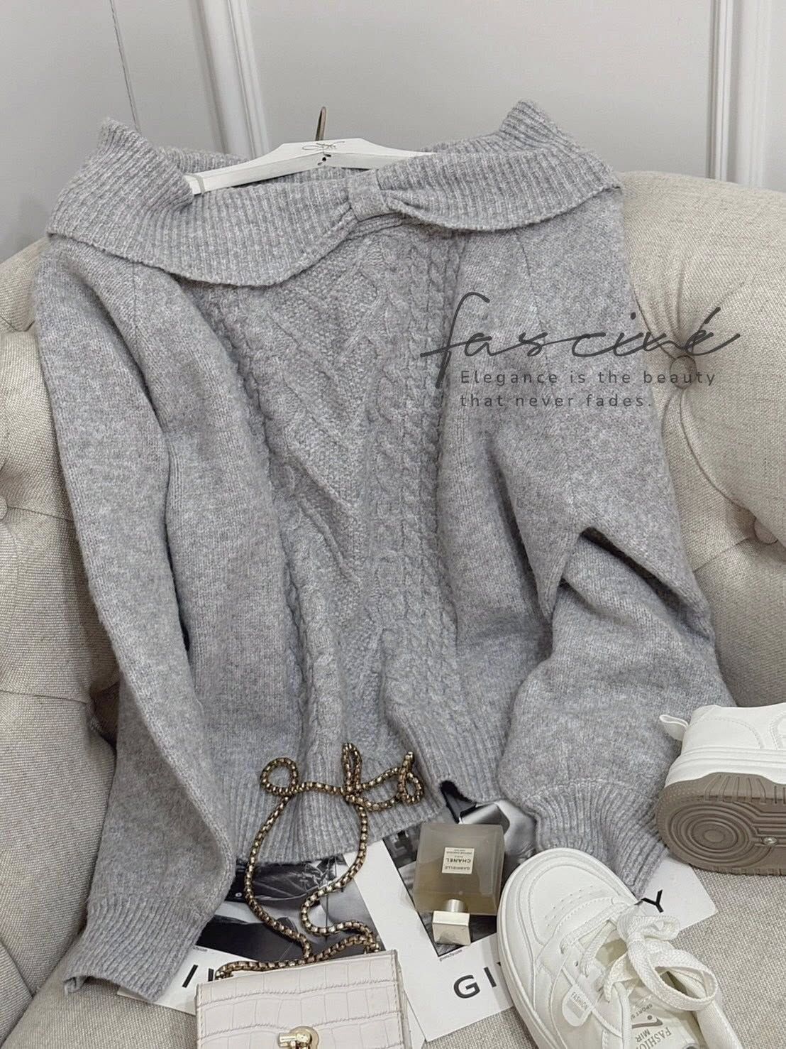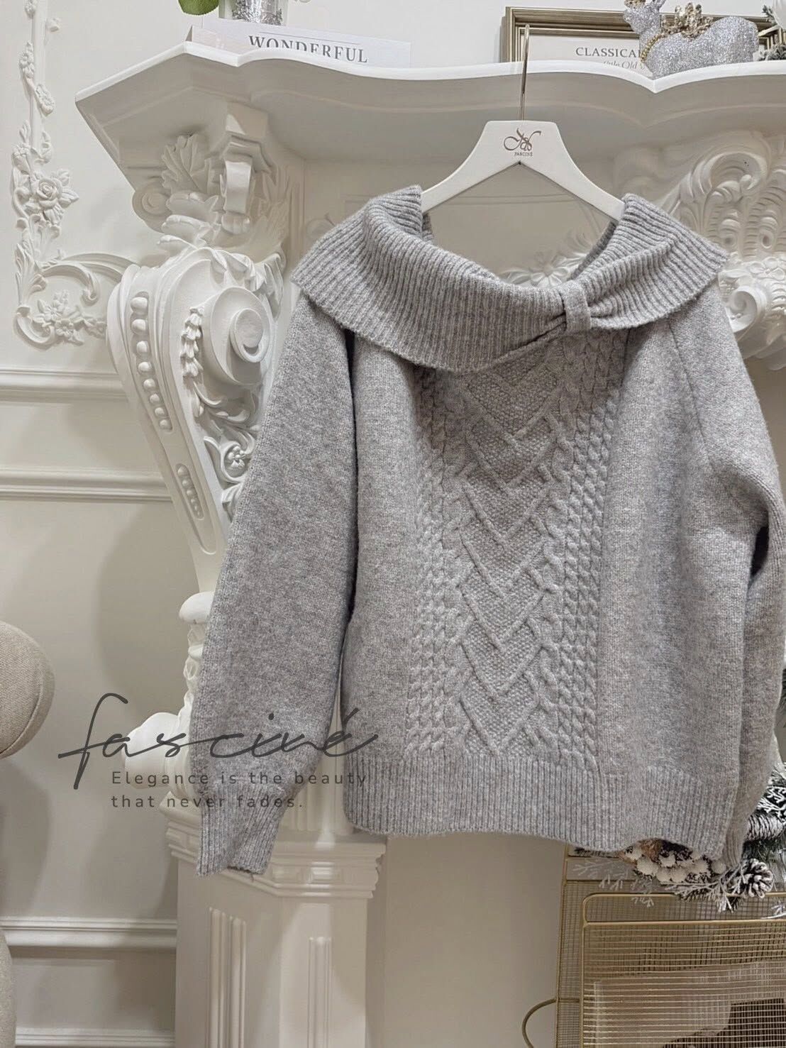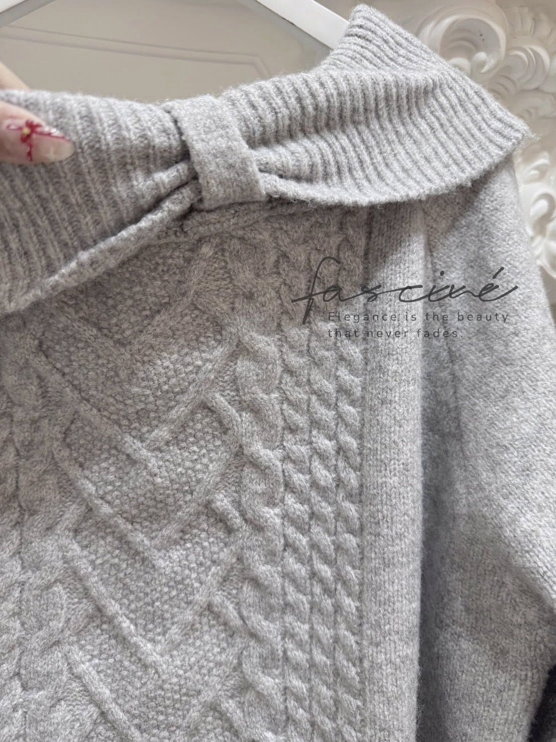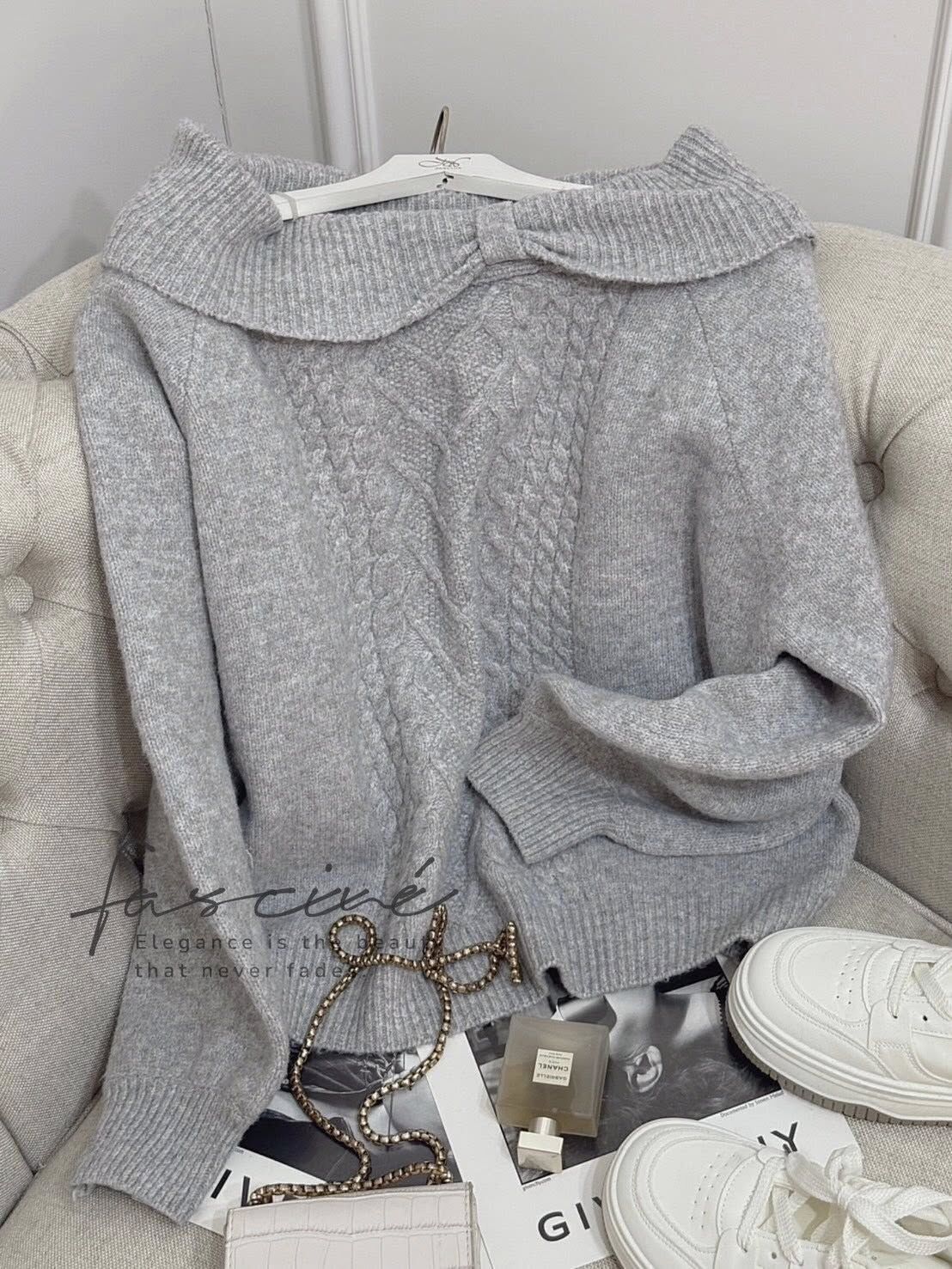 柔霧灰色搭配立體麻花紋路,營造慵懶又精緻的法式氛圍,一字肩設計露出優雅鎖骨線條,視覺瞬間顯瘦。領口蝴蝶結綁帶細節低調可愛,微寬鬆版型巧妙修飾手臂與腰部曲線,日常穿也能自帶小心機。