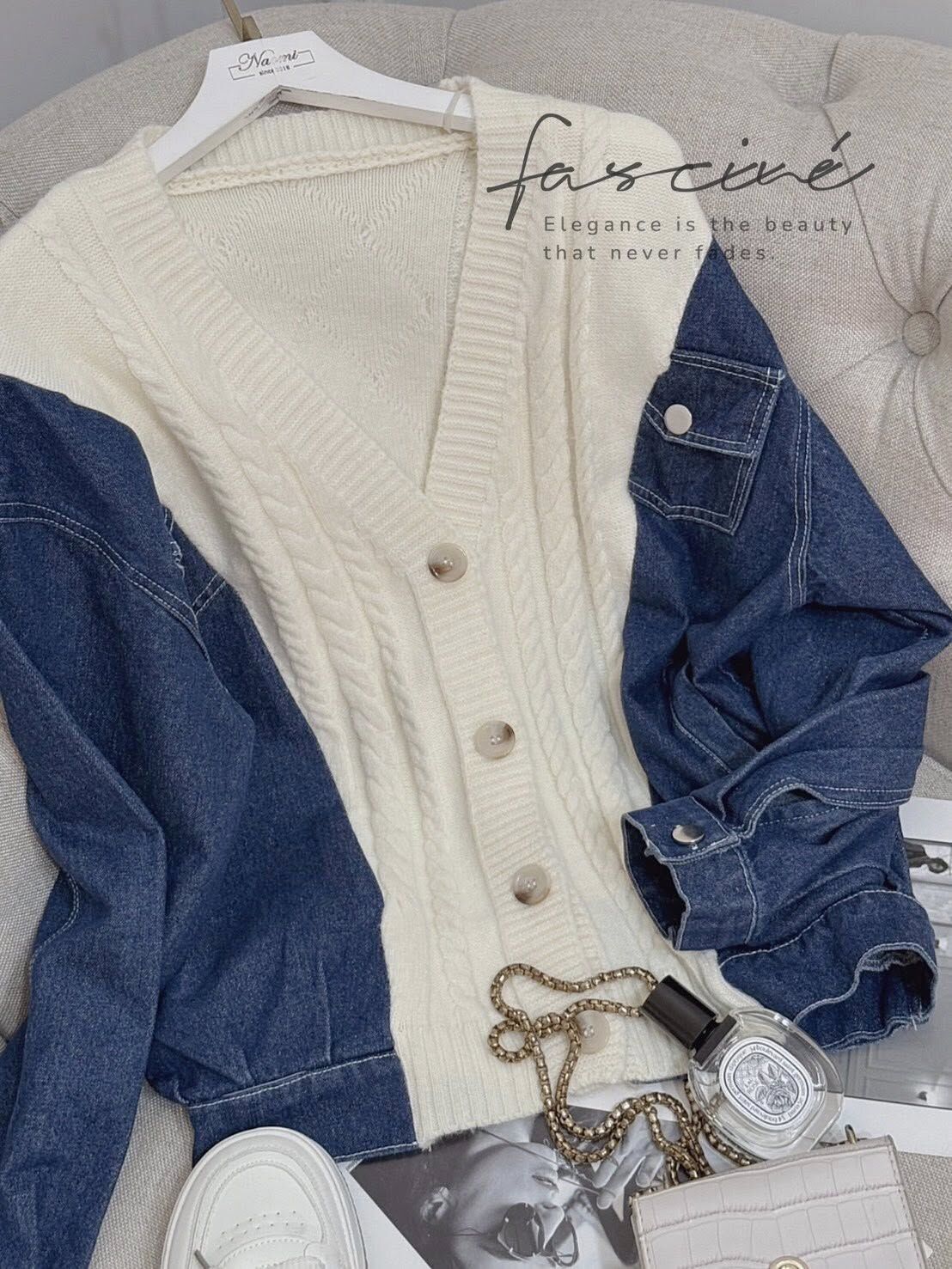 外套前後大片麻花針織V字拼接,視覺自然收腰,輕鬆穿出法式溫柔線條;牛仔布料中和甜度,增添一點率性氣場,上班約會一件就能完成造型。針織面柔軟不扎、牛仔布挺度適中,微寬鬆版型輕鬆遮手臂與小腹,內搭薄針織或高領打底都不顯臃腫。牛仔拼接米色毛衣配色溫柔耐看,單穿當上衣或敞開當外套都好搭,從早秋一路穿到微涼初春。