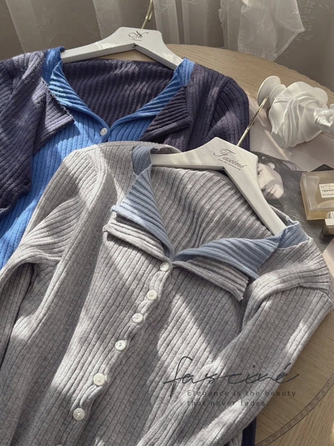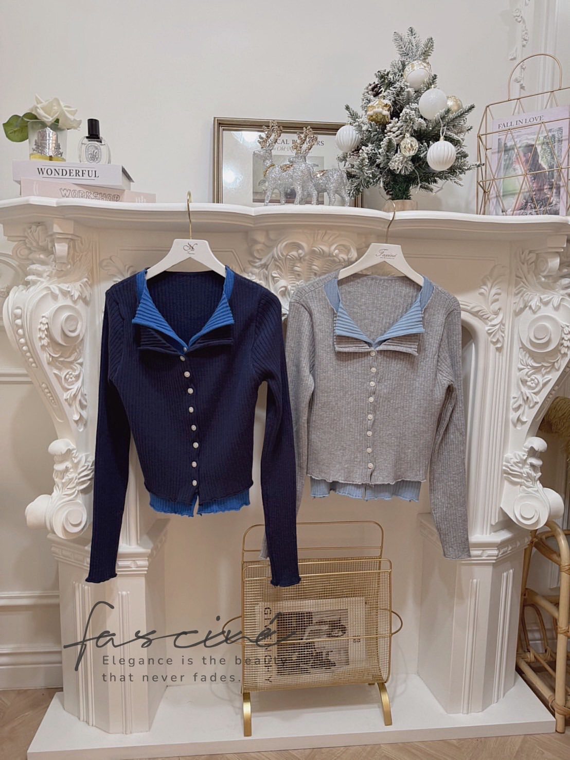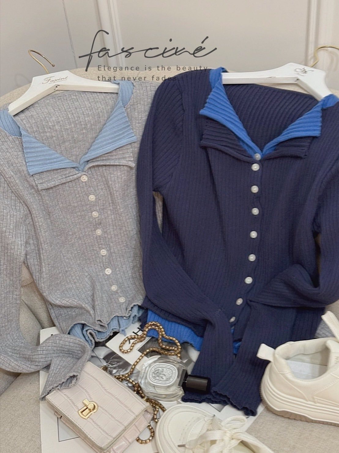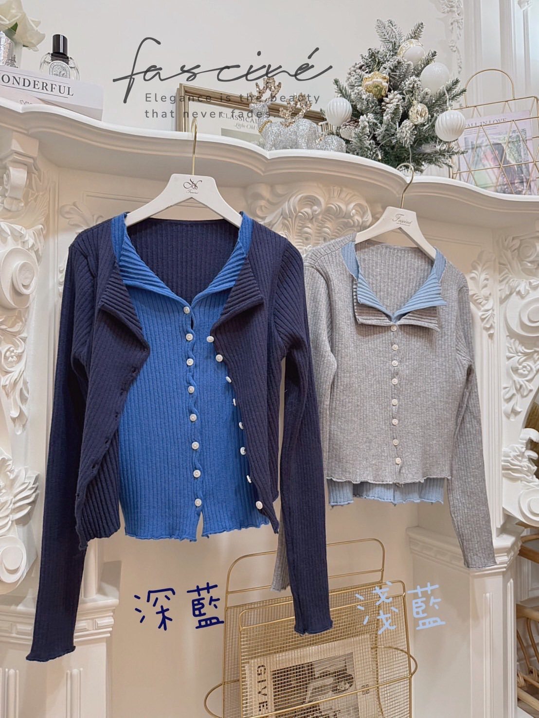 (12T05-25)法式撞色翻領假兩件V領修身顯瘦針織設計感上衣$590