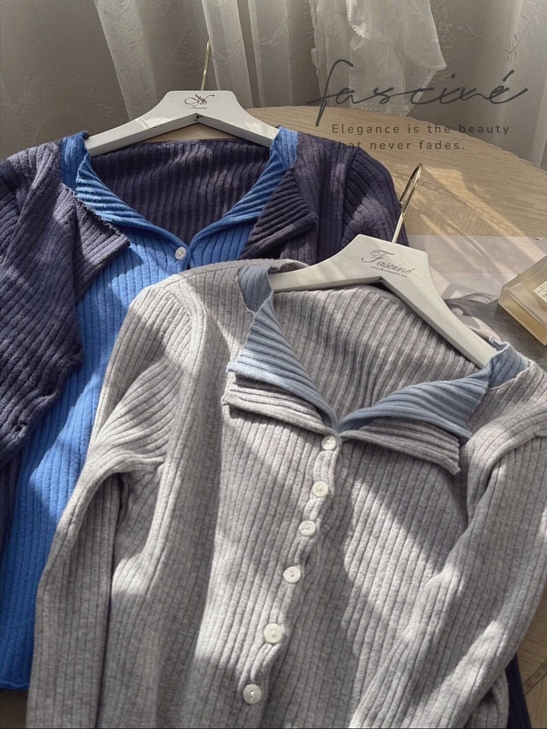 細緻羅紋勾勒出俐落線條,法式V領搭配撞色翻領與層次下擺,視覺集中上半身,拉長比例顯瘦超有感。輕柔混紡面料貼膚不厚重,衣長剛好蓋住腰腹,單穿就很有設計重點,日常通勤、約會小心機一次搞定。