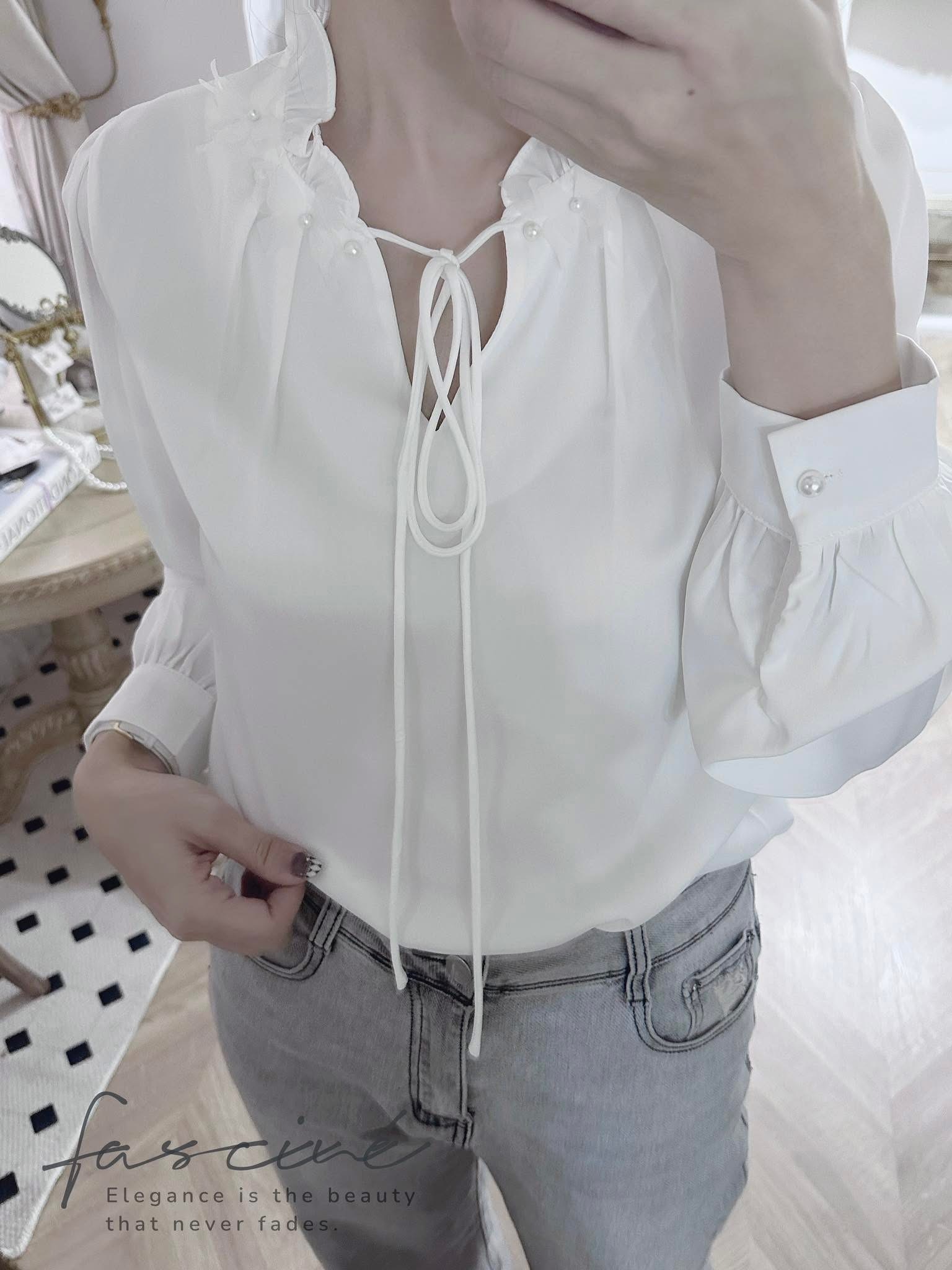 法式花朵木耳花邊繫帶寬鬆雪紡氣質緞面襯衫