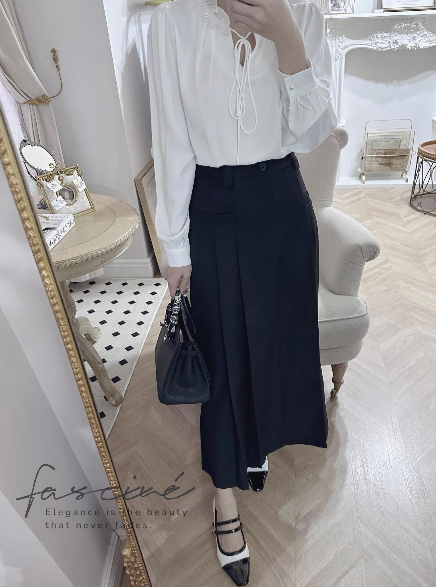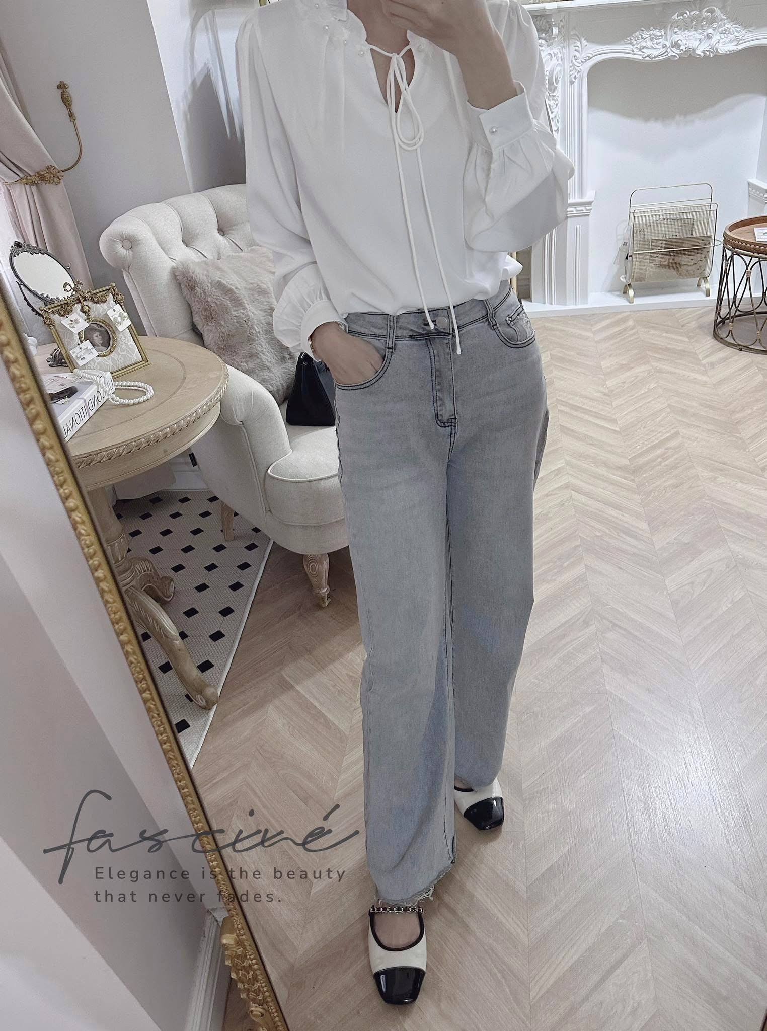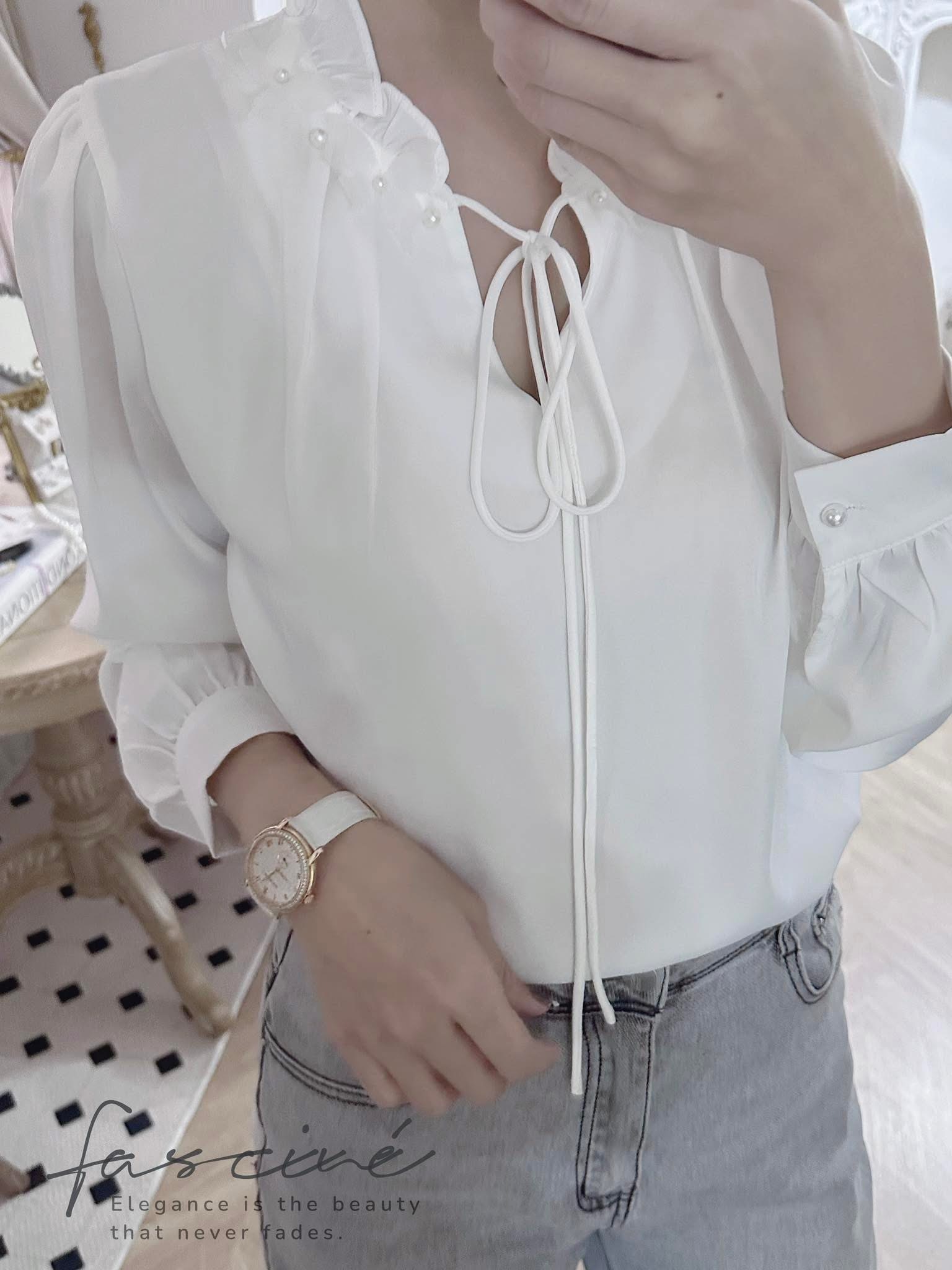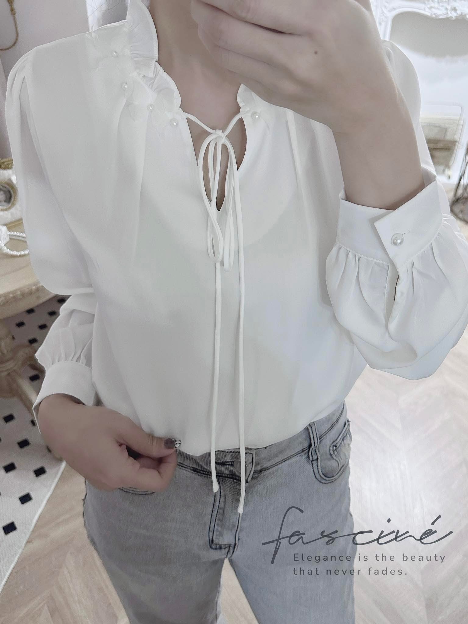 領口細膩的花朵木耳花邊,為襯衫增添一絲溫柔浪漫,輕盈的緞面雪紡,在光線下微微折射優雅光澤,讓每個細節都充滿法式質感。緞面布料輕柔包覆肌膚,可搭配牛仔褲展現隨性時髦,也可與高腰裙混搭,精緻優雅,每一天都是專屬於妳的時尚篇章。