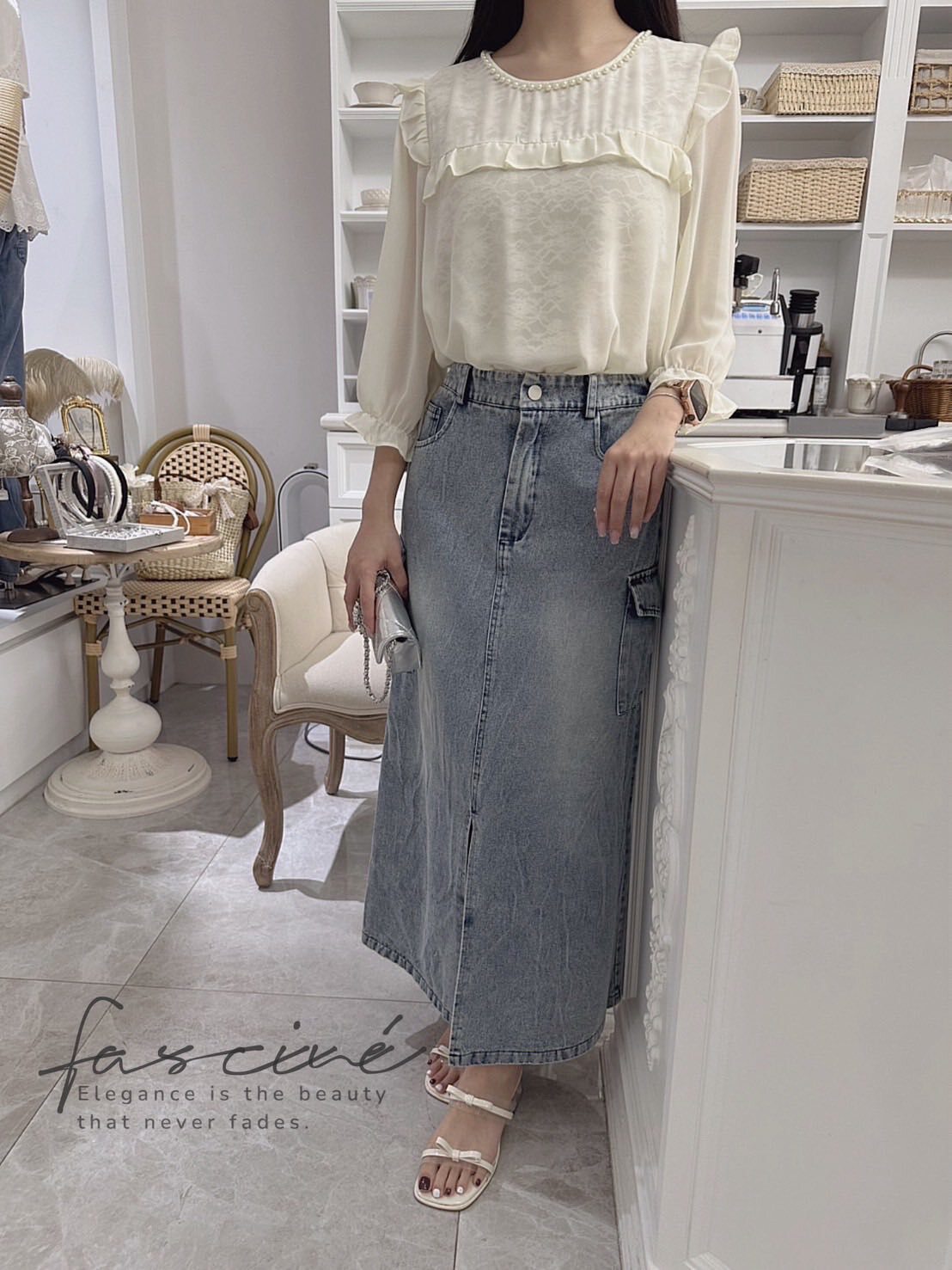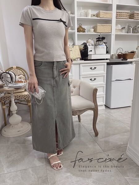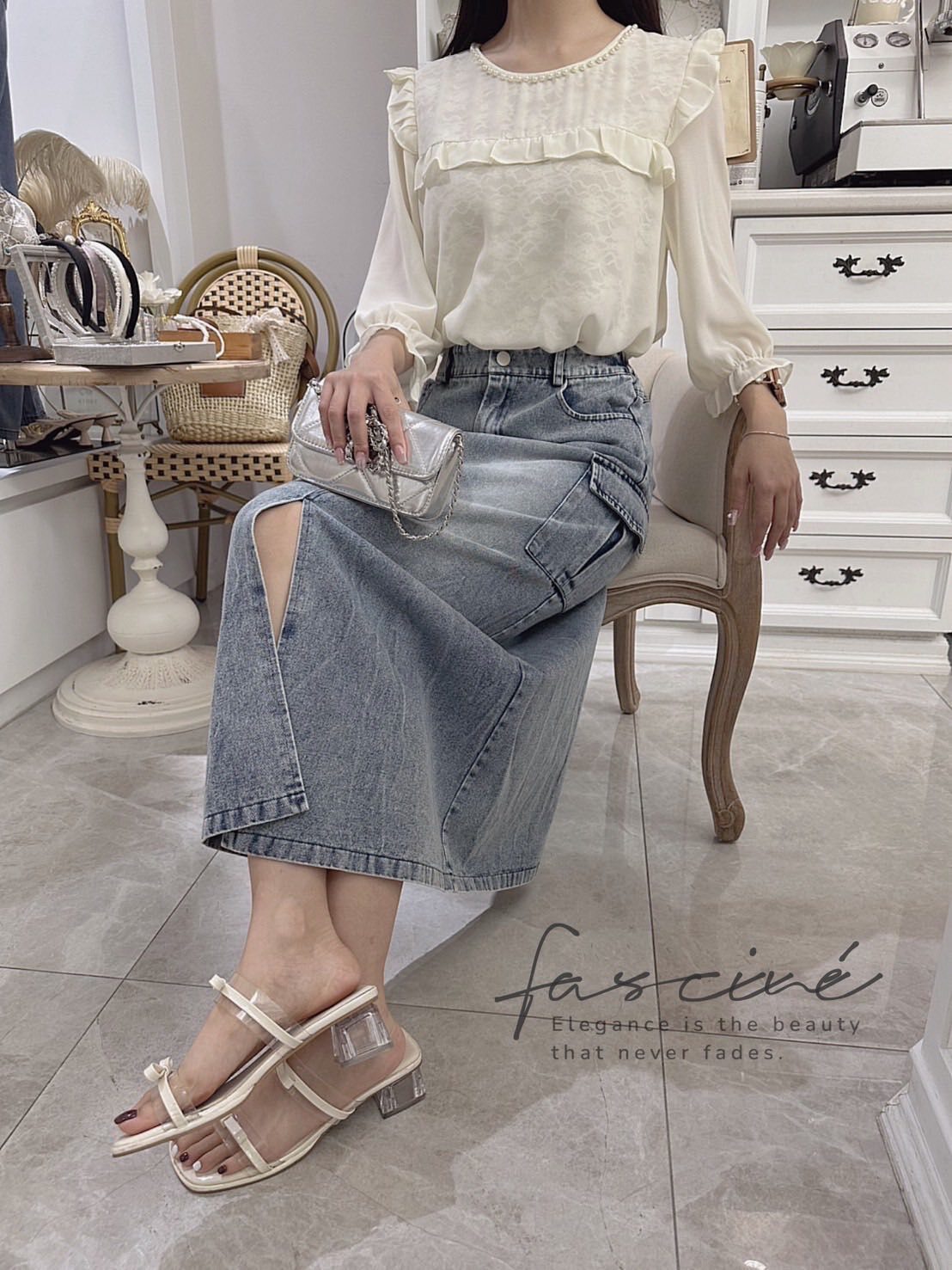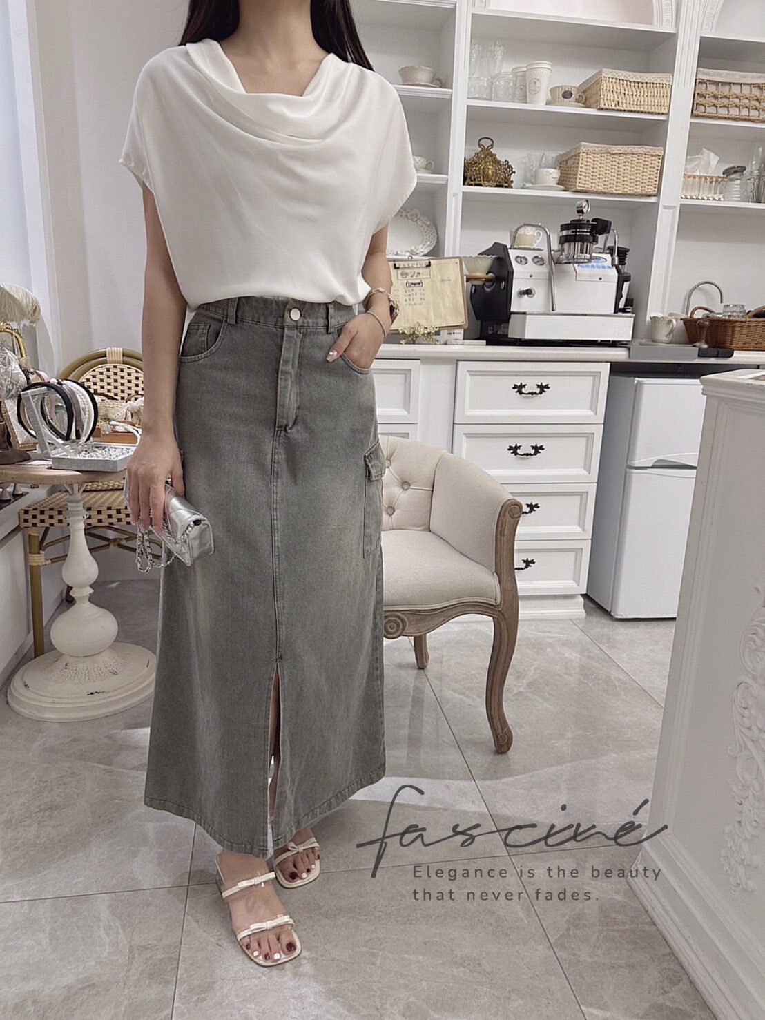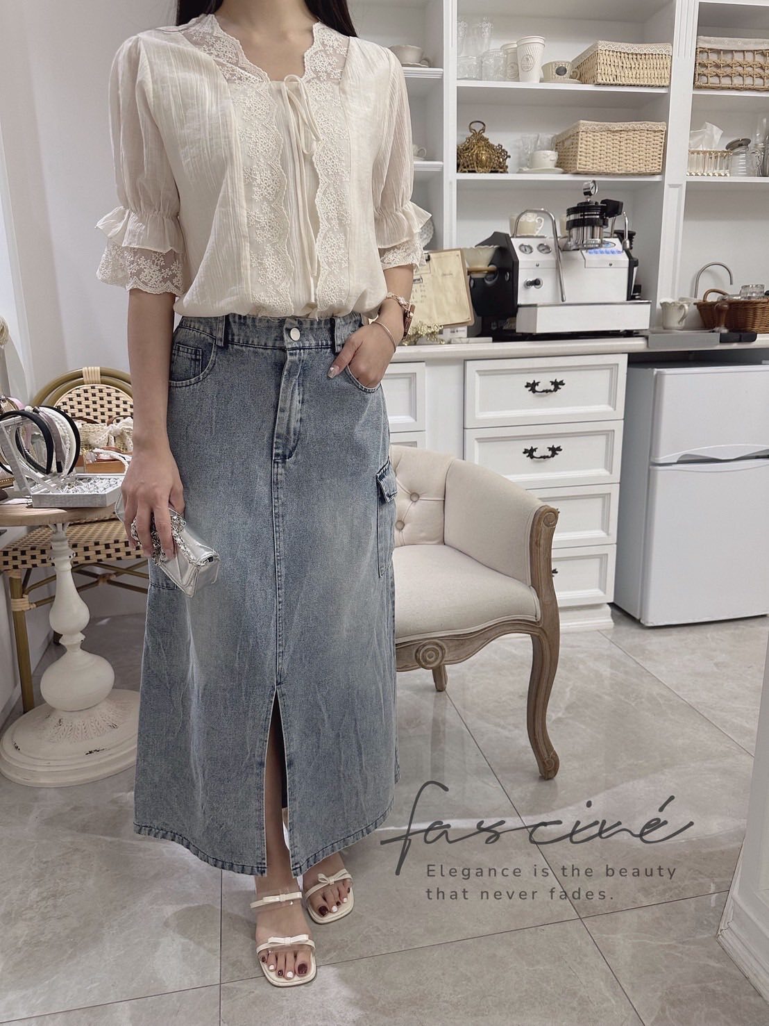 (08S33-25B)法式工裝風前開叉高腰牛仔長裙