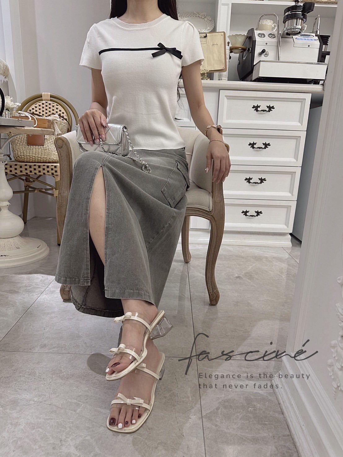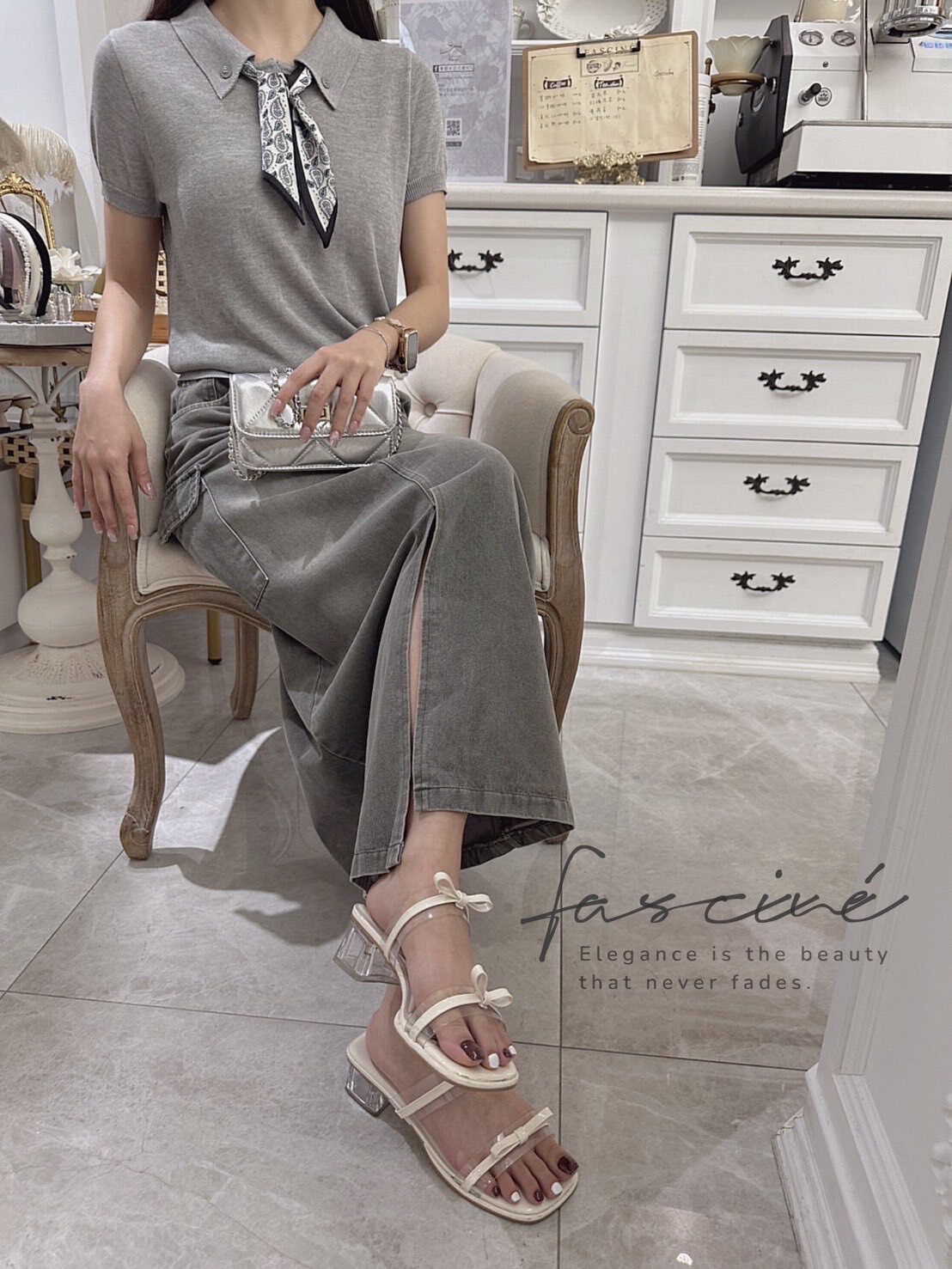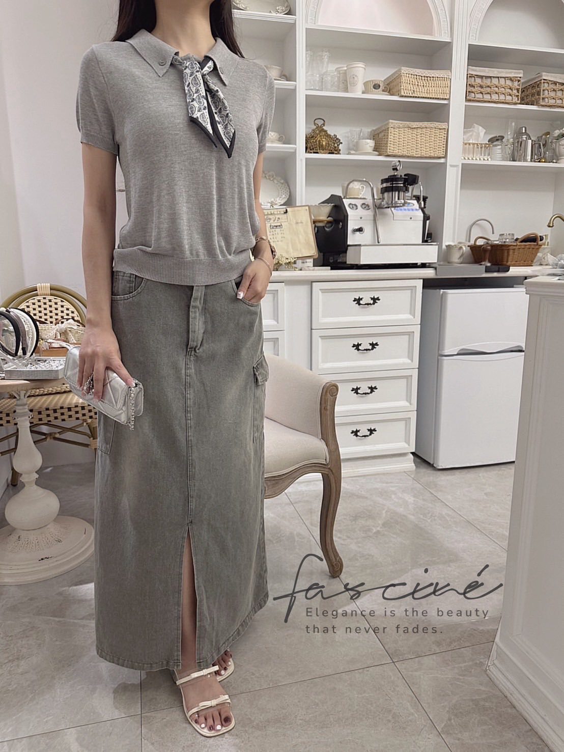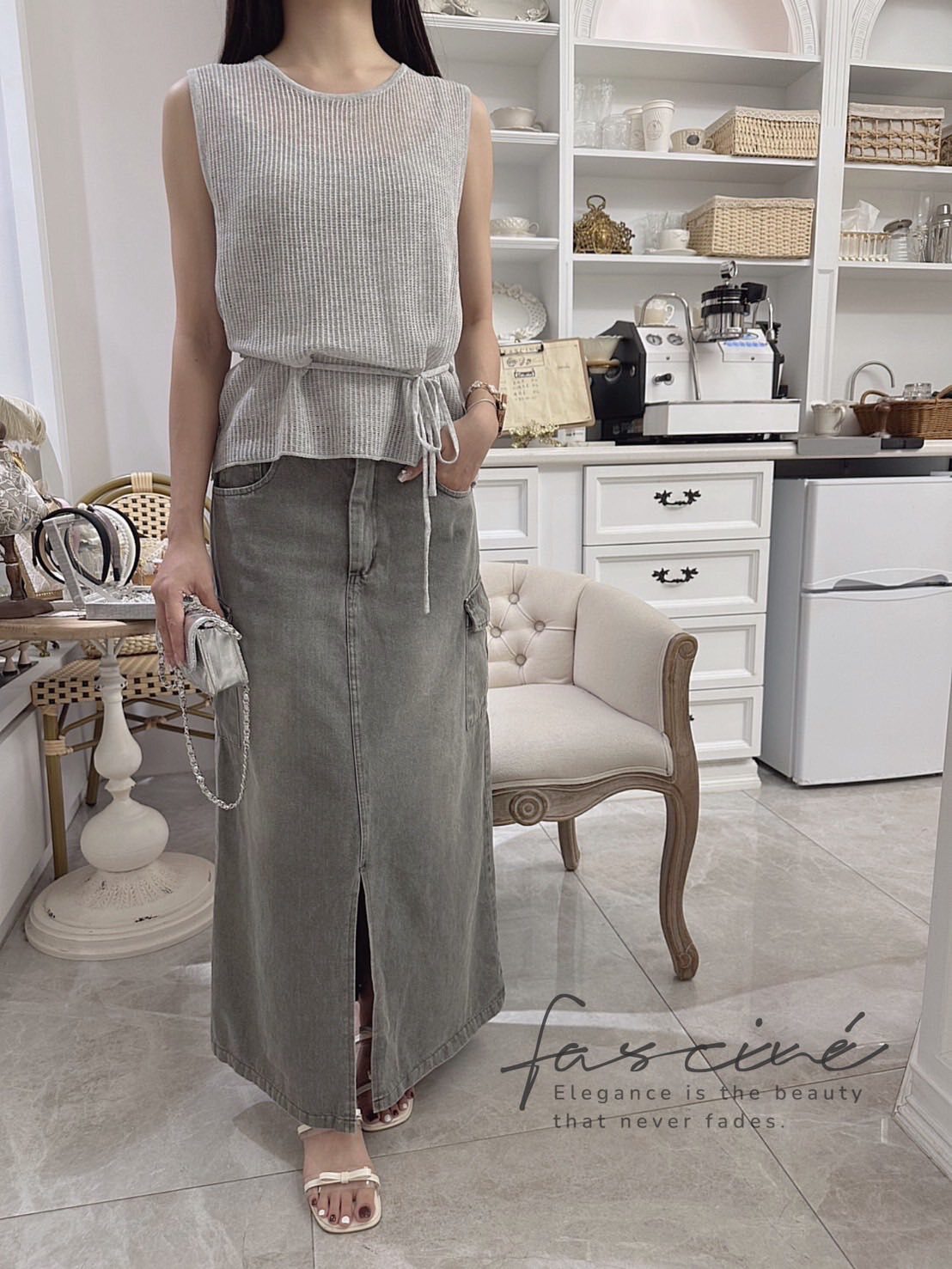 (08S33-25B)法式工裝風前開叉高腰牛仔長裙