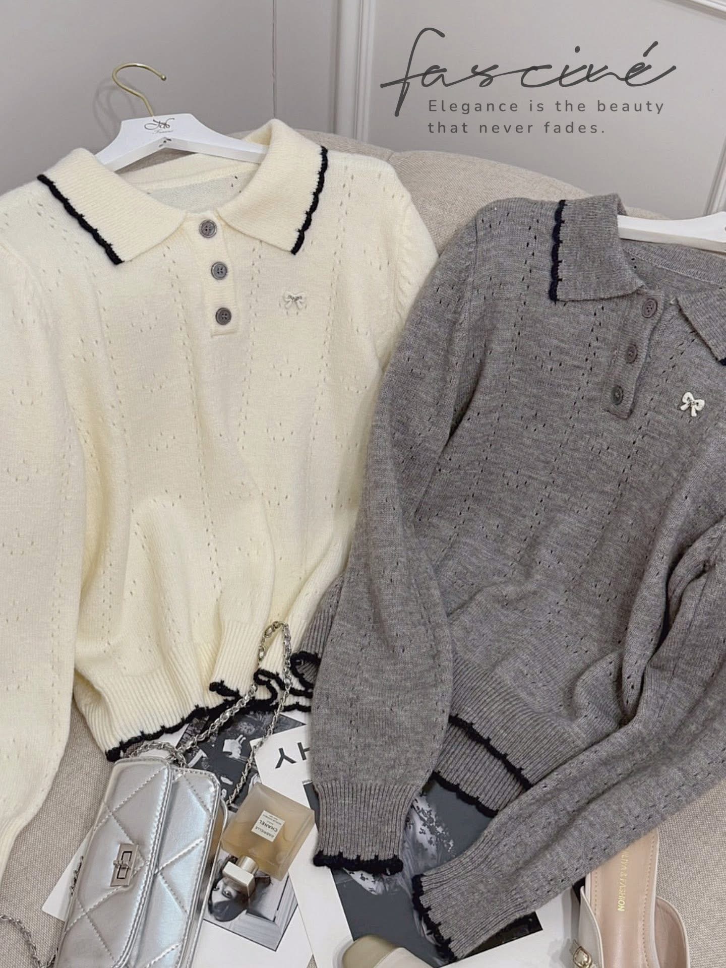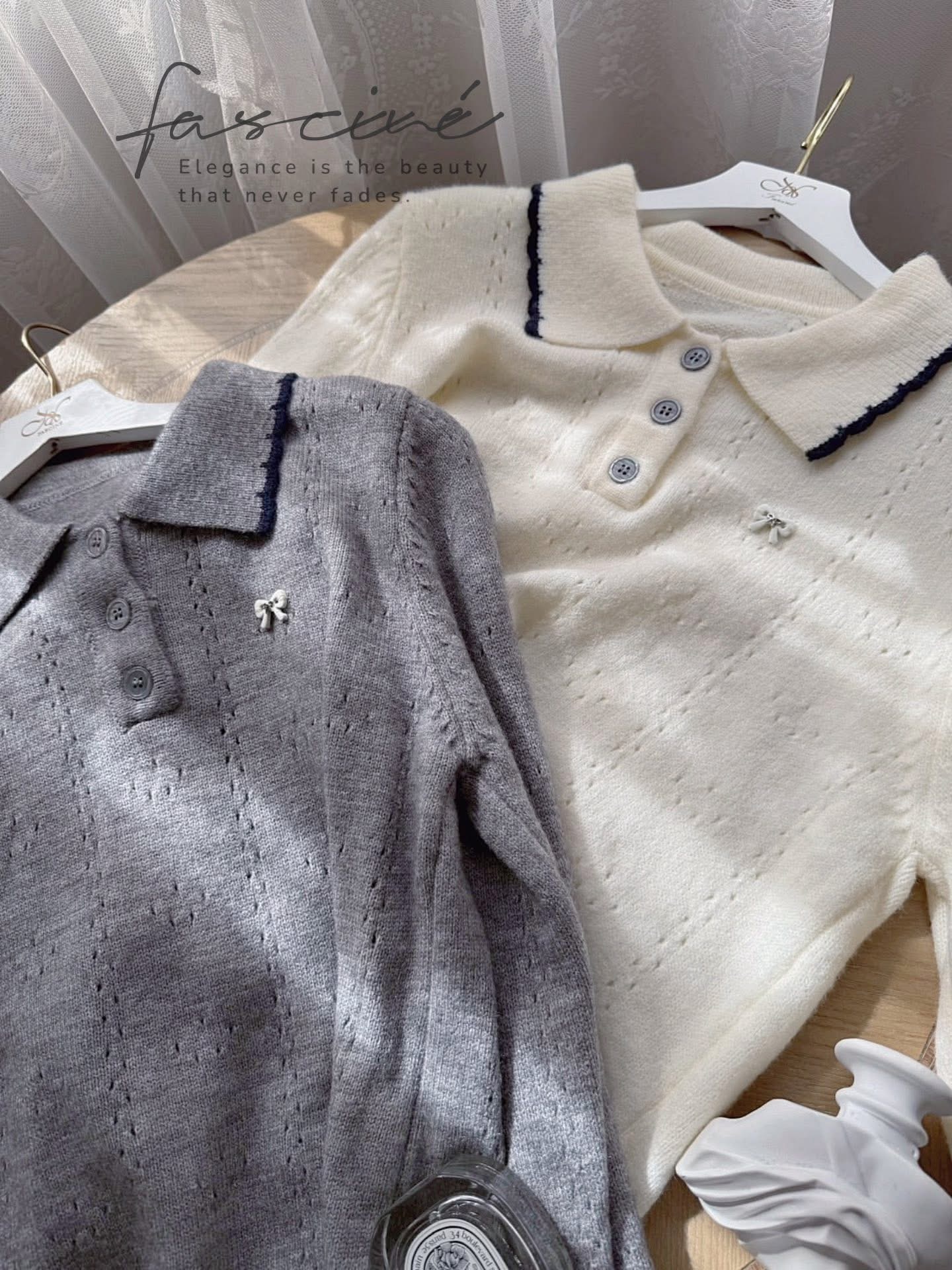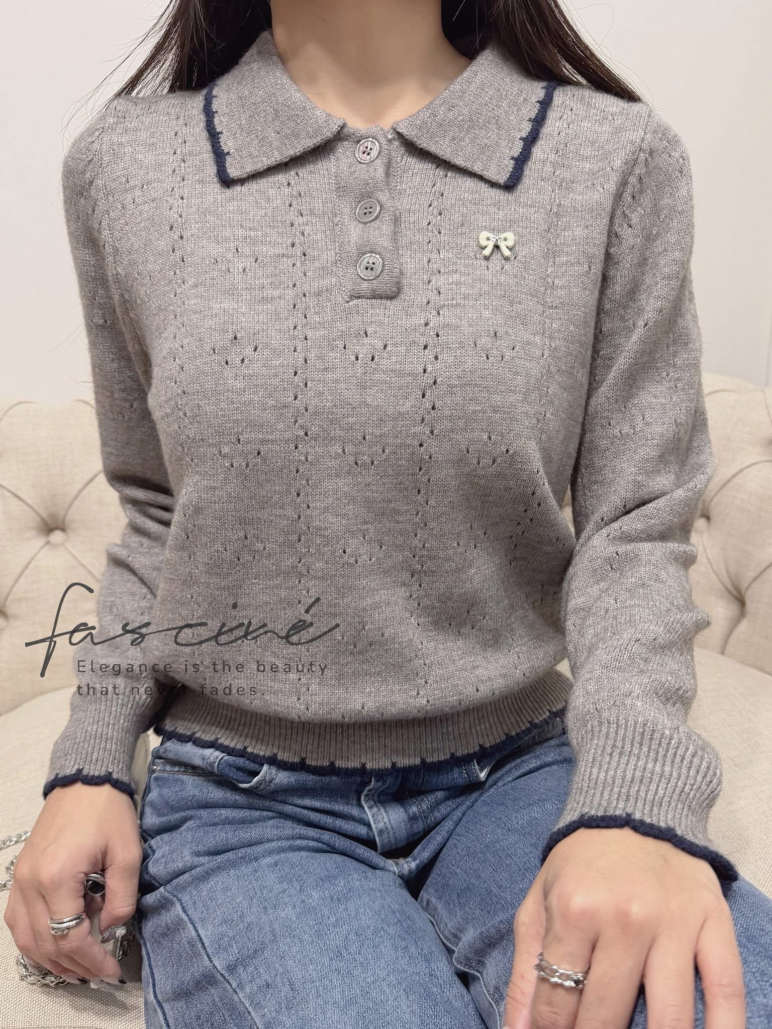 (10T62-25B) 法式鏤空提花蝴蝶結針織polo領寬鬆拼色上衣 $490