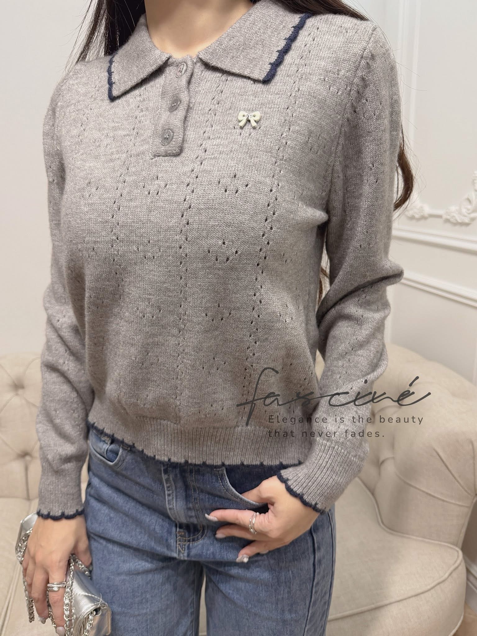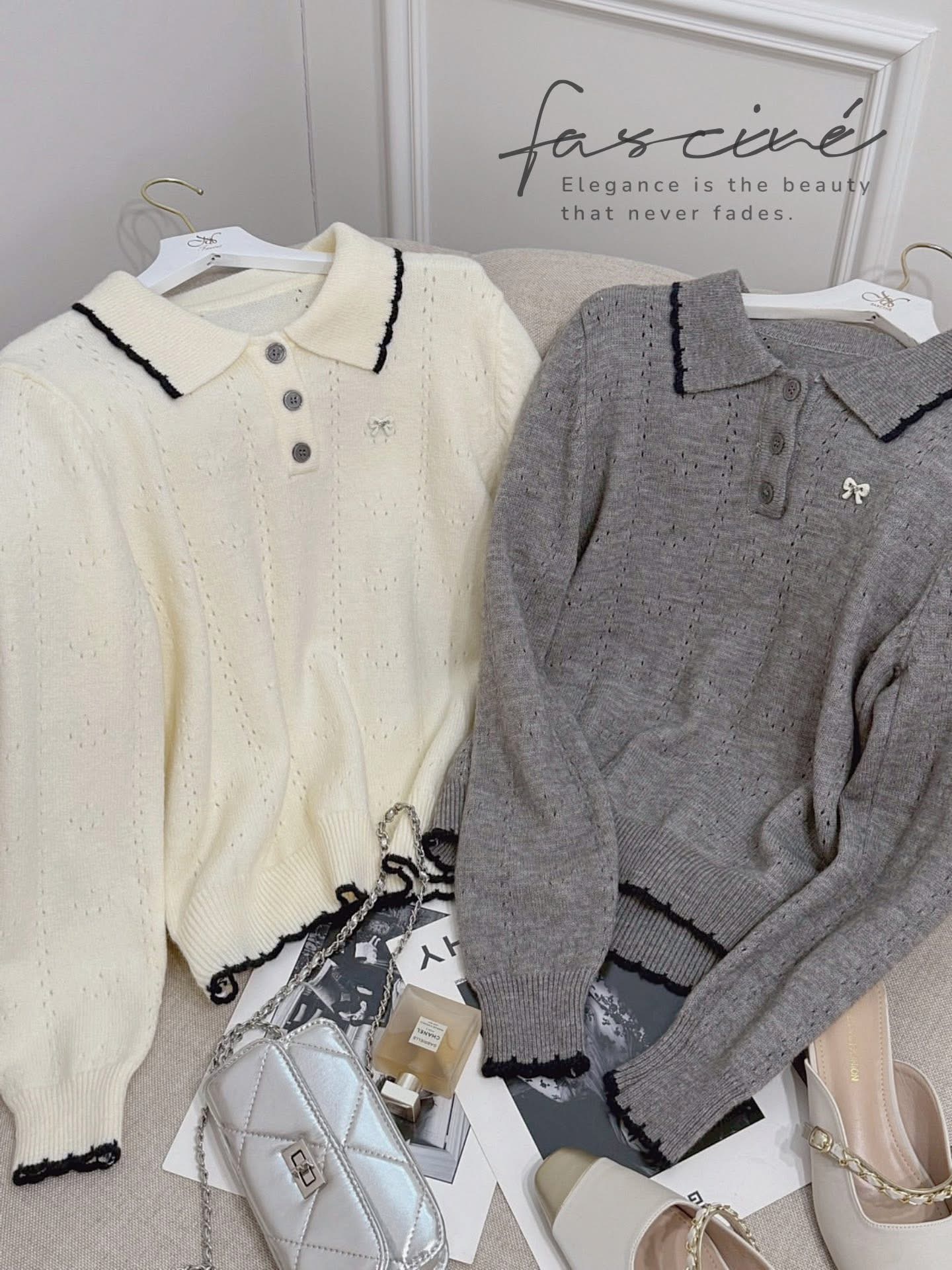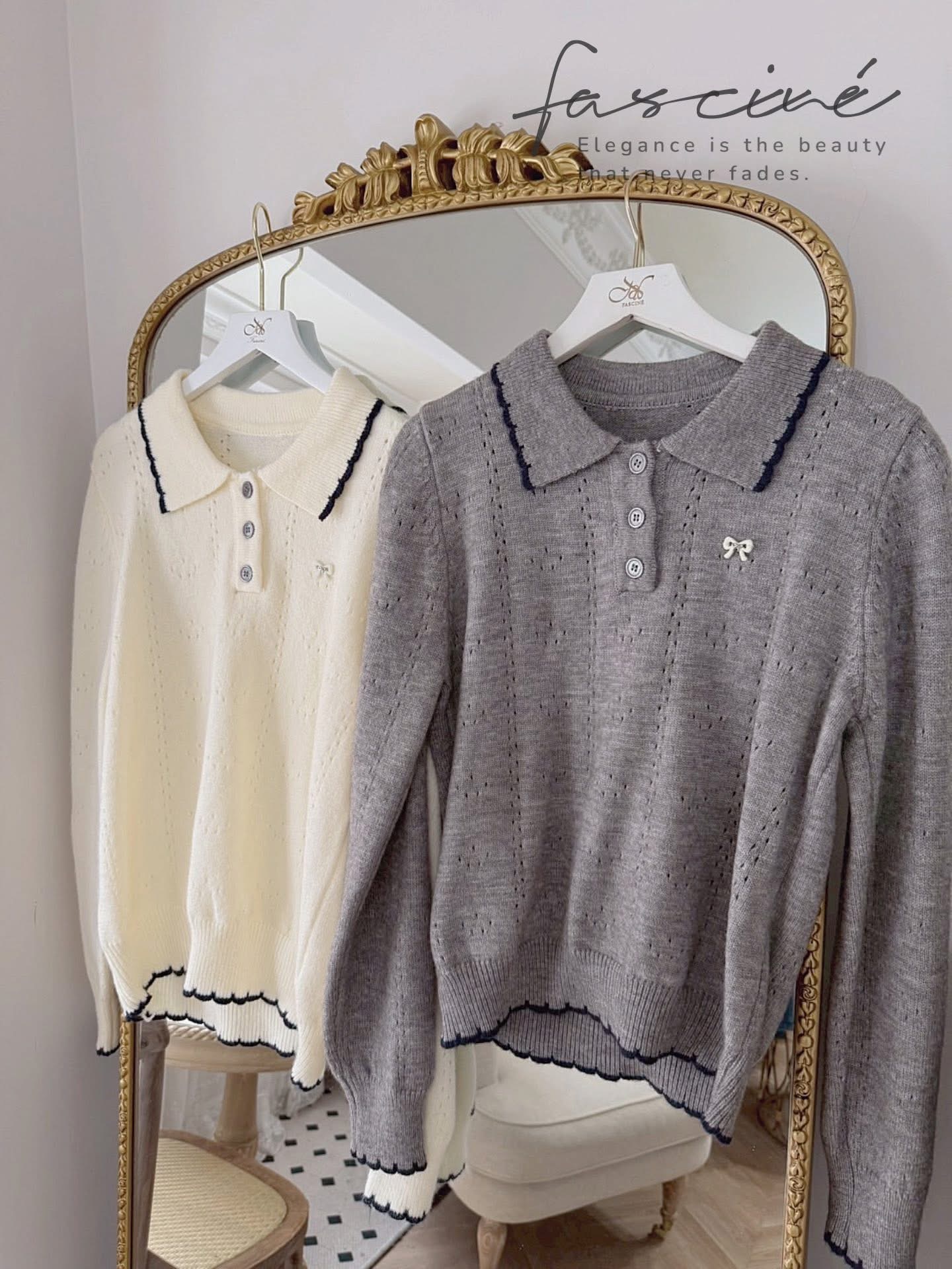 (10T62-25B) 法式鏤空提花蝴蝶結針織polo領寬鬆拼色上衣 $490