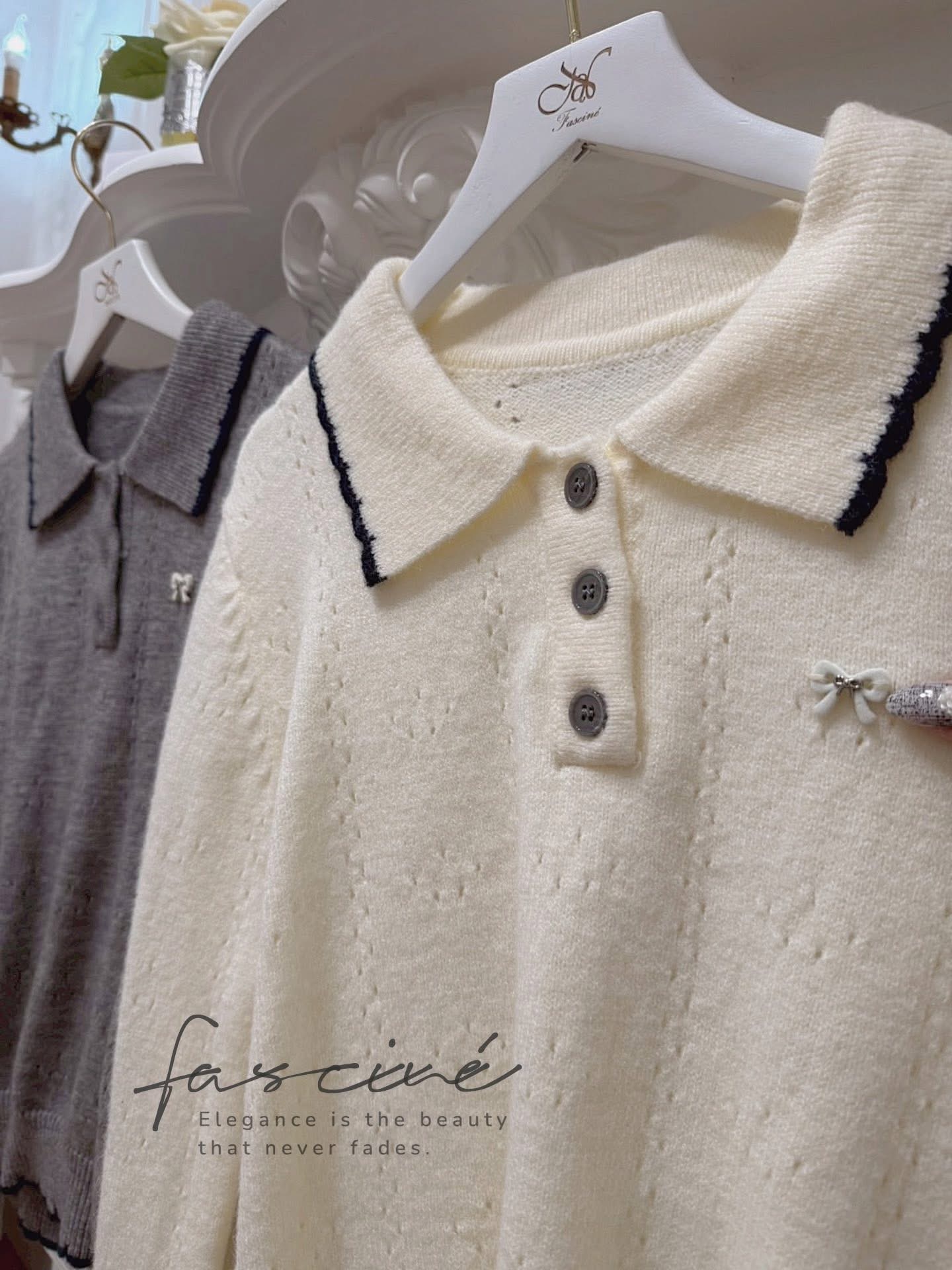 (10T62-25B) 法式鏤空提花蝴蝶結針織polo領寬鬆拼色上衣